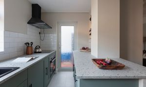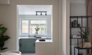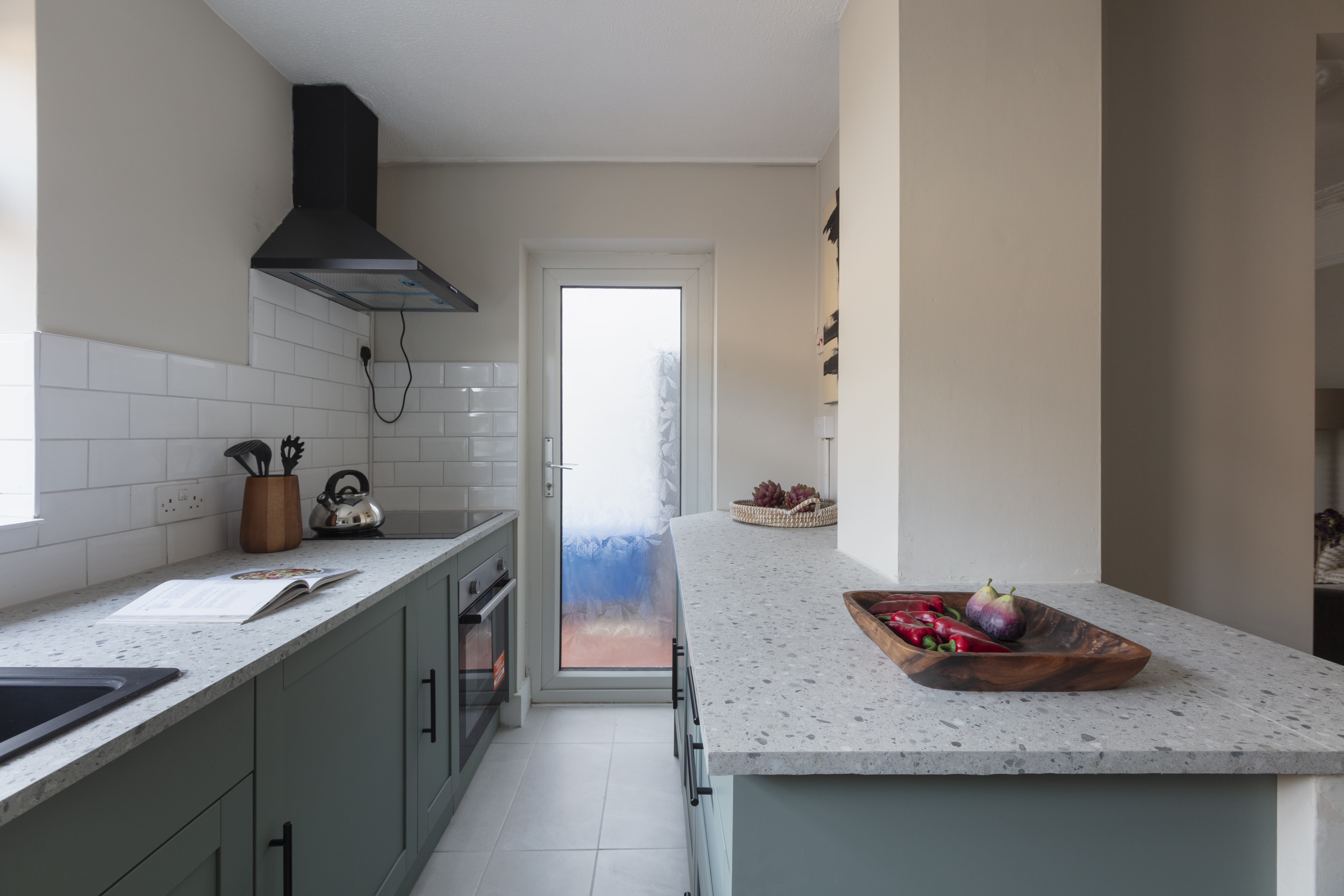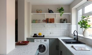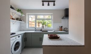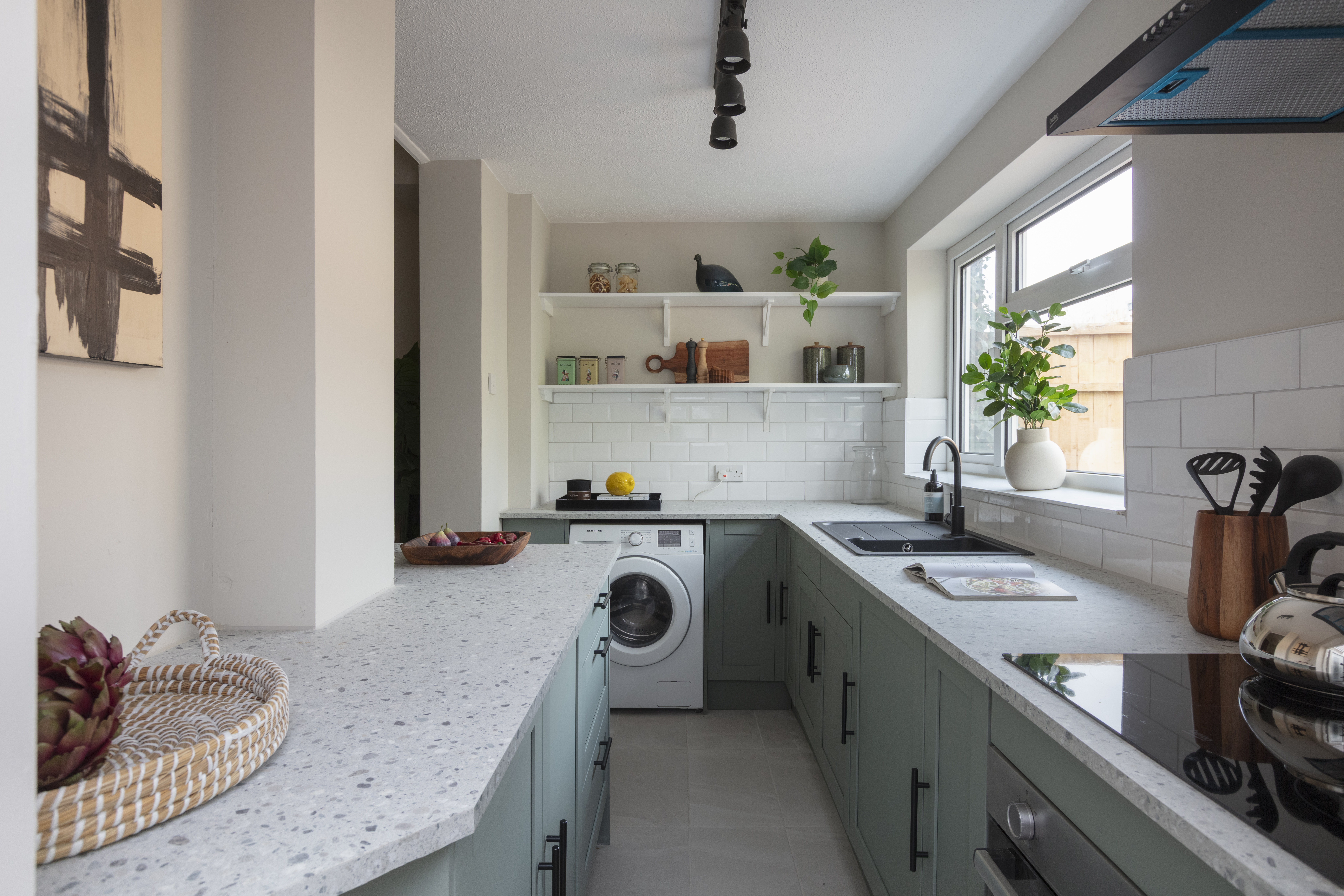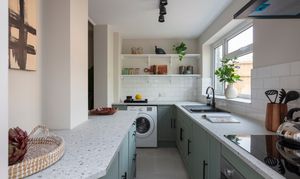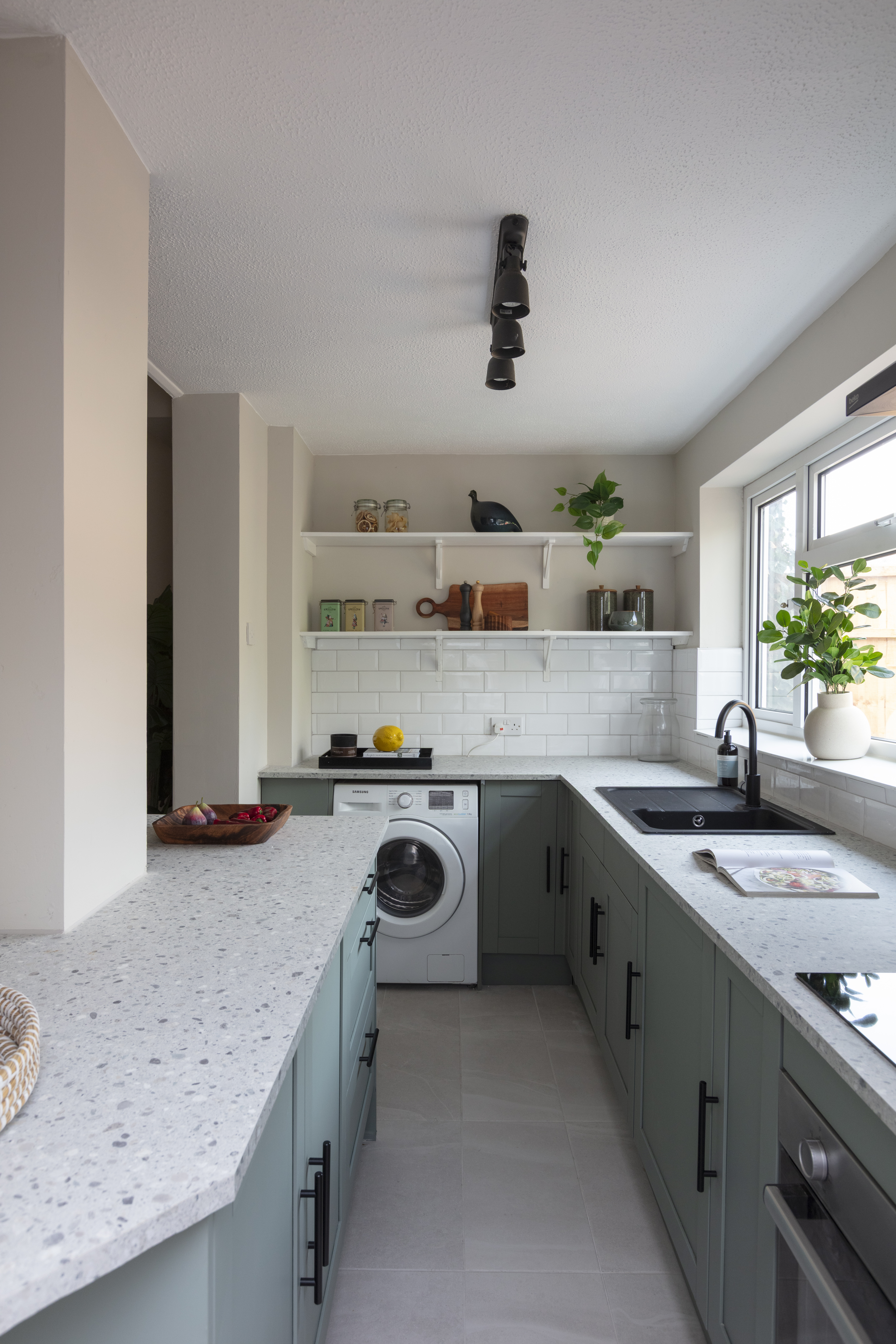 Newly fitted in February this year, the kitchen features modern sage green shaker-style doors with black handles, topped with a pale terrazzo-style work surface and a white metro-tiled splashback. The floor is tiled in grey; a composite sink and drainer with black mixer tap sits beneath a triple window to the garden; and white timber open shelving provides space for extra storage and display.