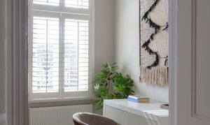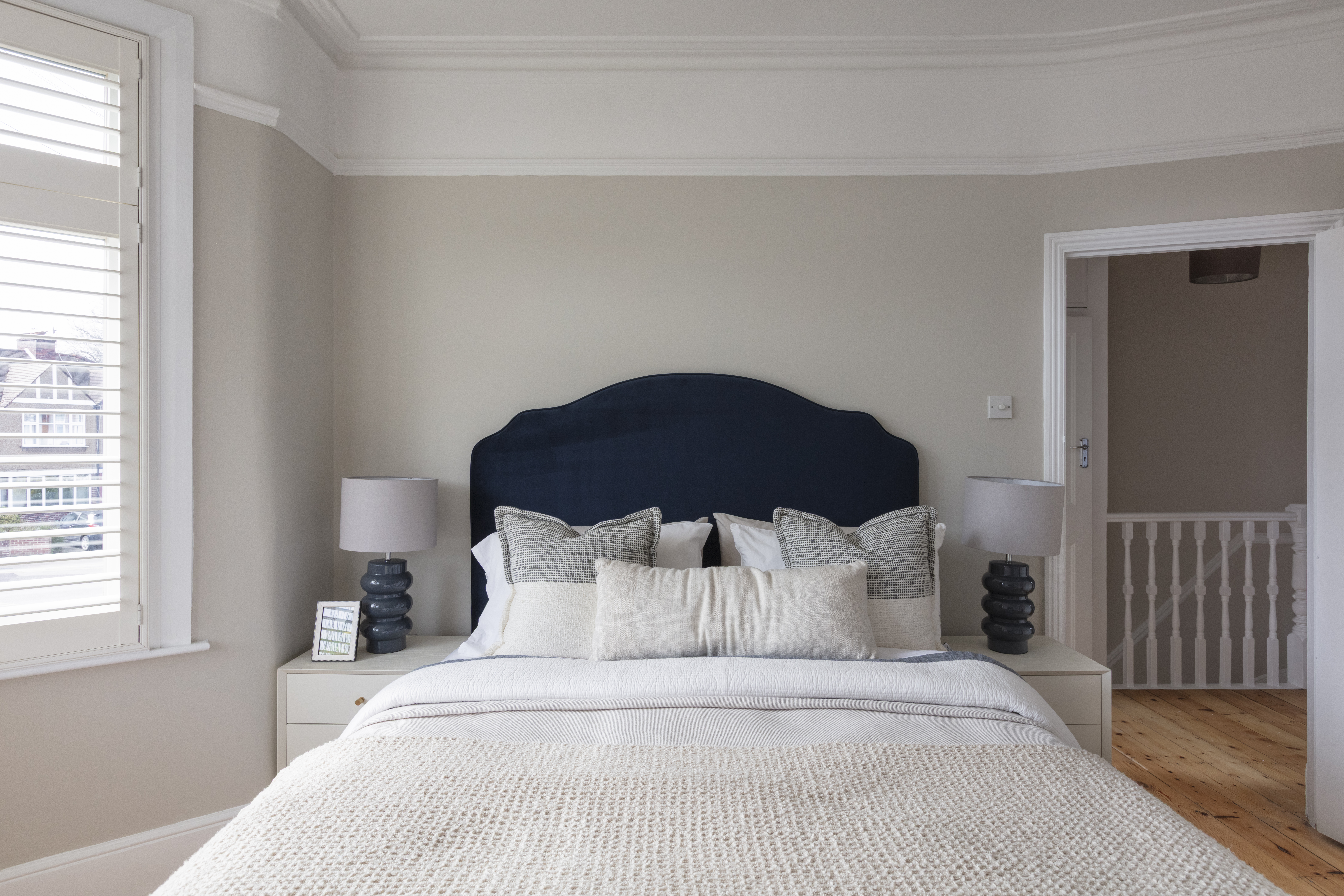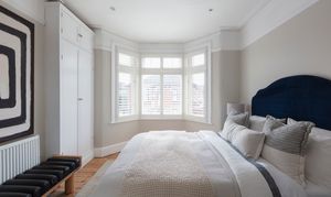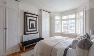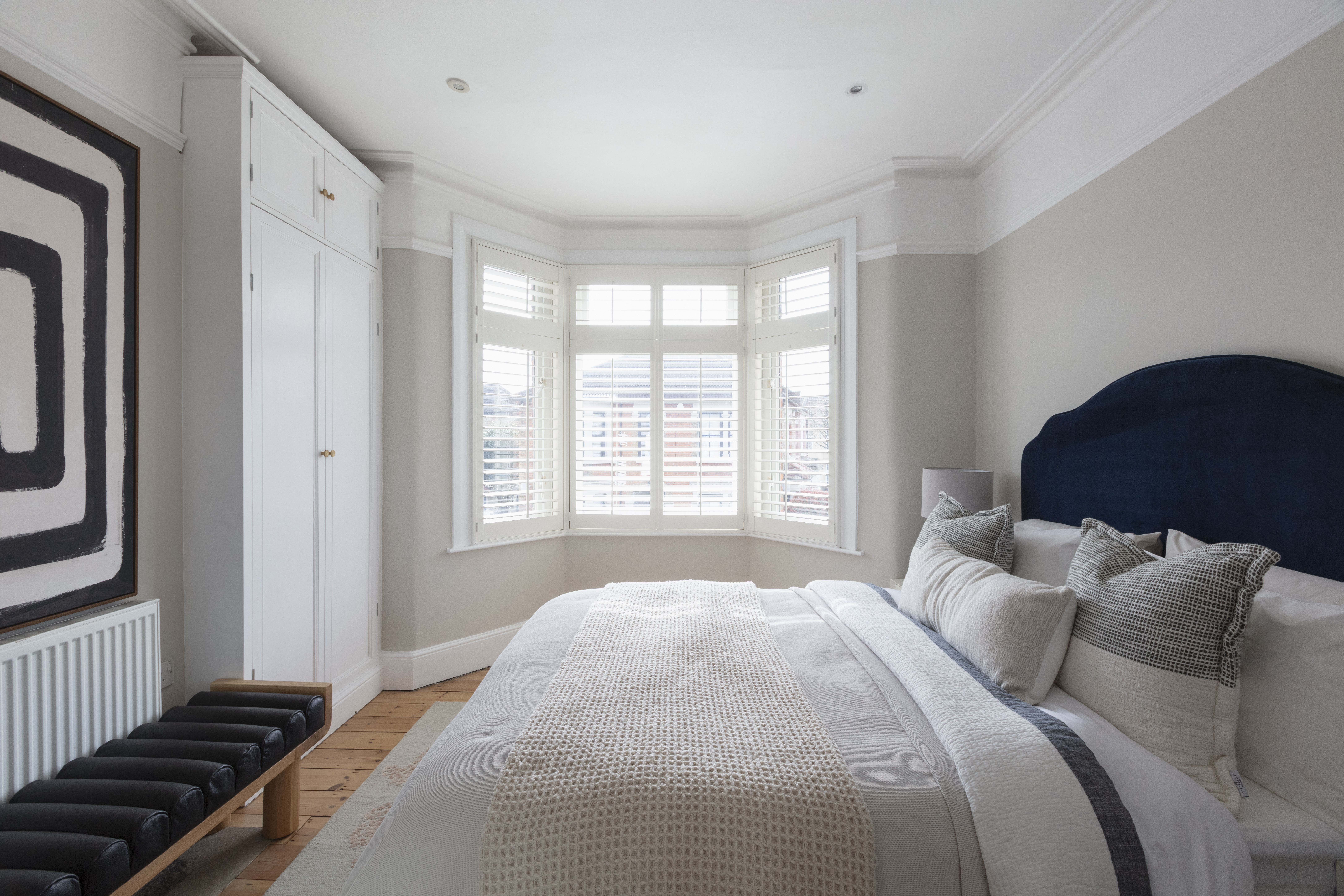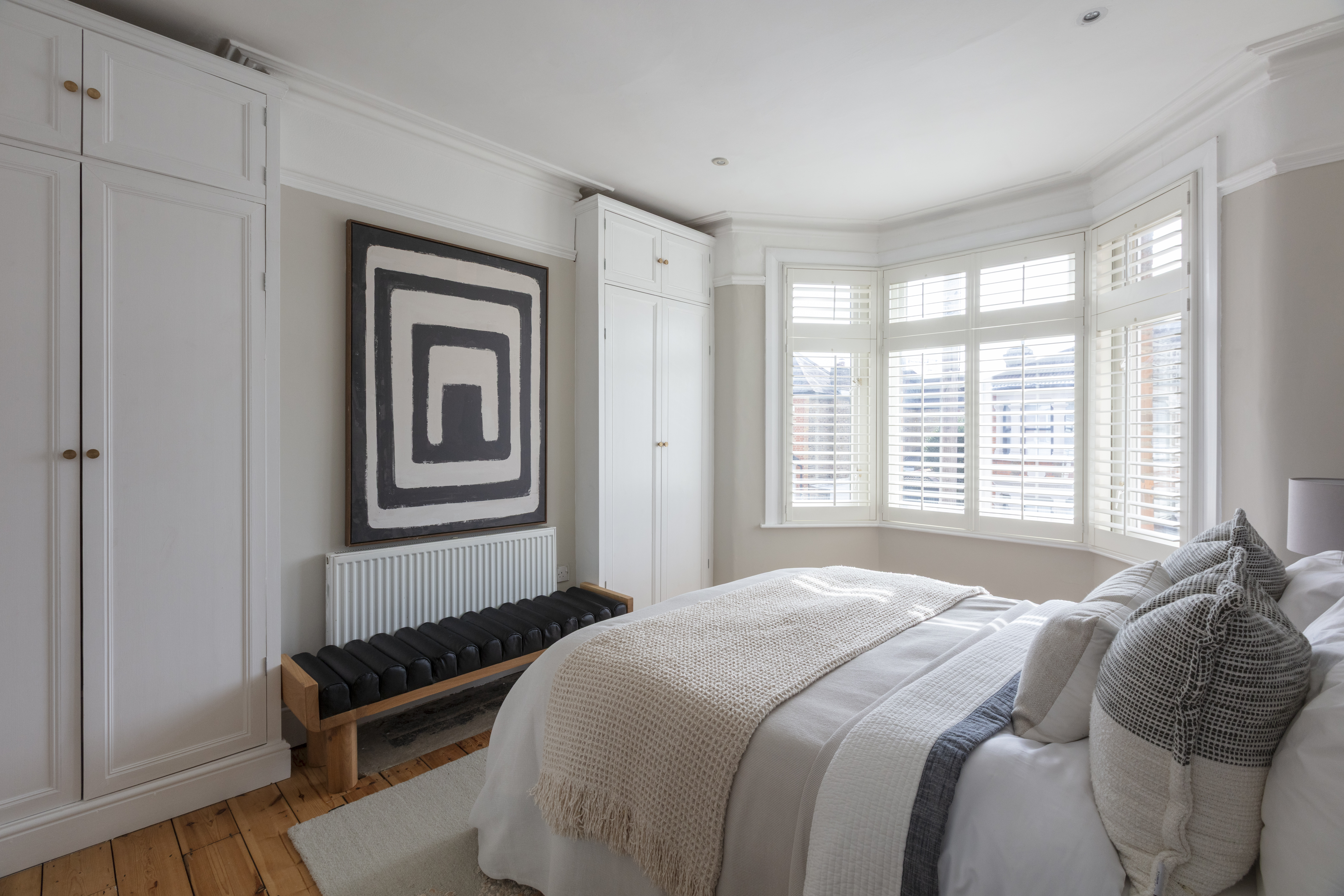 The three bedrooms on this floor all share a similarly restful décor scheme, with sanded, restored floorboards, neutral walls, modern radiators and full-height louvred shutters to the windows.