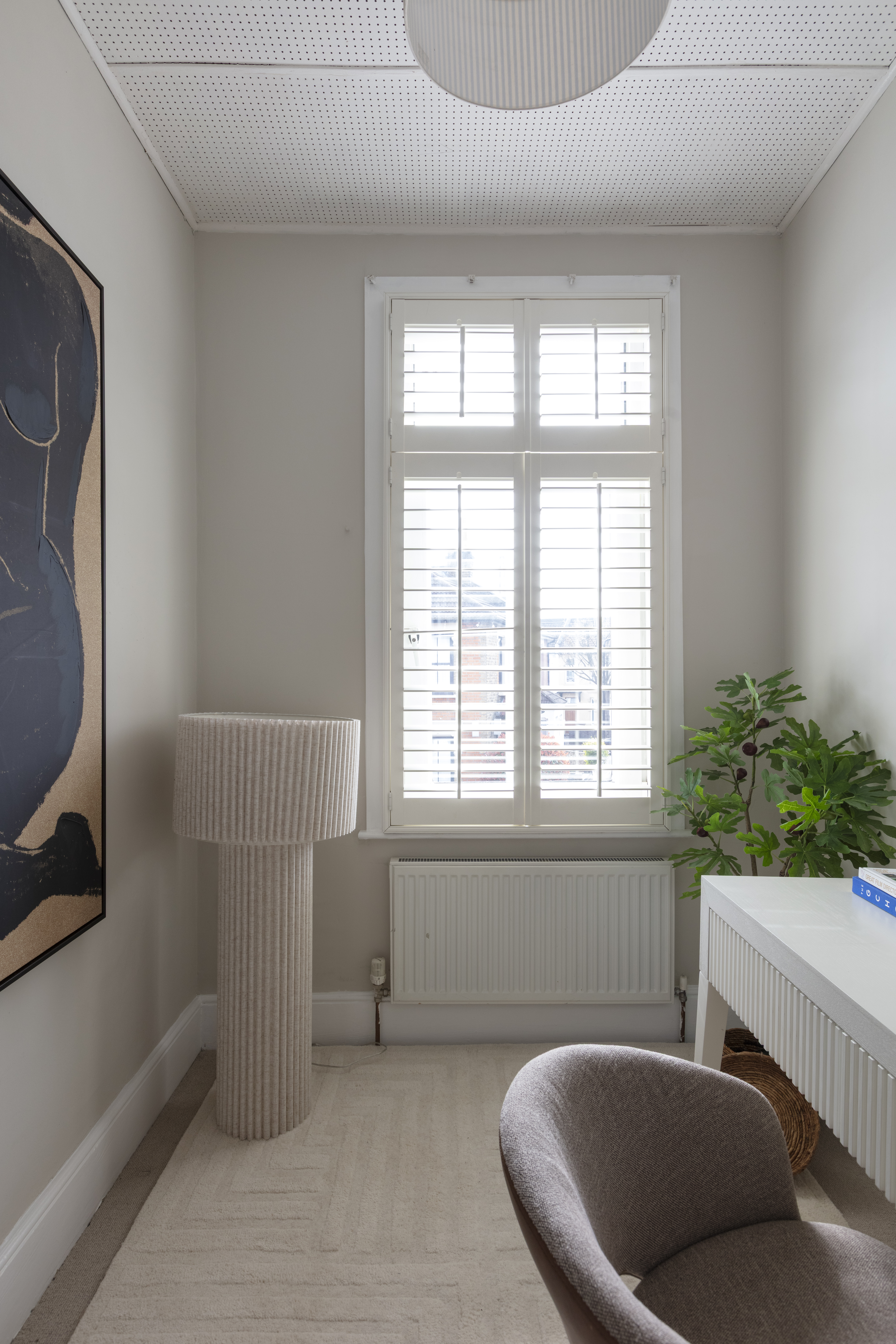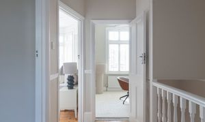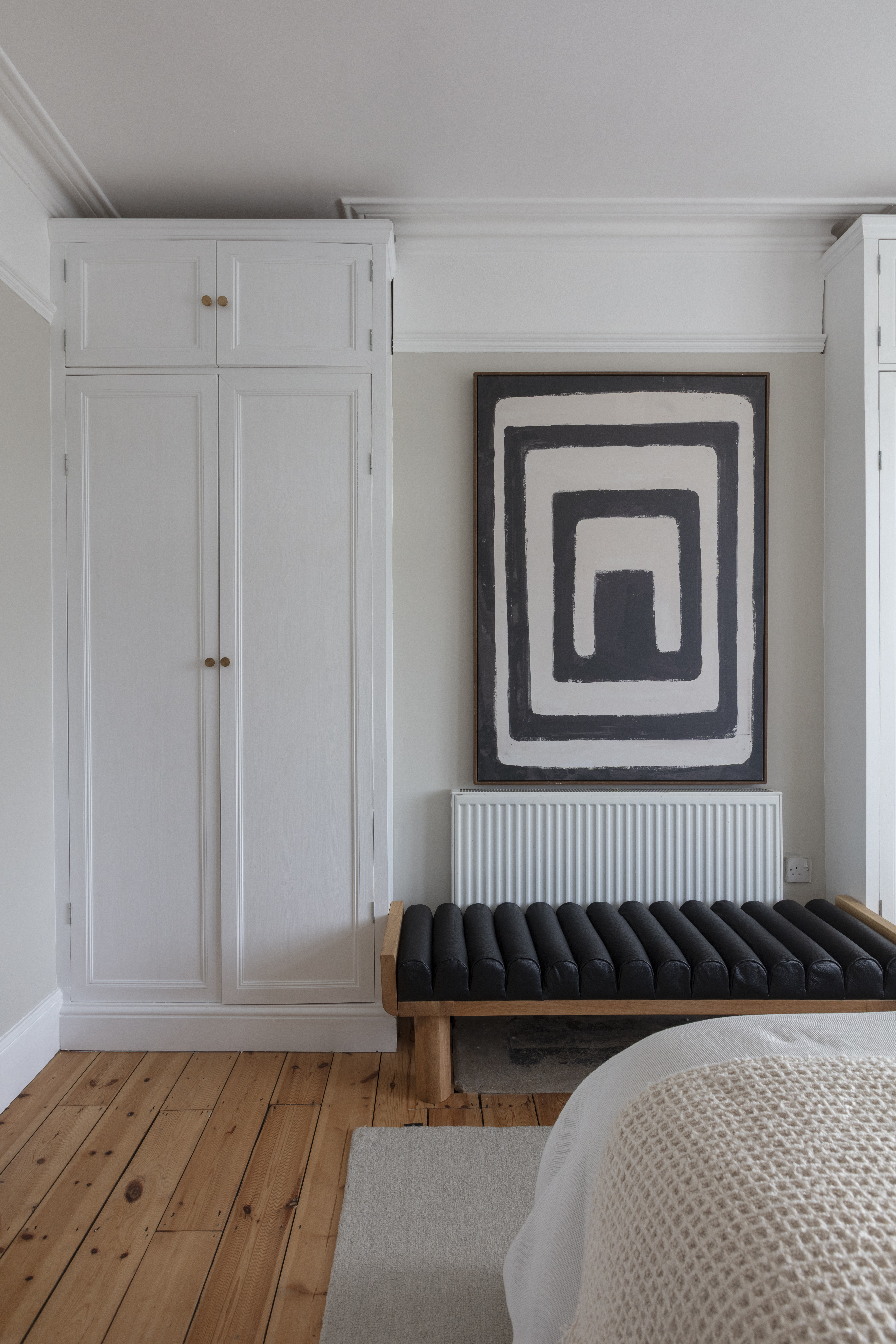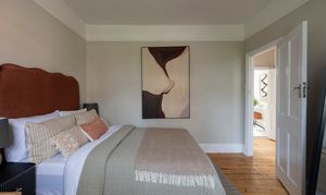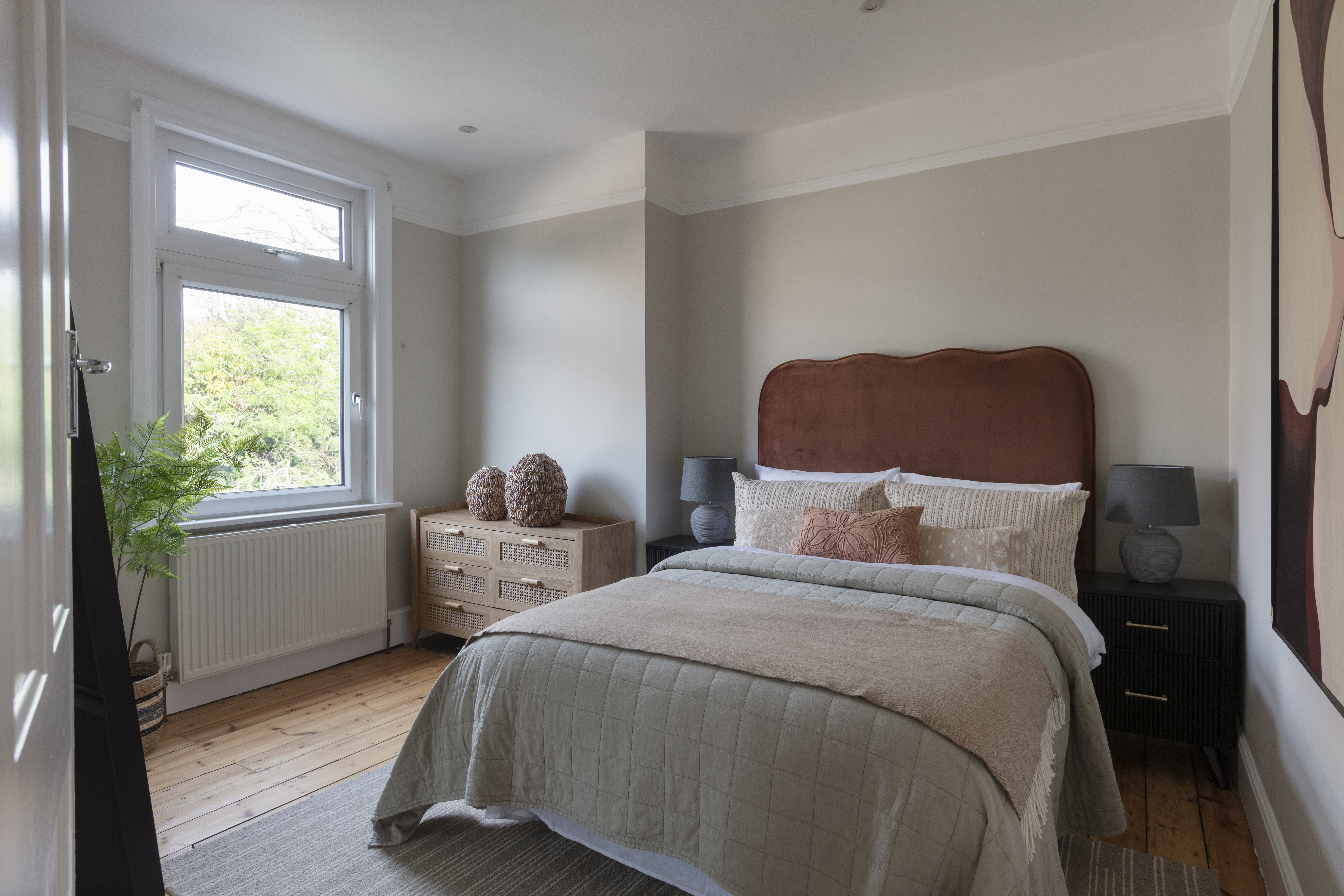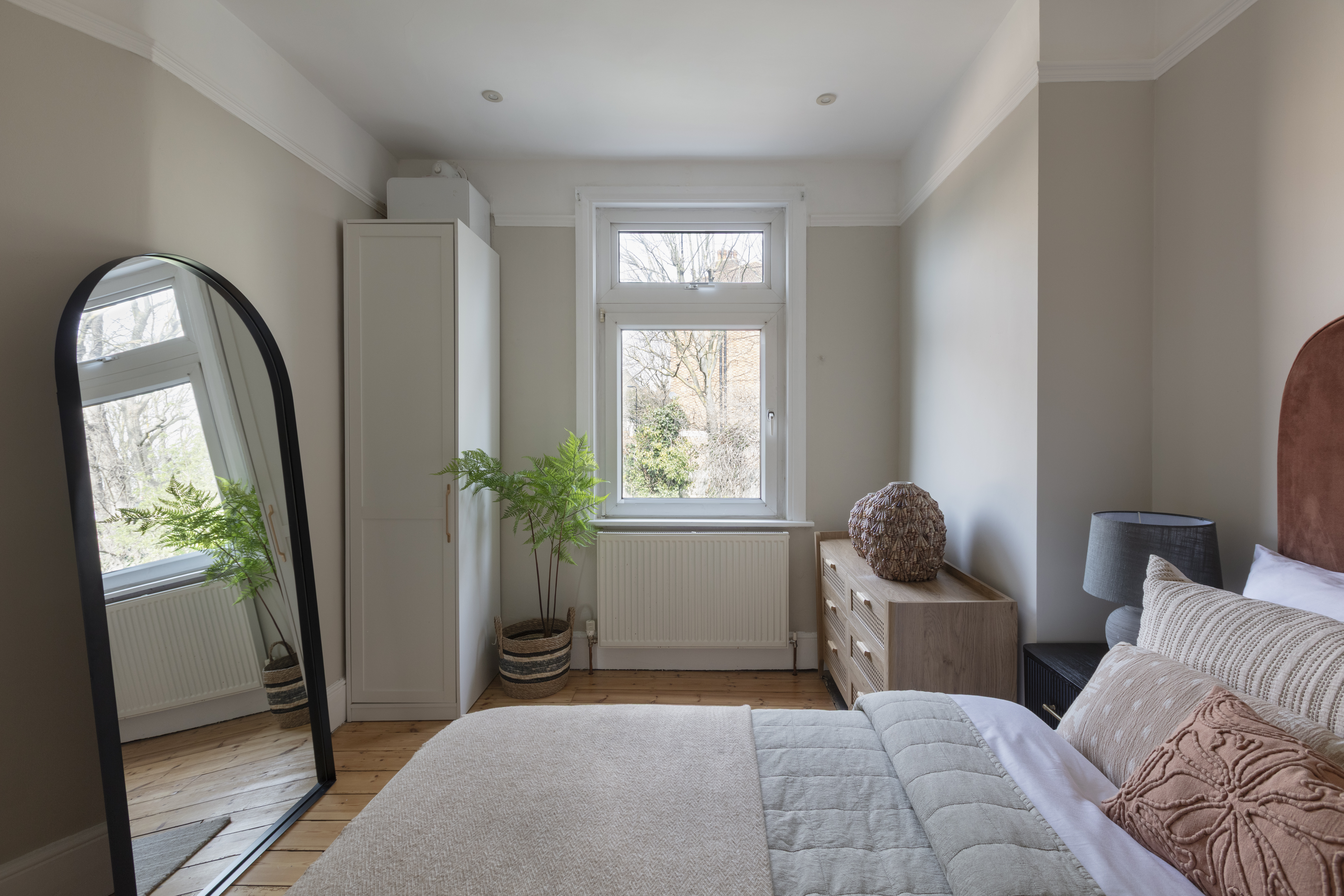 The three bedrooms on this floor all share a similarly restful décor scheme, with sanded, restored floorboards, neutral walls, modern radiators and full-height louvred shutters to the windows.