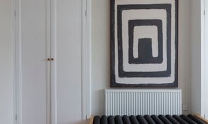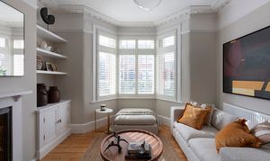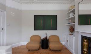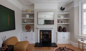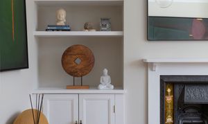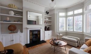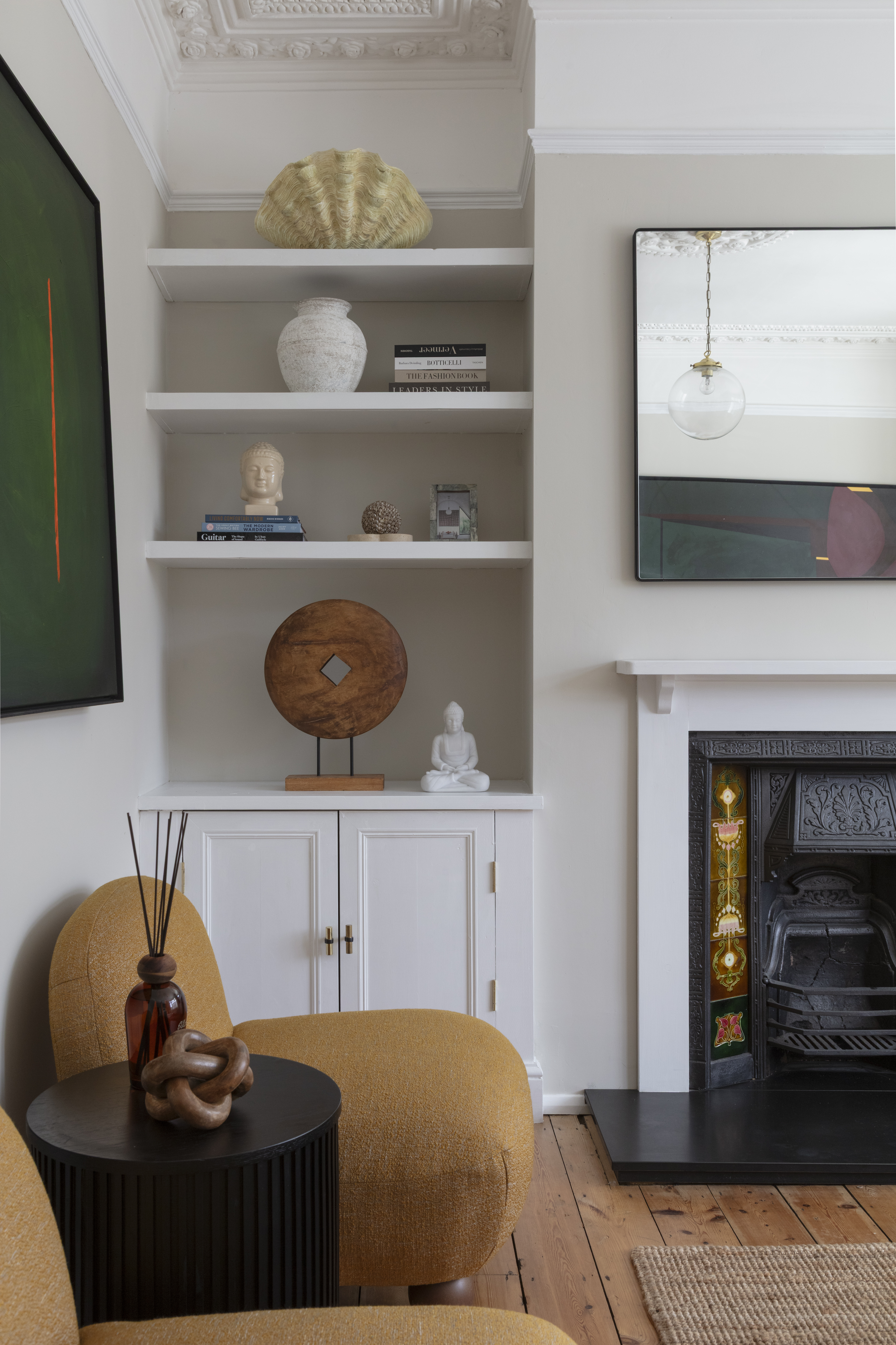 Lovely proportions and a fabulously ornate coved ceiling with a matching rose and a glass globe pendant give this sunny space a restful feel. It’s bathed in light from the tall bay, fitted with full-height louvred shutters. There’s a modern radiator, while bespoke cabinets and shelves fill the alcoves on either side of a restored cast-iron fireplace with a timber surround, Art Nouveau floral tiles and a black stone hearth.