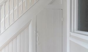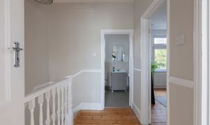 Take the white-painted staircase with a neutral wool runner to the first floor. On the landing, you’ll find a roomy over-stairs cupboard, while a loft hatch opens to a partially boarded loft, great for long-term storage or conversion in the future, subject to the usual planning permissions.