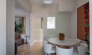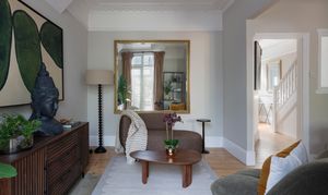 The wide, welcoming hallway sets the tone for the rest of the house, with neutral cashmere-coloured walls (seen throughout) rising to an intricately coved ceiling with a rose and pendant. Underfoot, sanded, restored floorboards flow through a four-panelled door into the living room on your right.