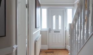 Set on a friendly, tree-lined residential street, the house sits behind a wall topped with pretty, variegated ivy, and greets you with a gabled, brick exterior with white-painted lintels to the bay windows. A traditional black-and-terracotta chequered tile path leads past the stoned front garden, to a pretty porch and a four-panelled white front door.