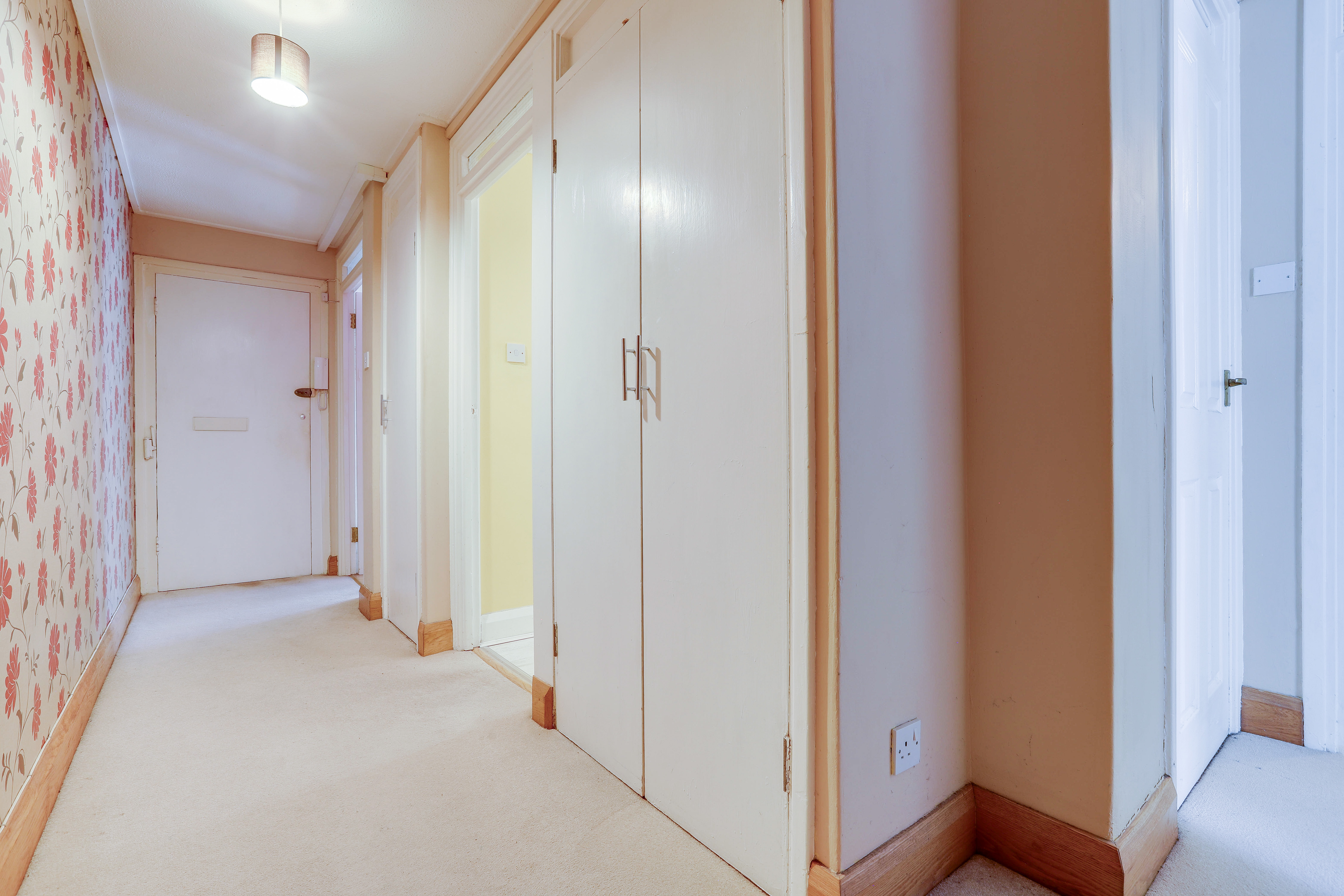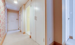 The entrance hall has carpeted flooring, three in-built cupboards, a wall-mounted secure telephone entry system, coving to the ceiling, a radiator, and a door providing access into the accommodation.