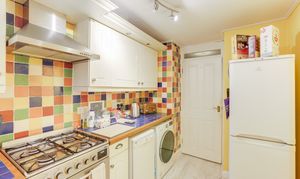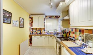 The kitchen has s range of fitted base and wall units with tiled worktops, a stainless steel circular sink and drainer with a swan neck mixer tap, space for a freestanding cooker, an extractor fan, space and plumbing for a washing machine and dishwasher, space for a fridge freezer, coving to the ceiling, a radiator, tiled splashback, wood-effect flooring, and a UPVC double glazed window.