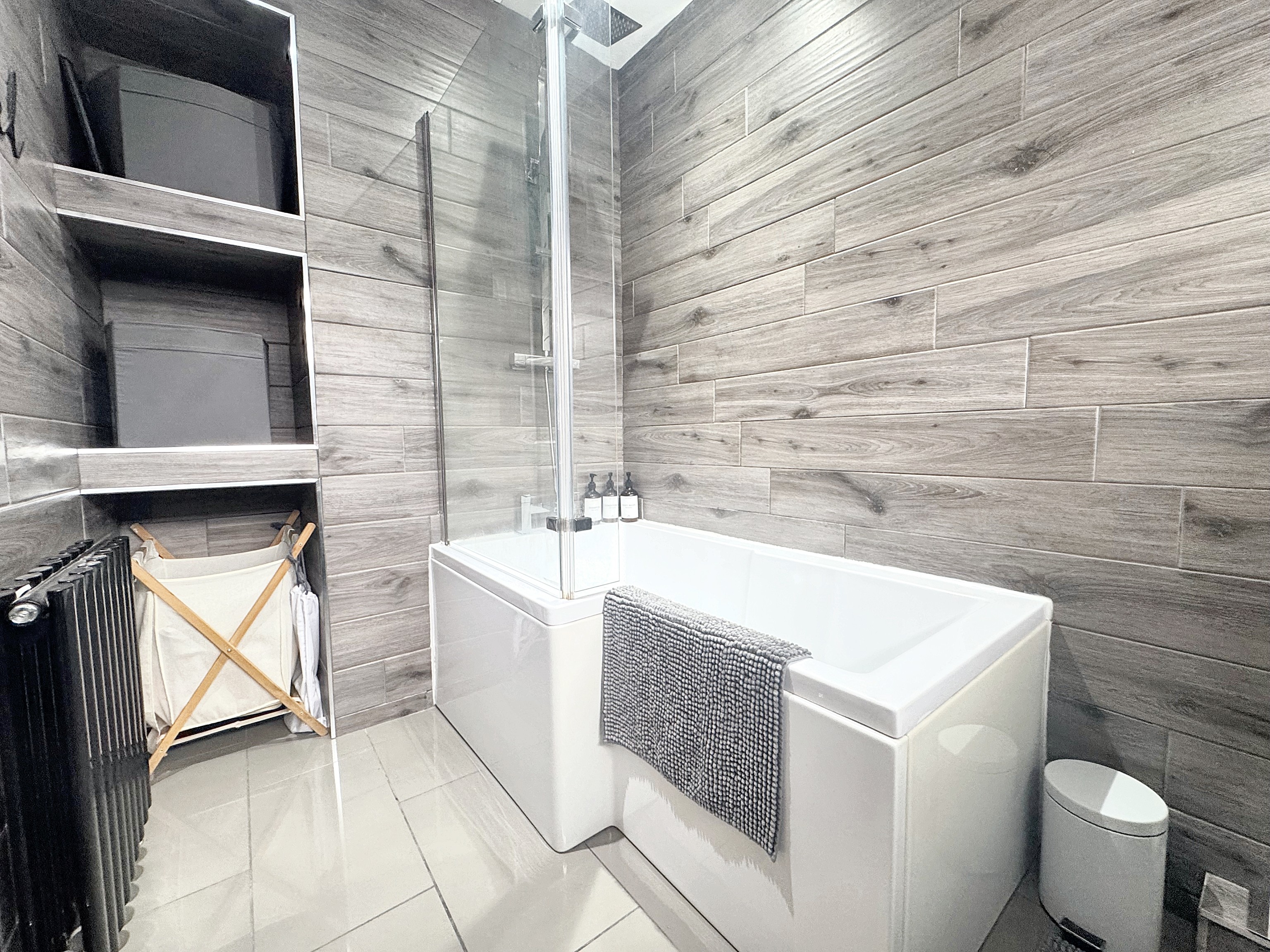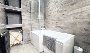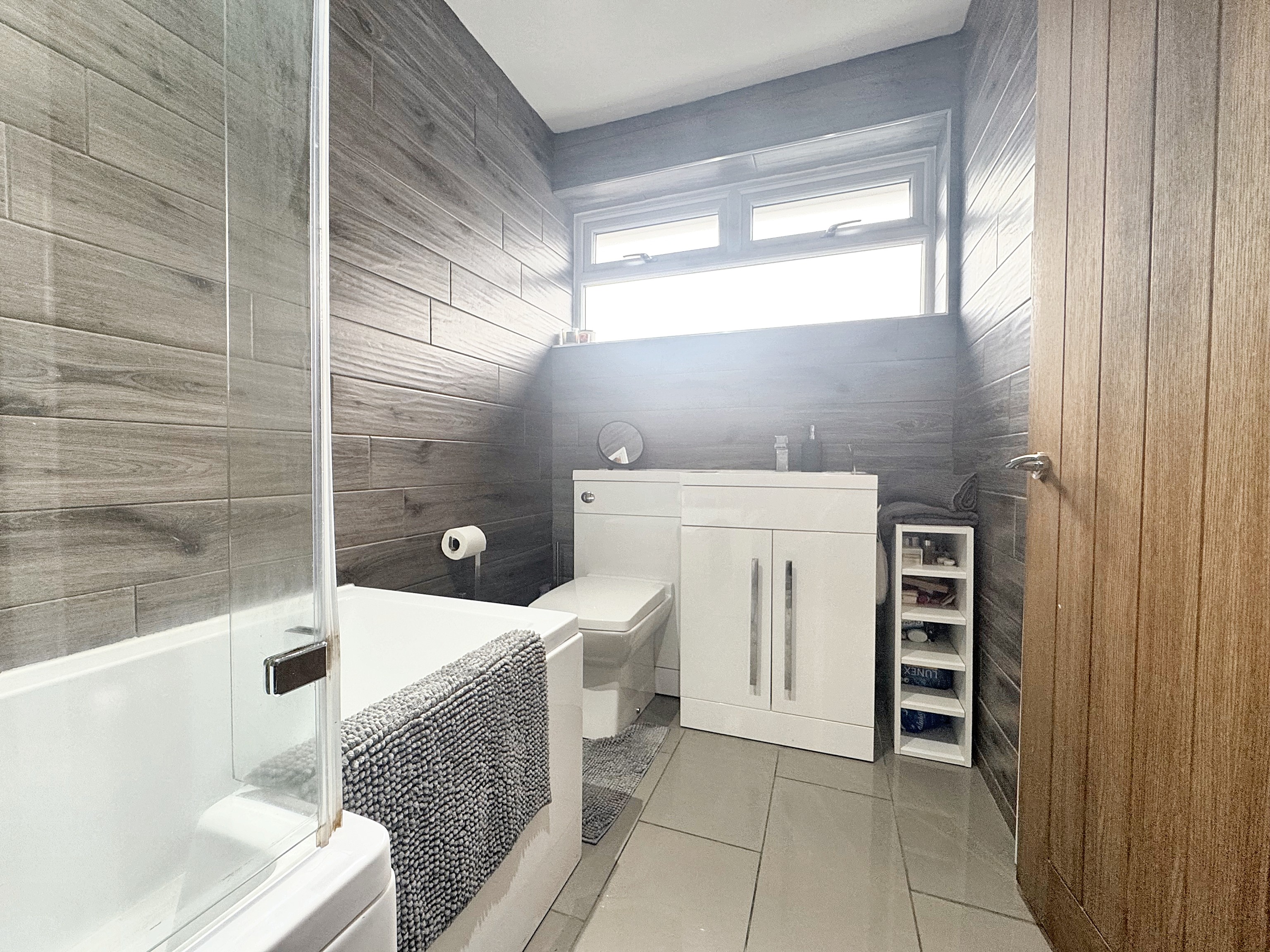 Window to the side elevation. Modern fitted bathroom suite with shower over bath tub, low level W.C and wash basin with storage cupboard. Fitted shelving offers extra storage space,