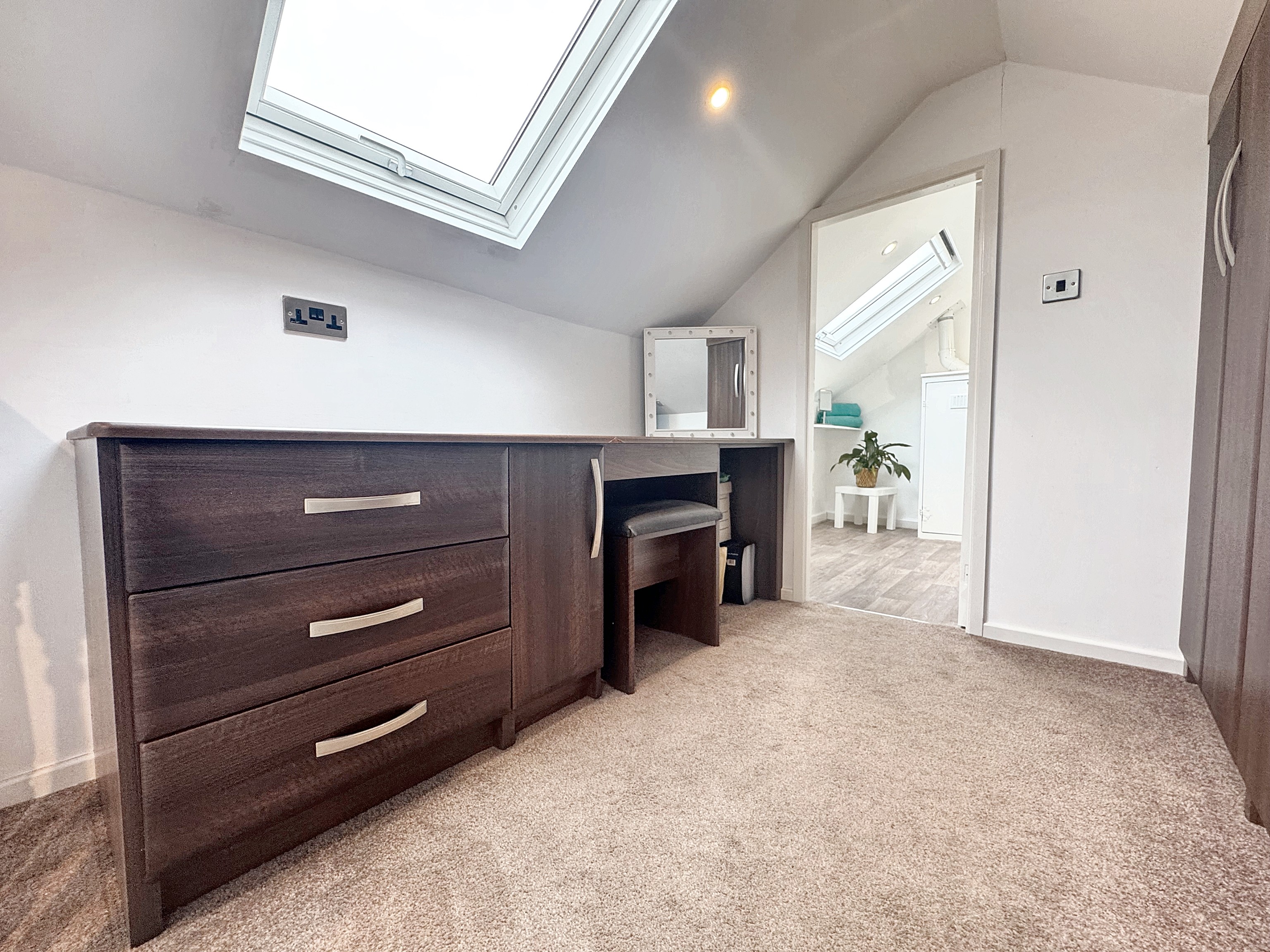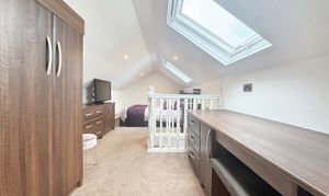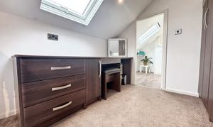 Dual velux windows offering an ambulance of light. Currently used as a guest bedroom with dressing area including fitted wardrobes, drawers and a dressing table. Internal door through to:
