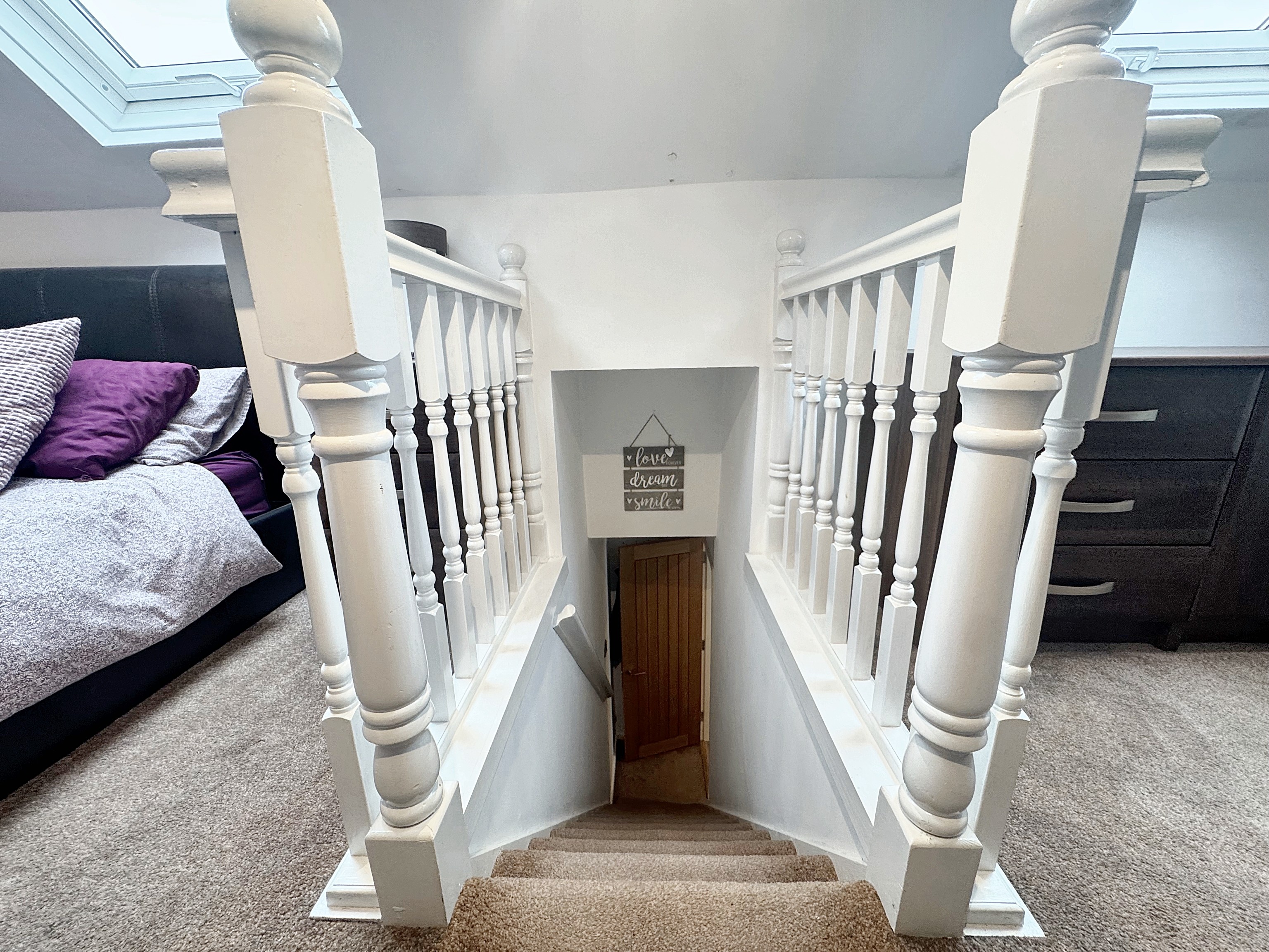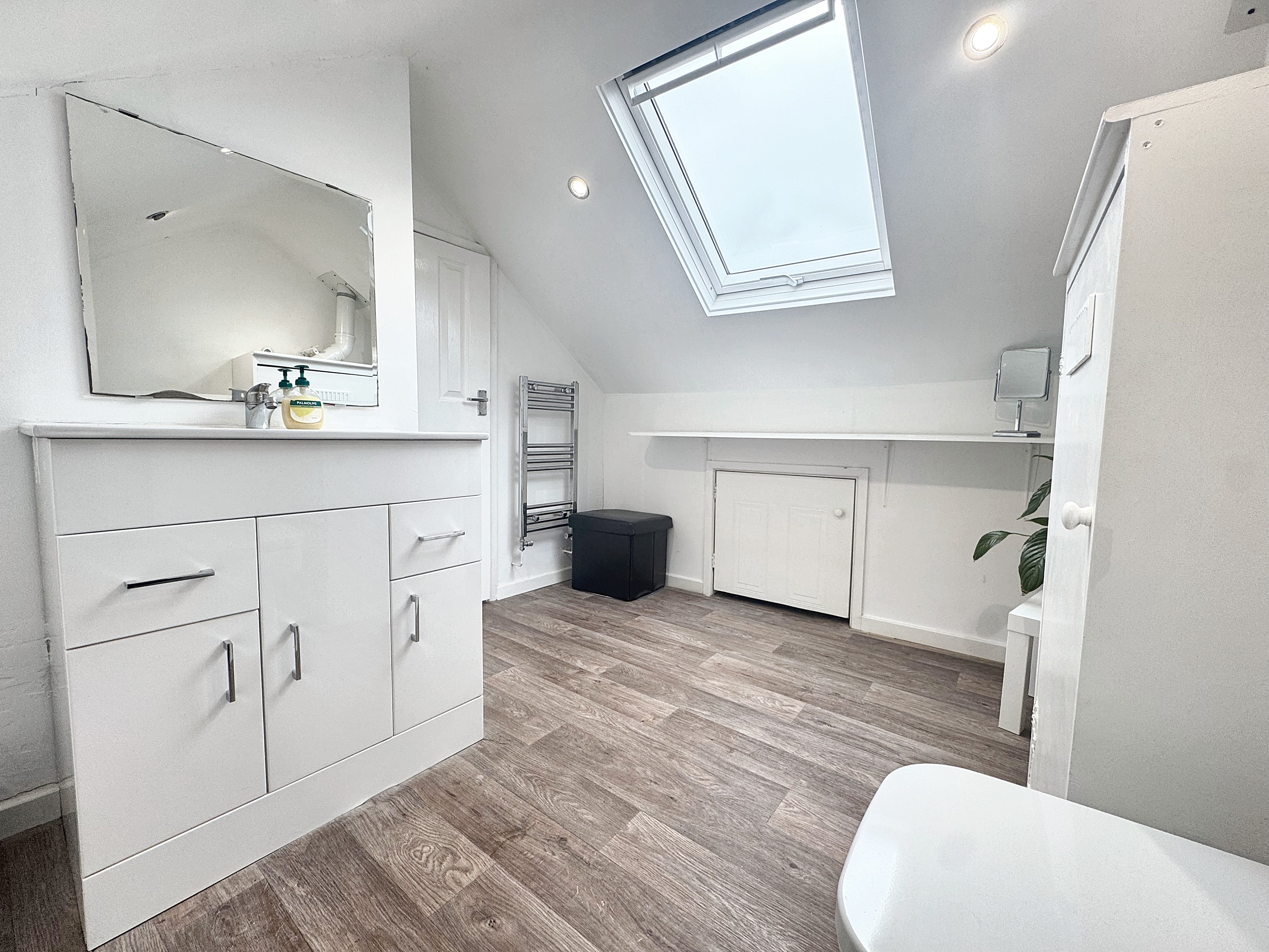Velux window. Spacious guest W.C and wash basin. The Combi boiler is housed in a cupboard. Access to additional storage in the eaves.