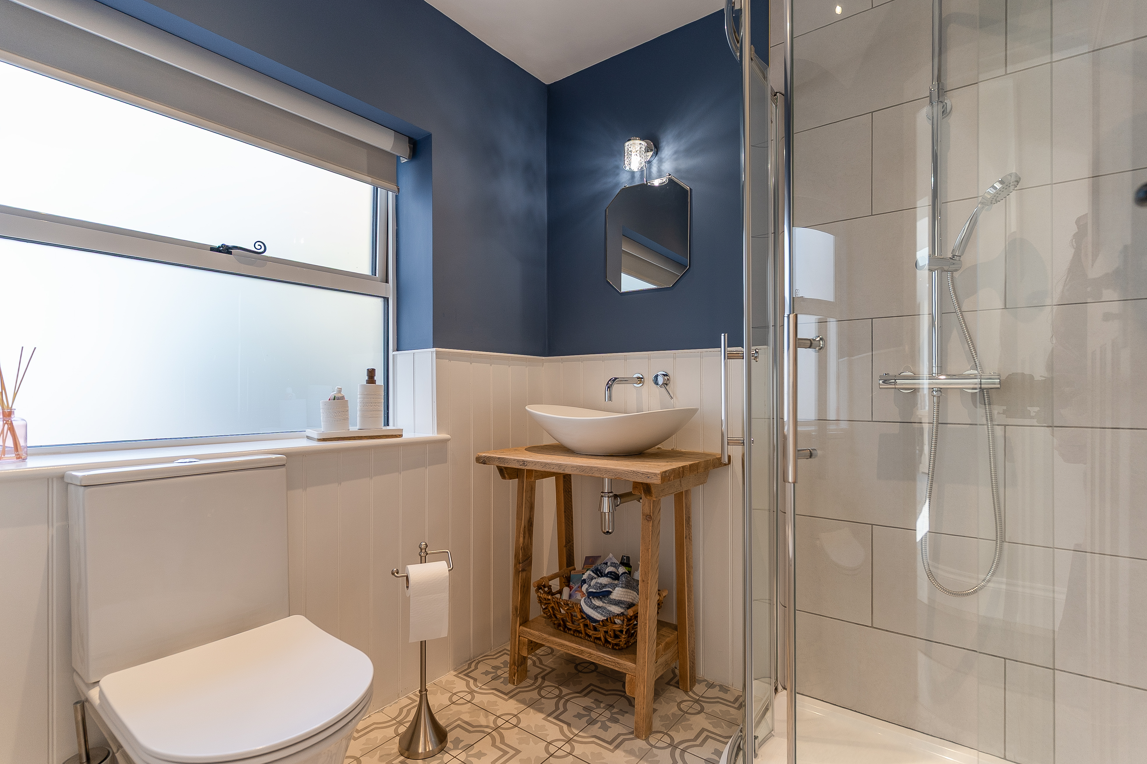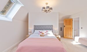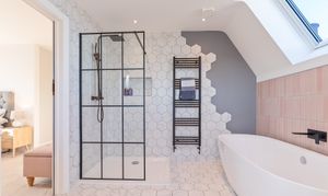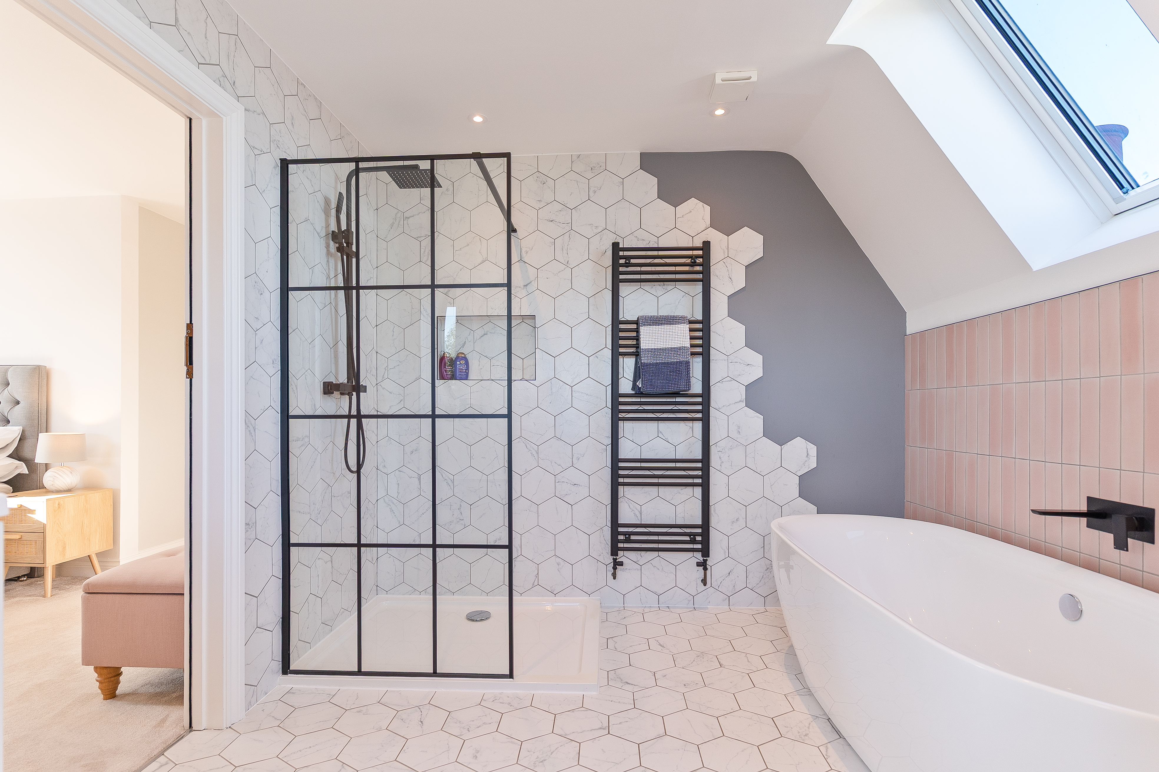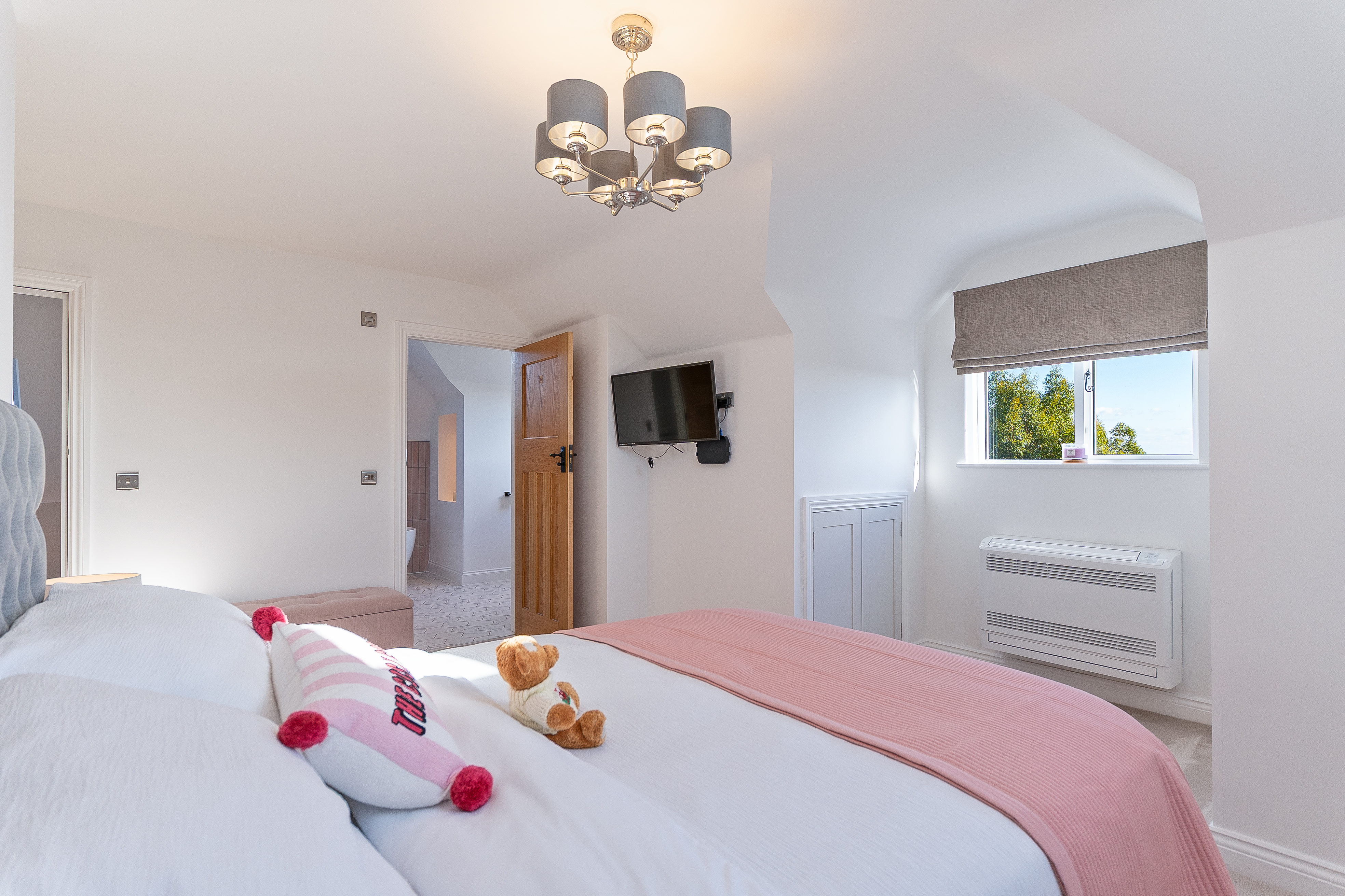 On the first floor, three beautifully appointed bedrooms are complemented by a statement family bathroom. Two of the rooms are generous doubles, one with bespoke built-in wardrobes, while the third offers versatility as either a bedroom or study. The bathroom exudes luxury, with a freestanding bath, walk-in shower, double vanity unit and feature panelling, offering the feel of a boutique hotel.