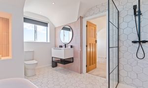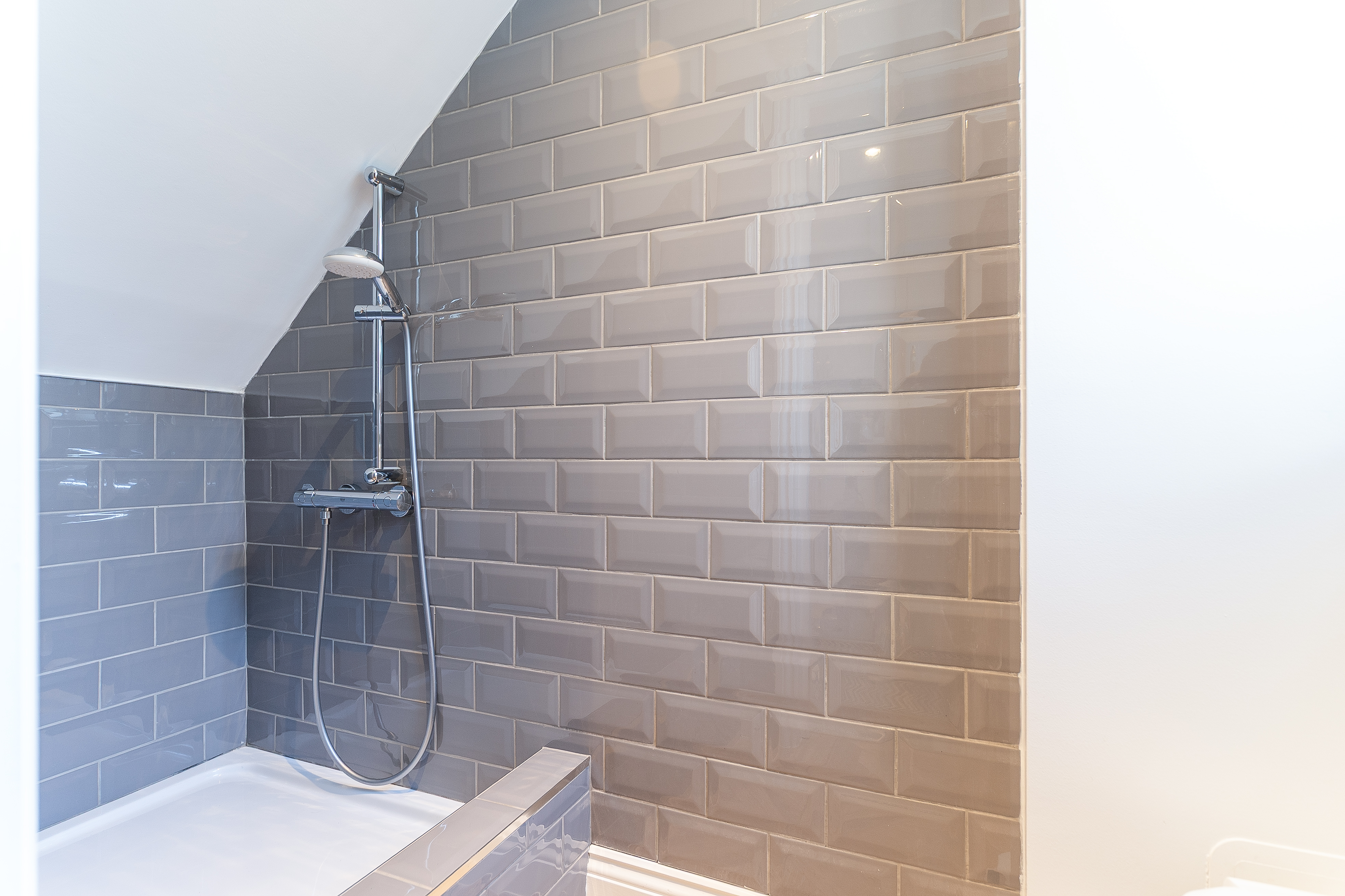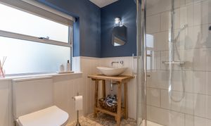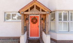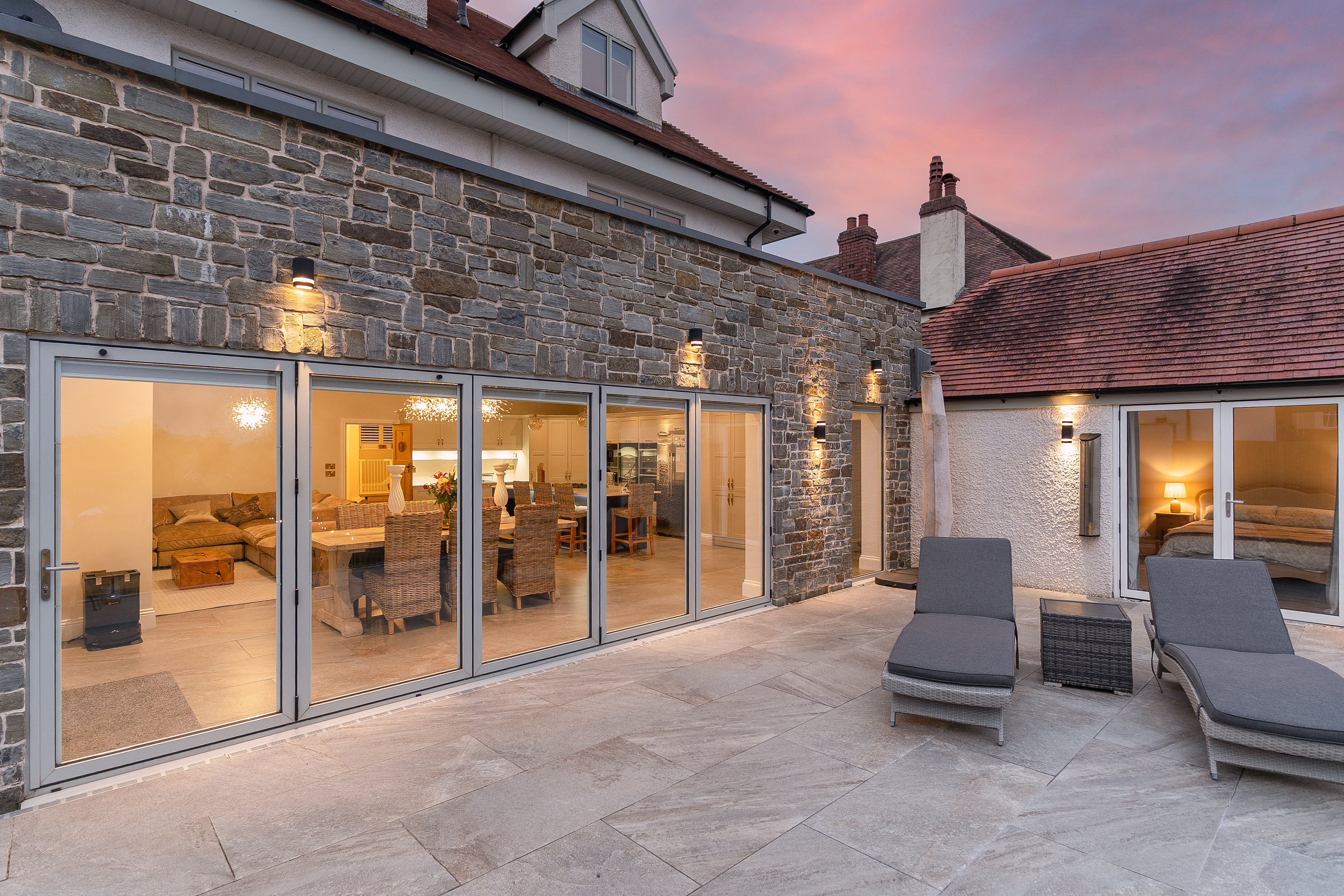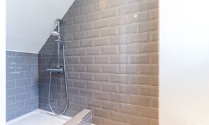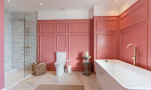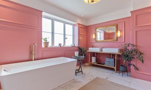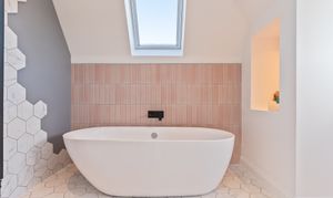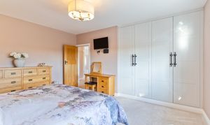 On the first floor, three beautifully appointed bedrooms are complemented by a statement family bathroom. Two of the rooms are generous doubles, one with bespoke built-in wardrobes, while the third offers versatility as either a bedroom or study. The bathroom exudes luxury, with a freestanding bath, walk-in shower, double vanity unit and feature panelling, offering the feel of a boutique hotel.