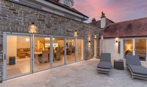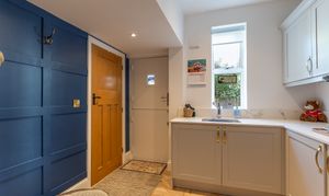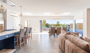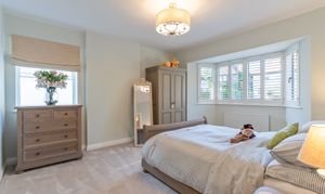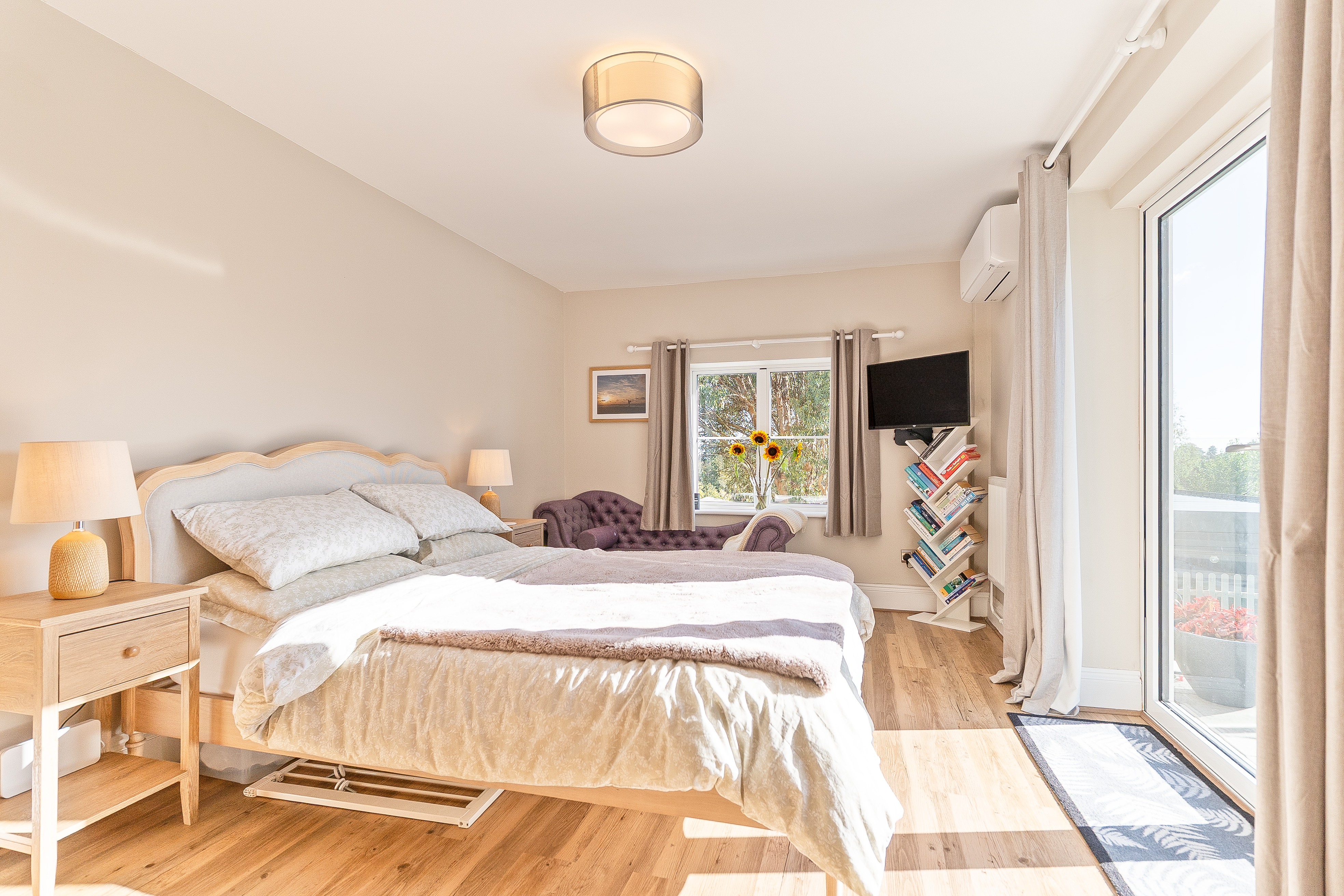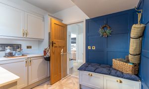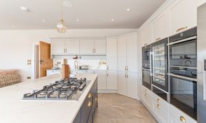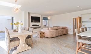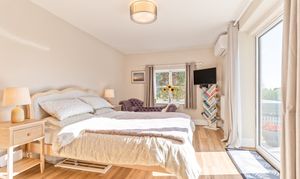 The ground floor immediately sets the tone for the sophistication found throughout the home. The central hallway flows into the heart of the property – a striking open-plan kitchen, dining and family room. Bathed in natural light from full-width bi-fold doors, this space is designed with modern living in mind, featuring an extensive range of bespoke cabinetry, a central island, and premium integrated appliances. Its spacious layout creates the ideal environment for both everyday living and large-scale entertaining, enhanced further by air conditioning for year-round comfort. A formal sitting room with bay window provides an elegant retreat, while a substantial utility room, complete with its own external access and bespoke under-stairs dog shower, adds a thoughtful and practical touch. To the rear, a generously proportioned double bedroom with access to the balcony enjoys views over the garden and is served by a stylish shower room, perfect for guests or multigenerational living.