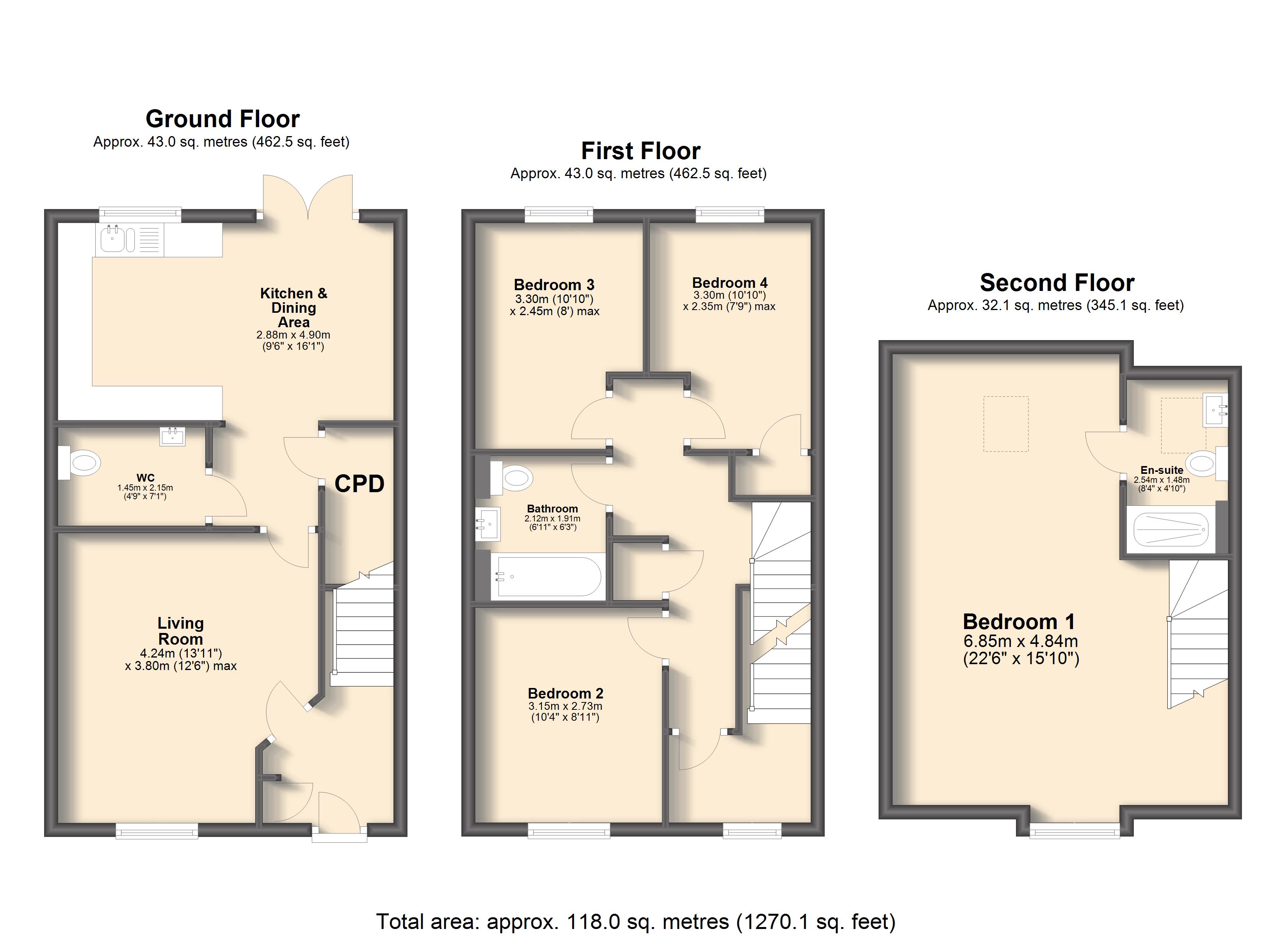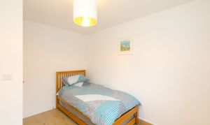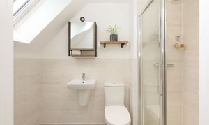 The four bedrooms are arranged across the first and second floors, providing excellent flexibility for families. The principal bedroom occupies the entire top floor, offering a peaceful retreat with its own contemporary en-suite shower room. The three remaining bedrooms, set across the first floor, are all well-appointed and provide plenty of space for children, guests or those working from home. A modern family bathroom, featuring a stylish three-piece suite, completes the first-floor layout.