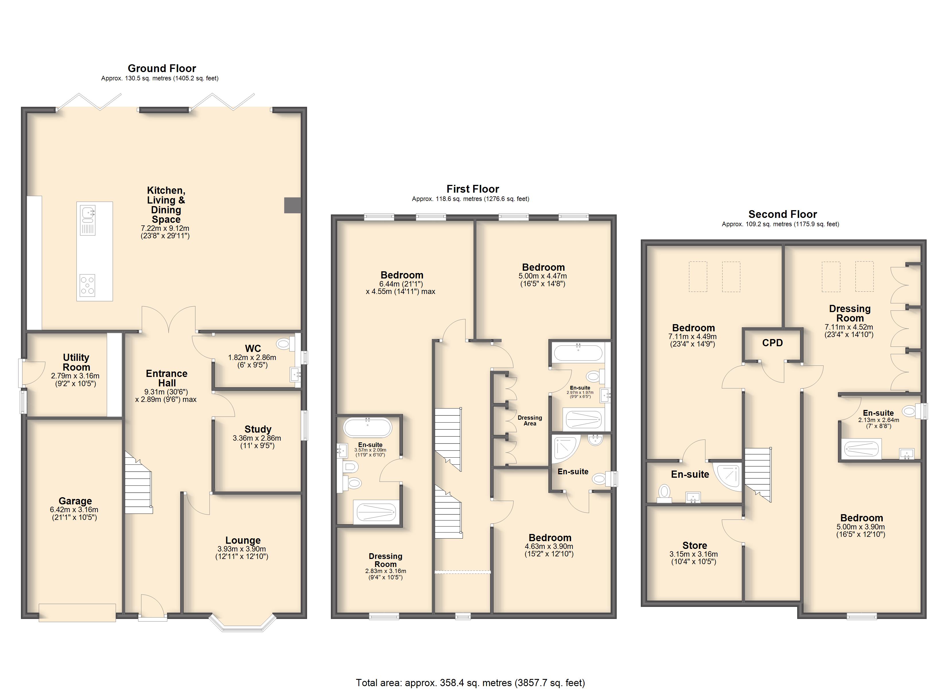 Moving upstairs, the bedrooms are split across two floors and provide total flexibility for a growing family. Each of the generous bedrooms features a luxury en-suite, with three also including a designated dressing room. You also have additional storage space throughout the property.