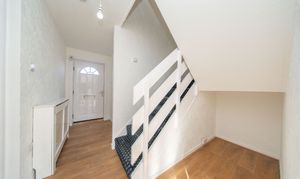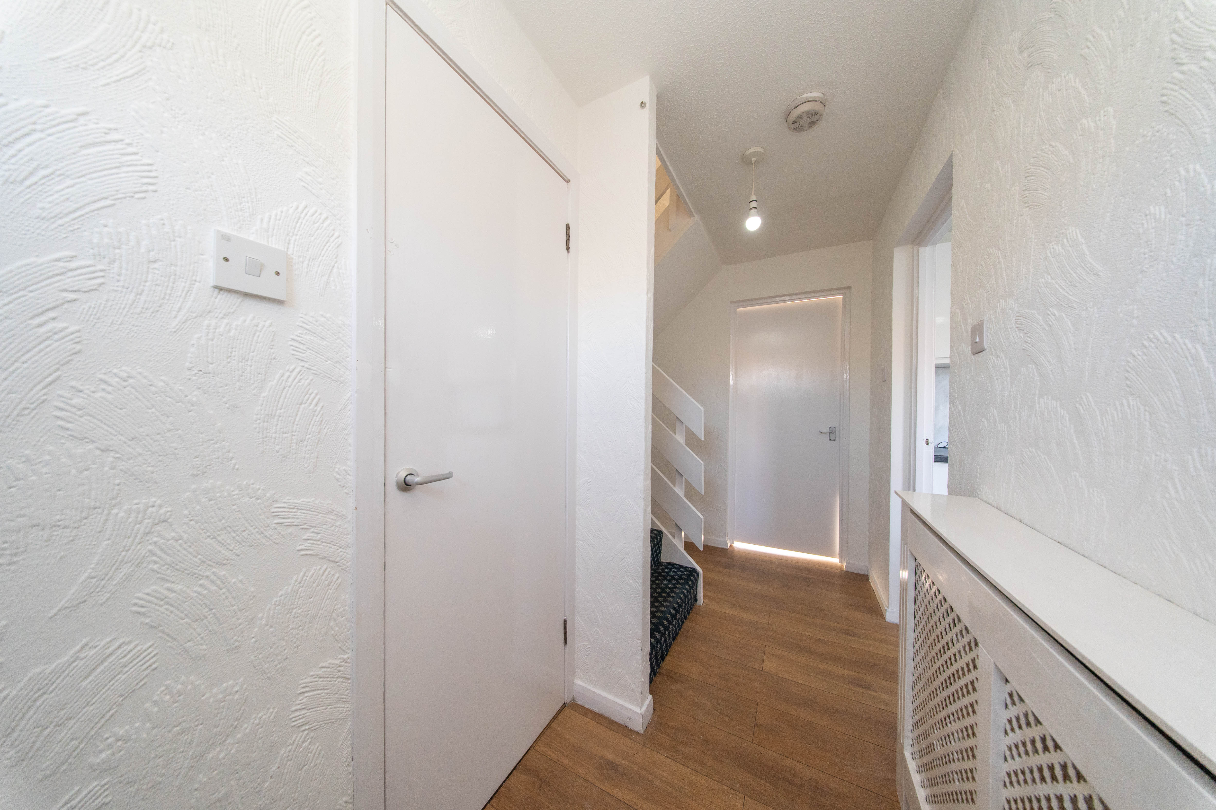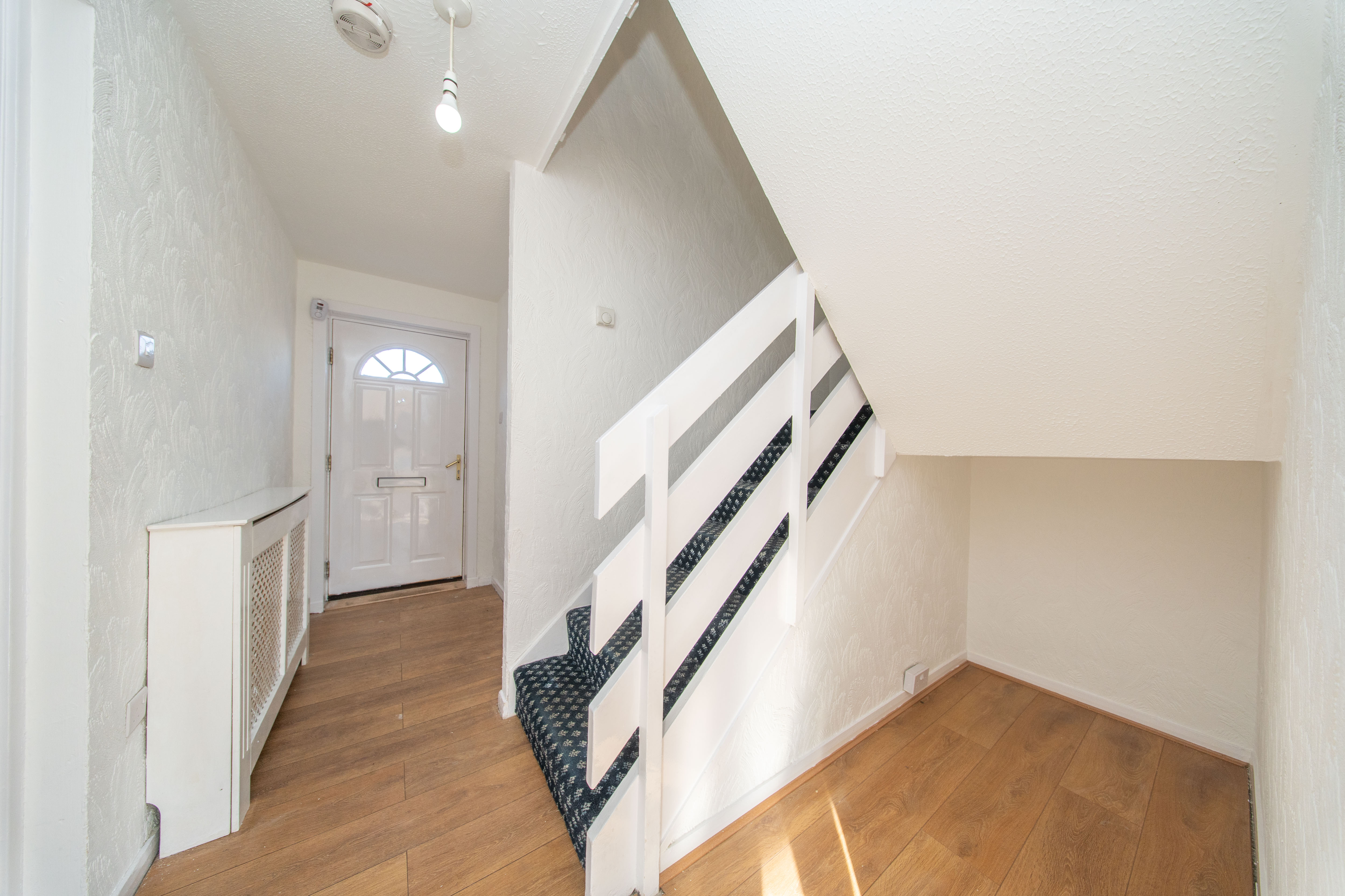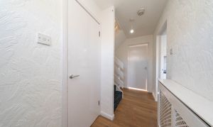 Welcoming you into the property is a bright hallway finished with wooden laminate flooring and white wallpapered walls, creating a neutral first impression. The wooden front door features a glazed window panel which allows in natural light, whilst maintaining privacy. Additional features include a radiator with decorative cover, a wall-mounted thermostat, a power point, a ceiling light and a smoke detector.