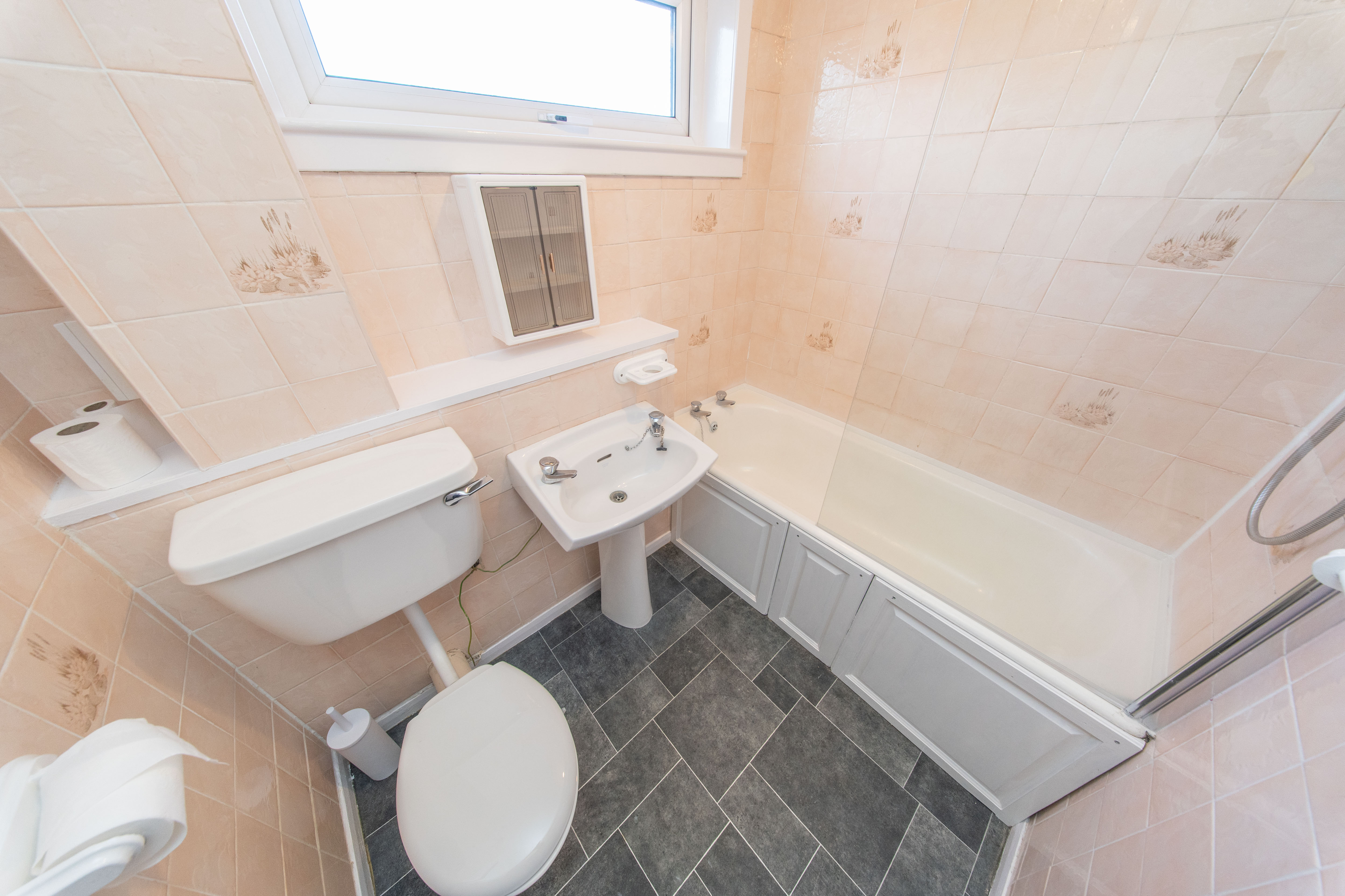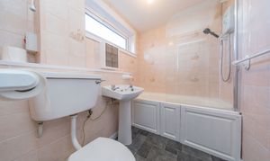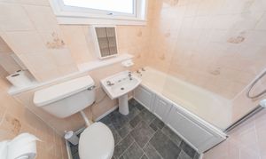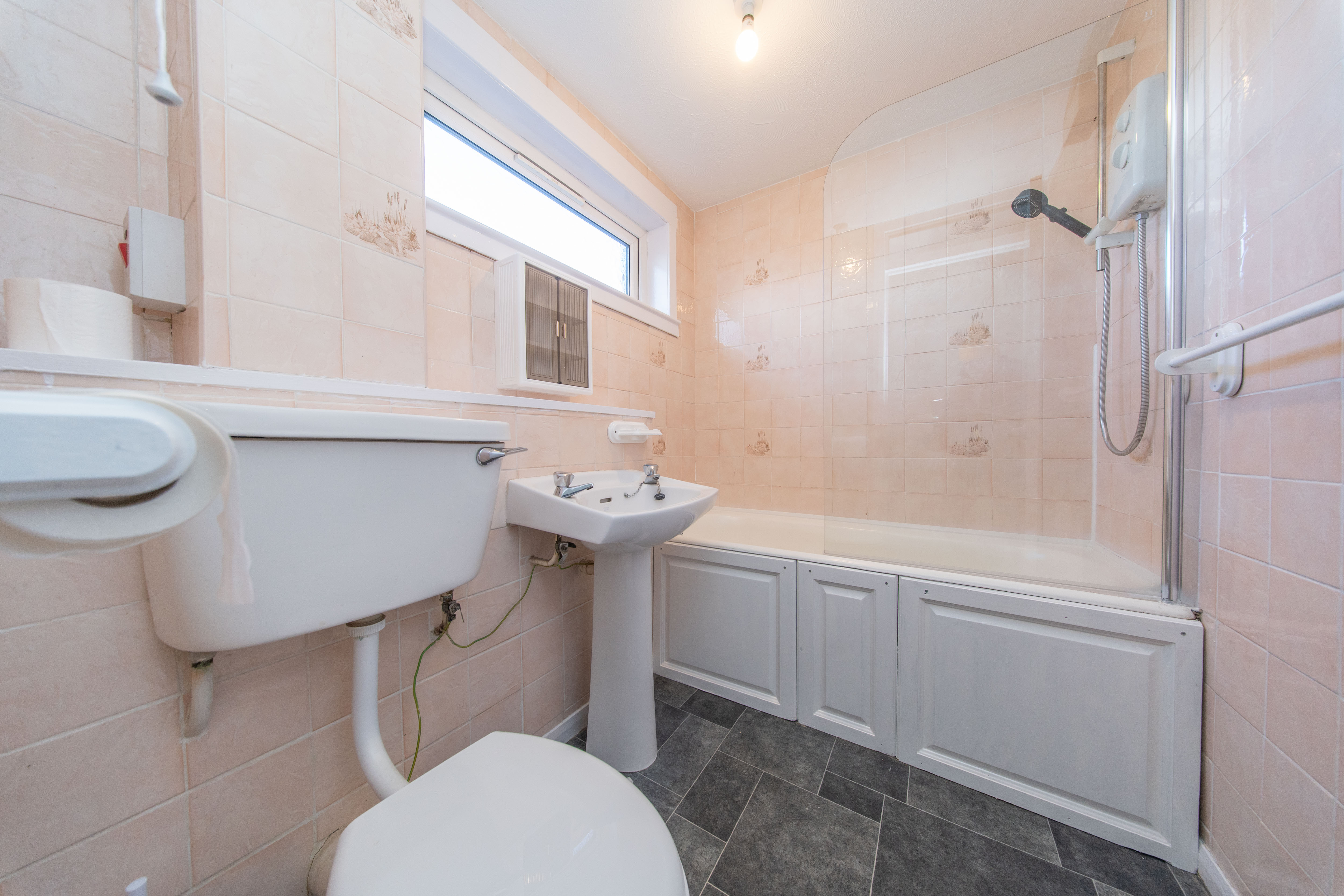 2.208m x 1.729m (07’02” x 05’08”) Fitted with patterned vinyl flooring and peach-toned tiled walls, the bathroom is well presented and functional. The suite includes a pedestal sink, a toilet and bath with electric shower above and glazed shower screen. A front-facing window allows for natural light and ventilation. The room is further complemented by a wall-mounted heater and a radiator.