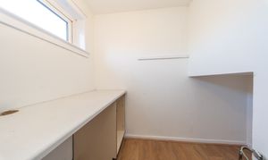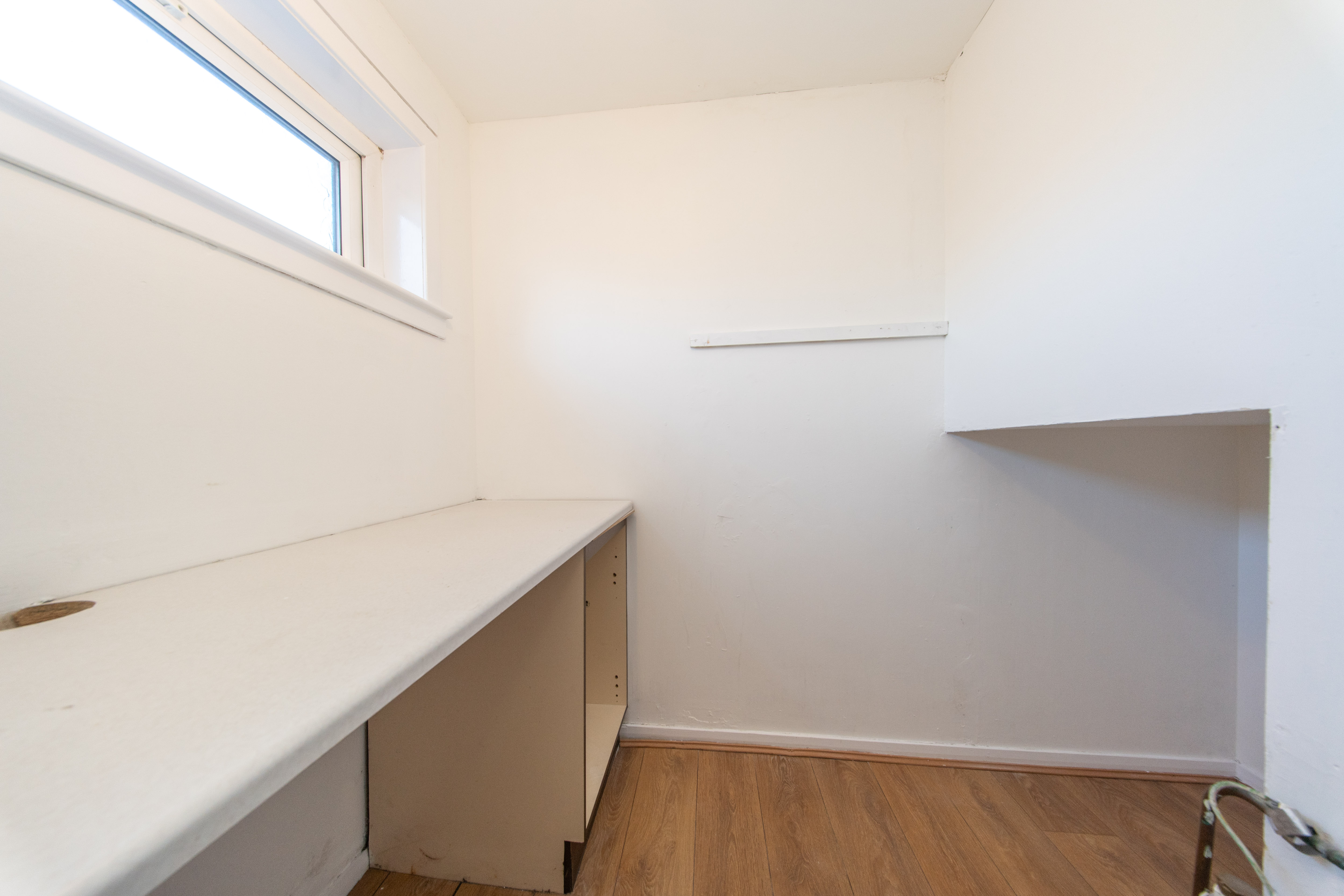 1.887m x 1.682m (06’02” x 05’06”) Positioned to the front of the property, this practical utility space continues the wooden laminate flooring from the hallway and is finished with white painted walls, maintaining a bright and neutral feel. A laminate-wrapped worksurface provides useful preparation and storage space, with a window to the front of the property allowing for natural light. The room also houses the electric meter and fuse board and is complete with a power point and ceiling-mounted pendant light.