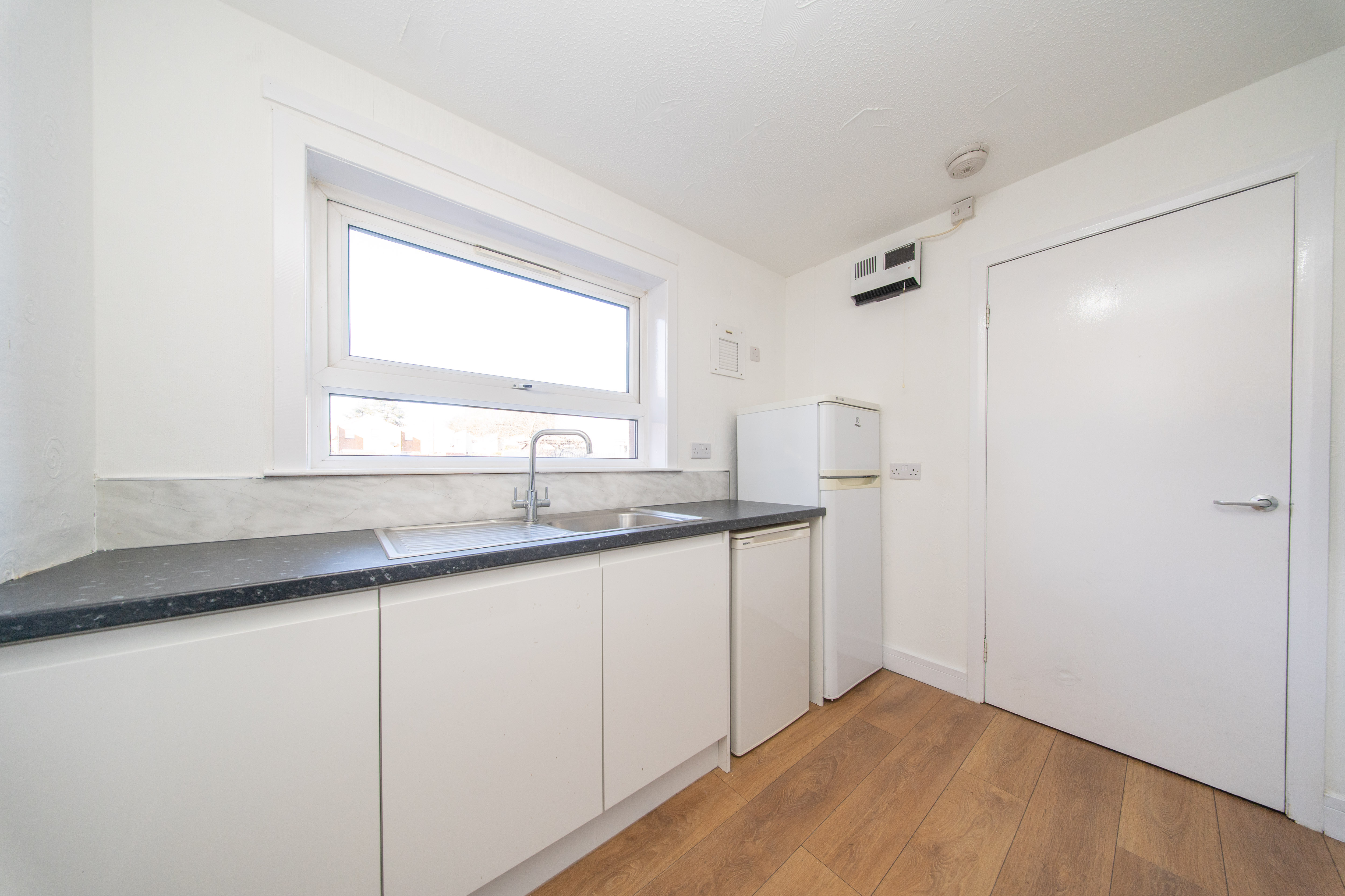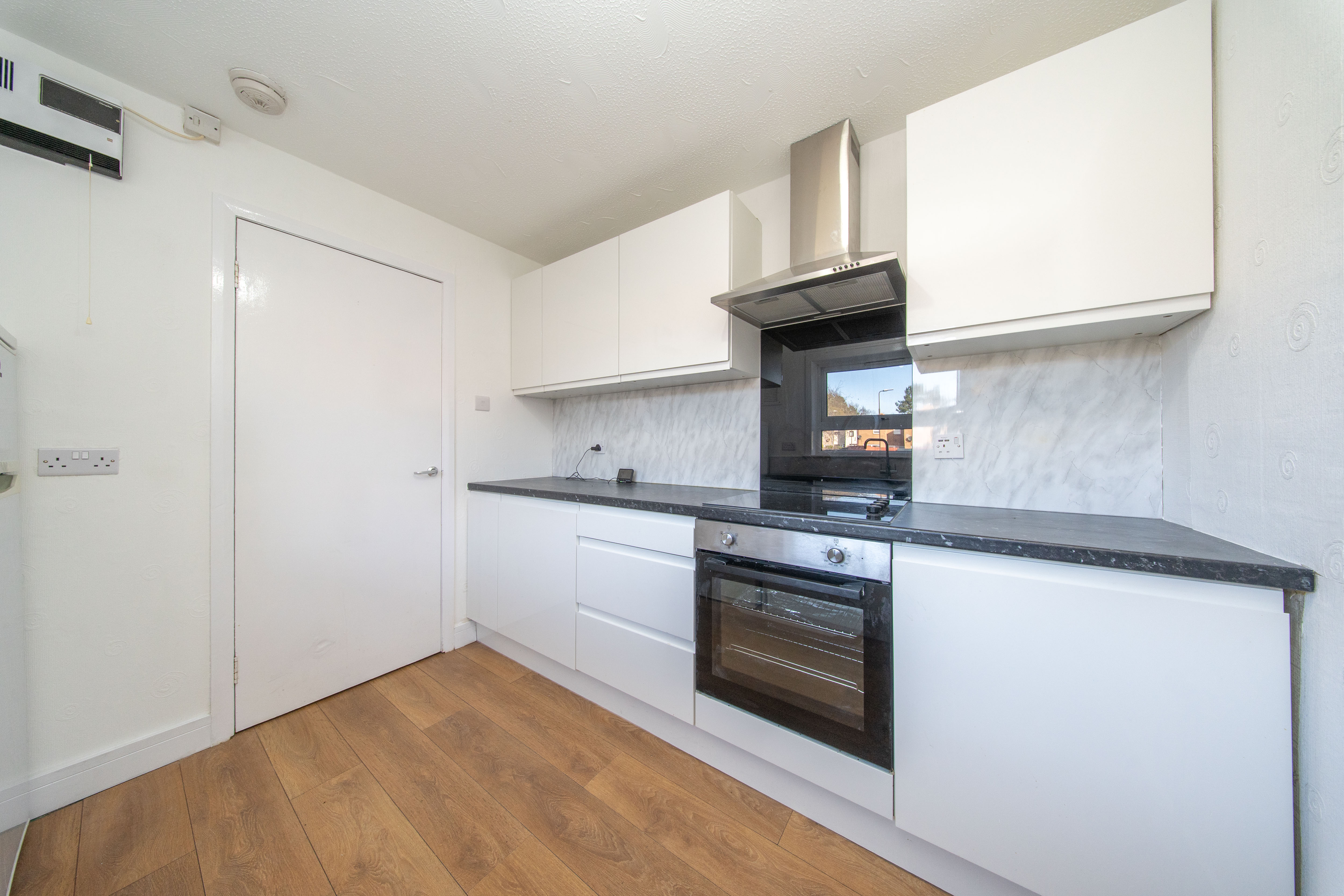 2.729m x 2.548m (08’11” x 08’04”) A modern kitchen fitted with a range of white high-gloss wall and base units, complemented by a worksurface and wet wall panel splash back plus a glass splash back positioned behind the electric hob. Integrated appliances include a built-in oven and electric hob with stainless steel extractor fan above, which be included in the sale. There is space provided for a washing machine and freestanding upright fridge freezer. A stainless-steel sink with drainer board is inset into the worksurface, positioned below a window overlooking the front of the property, allowing for natural light. Additional features include white wallpapered walls, wall-mounted electric heater, power points, a heat detector and a ceiling light, creating a bright and functional cooking space.