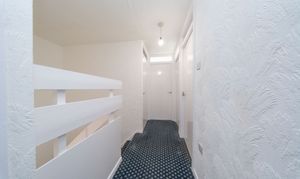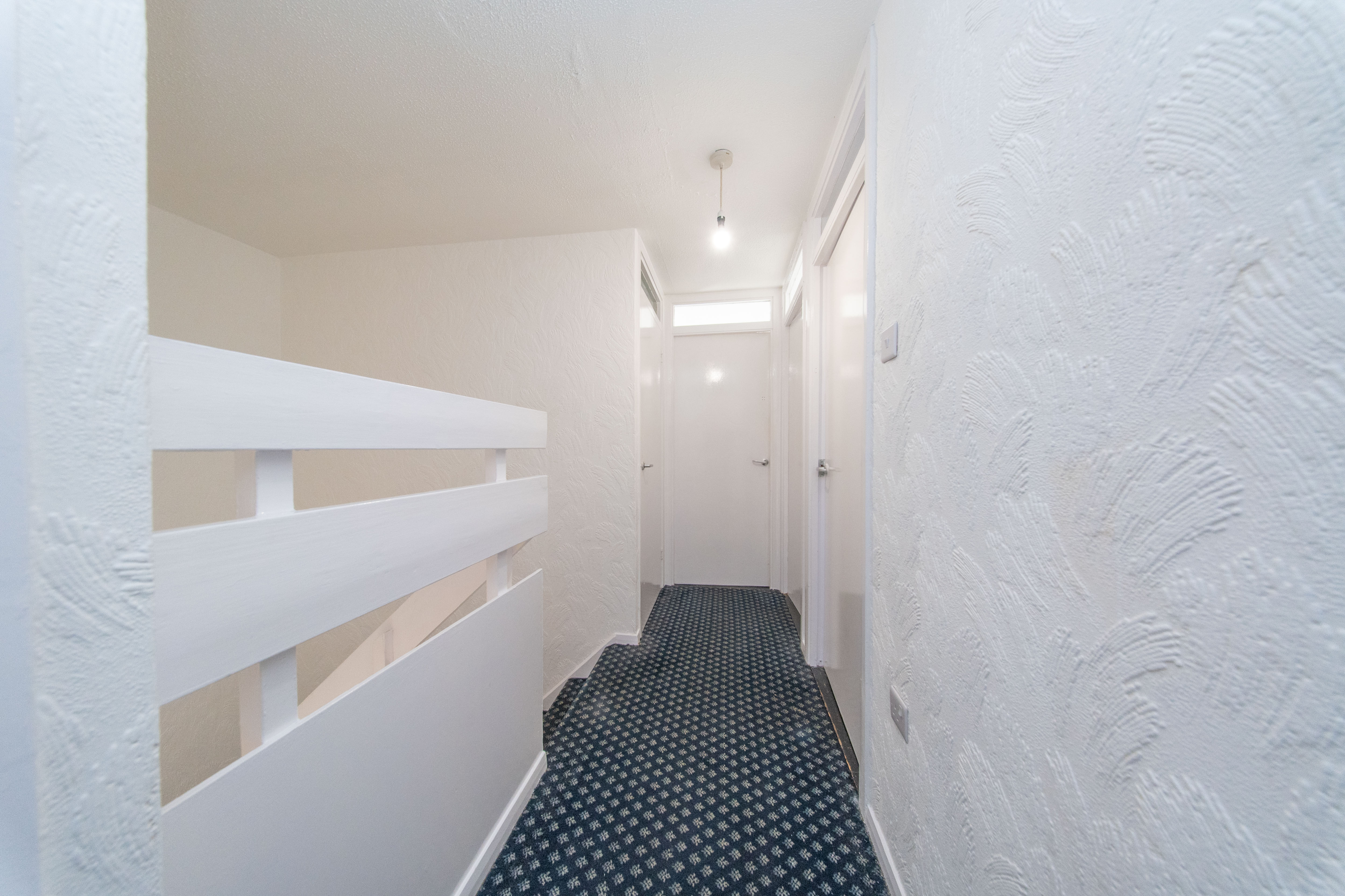 A carpeted staircase and upper landing finished with white wallpapered walls, maintaining a bright and neutral finish consistent with the rest of the property. The landing provides access to all upper level accommodation and benefits from two useful storage cupboards, one offering general storage space and the other housing the boiler and water tank. Additional features include a ceiling-mounted pendant light, smoke detector, carbon monoxide detector, and attic hatch providing access to further storage.