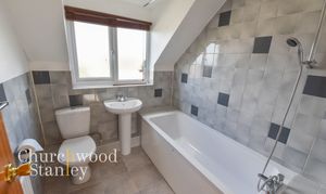 The family bathroom is smartly presented, offering a clean and practical space for daily routines. A full-sized bath with a chrome mixer tap and overhead shower sits beneath a striking tiled feature wall in a mix of grey tones, adding subtle visual interest to the room. The suite is completed by a modern pedestal basin and close-coupled WC, both positioned beneath a frosted window that brings in plenty of natural light while maintaining privacy. With a shower curtain rail already installed and ample room to move around, this bathroom is both functional and ready to enjoy.