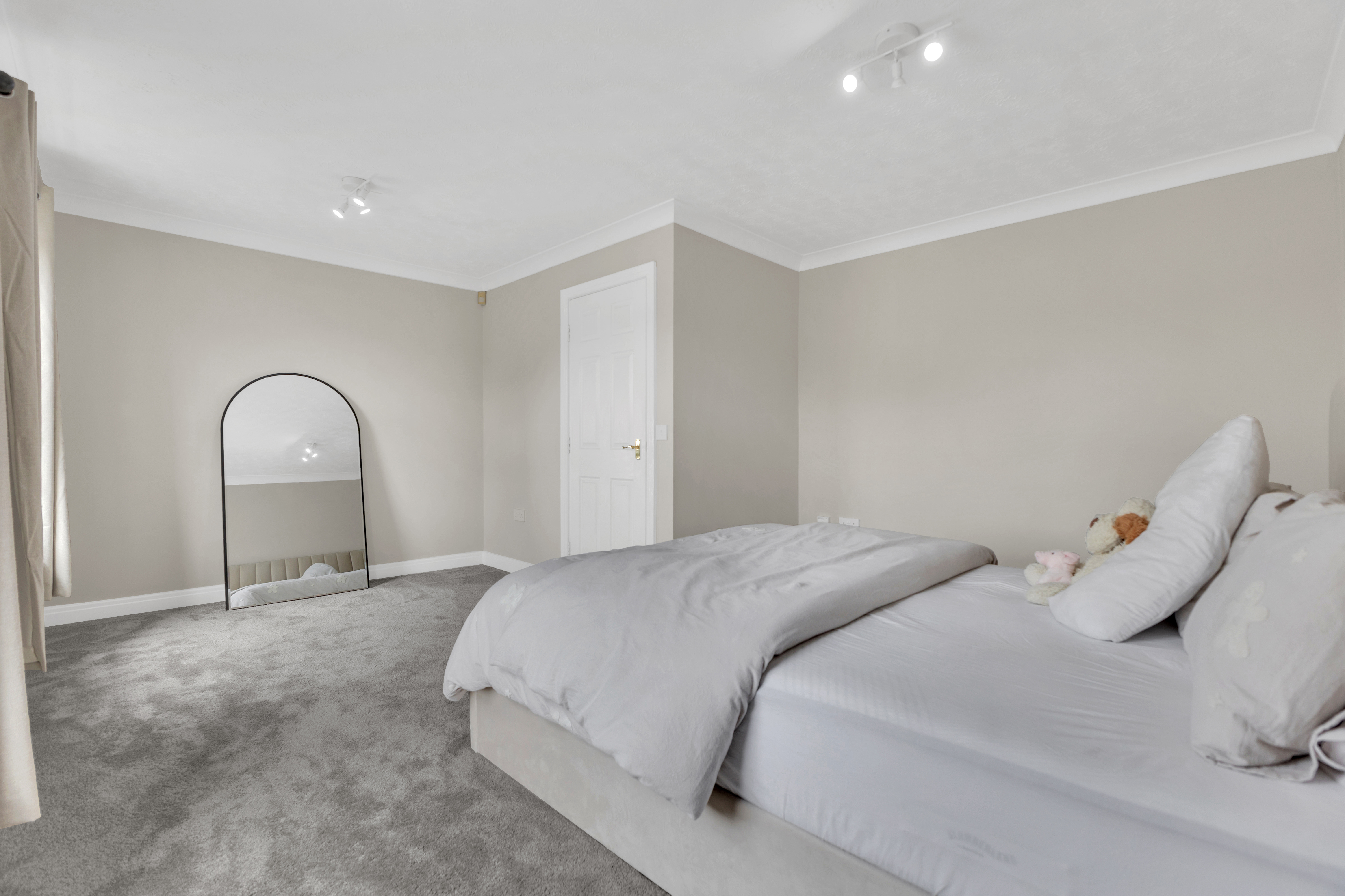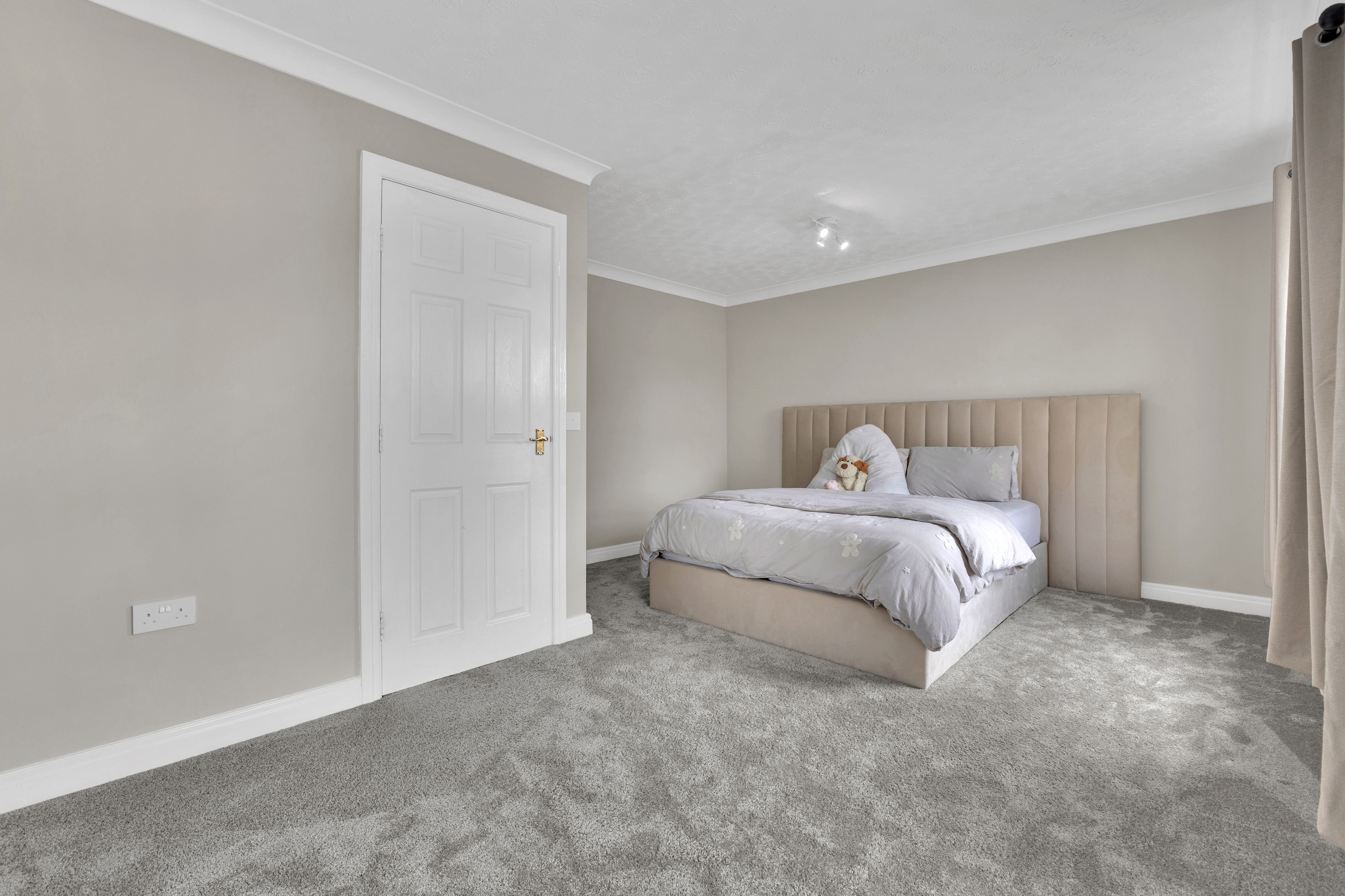 A calm and cosy retreat with carpeted flooring, plaster-painted walls, double-glazed window, radiator, and central light fitting. A door leads to the private en-suite, creating a complete master suite experience.