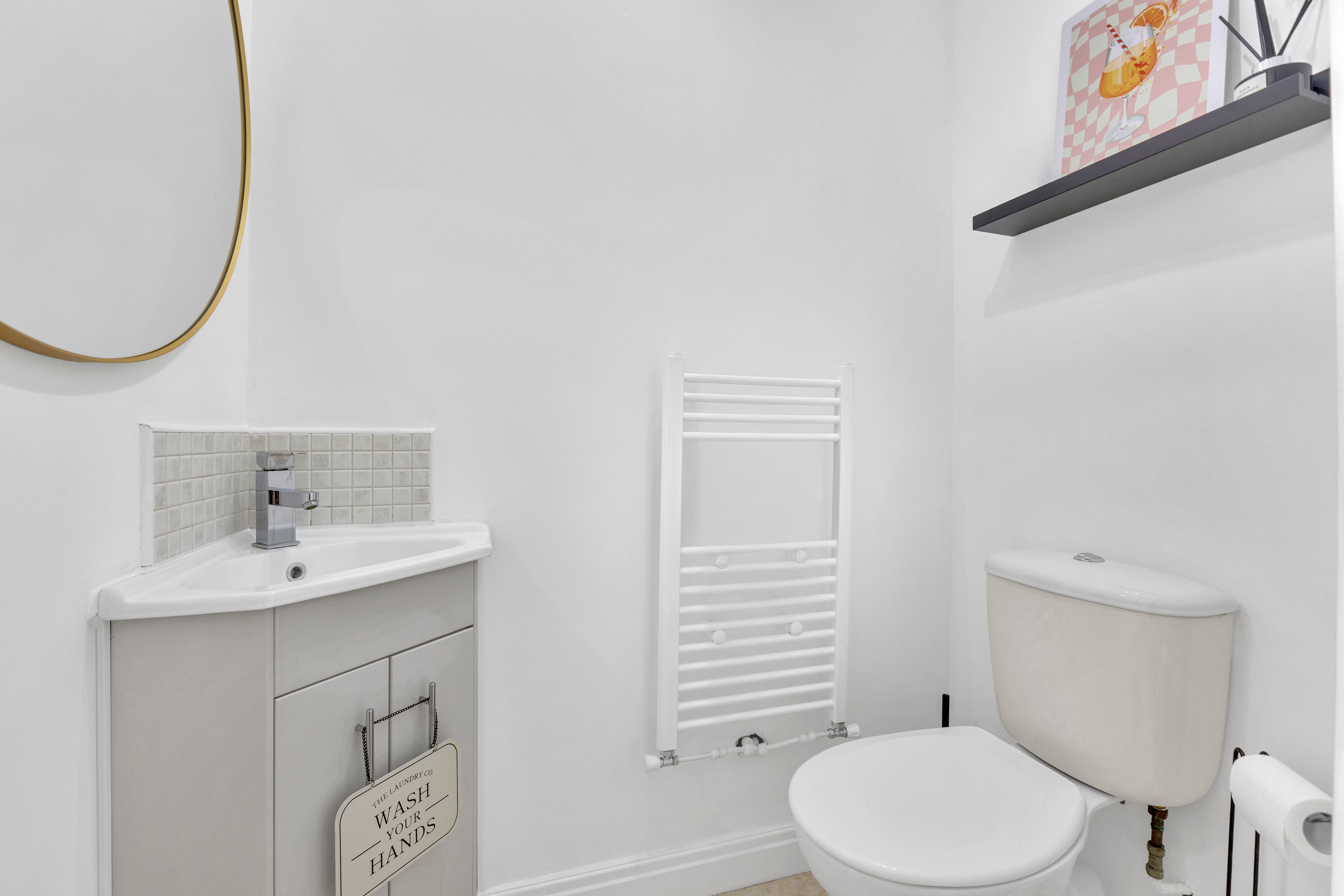 Conveniently located on the ground floor, the WC includes tiled flooring, a toilet and sink, plaster-painted walls, a wall-mounted radiator, and a ceiling light fitting—ideal for guests and everyday use.