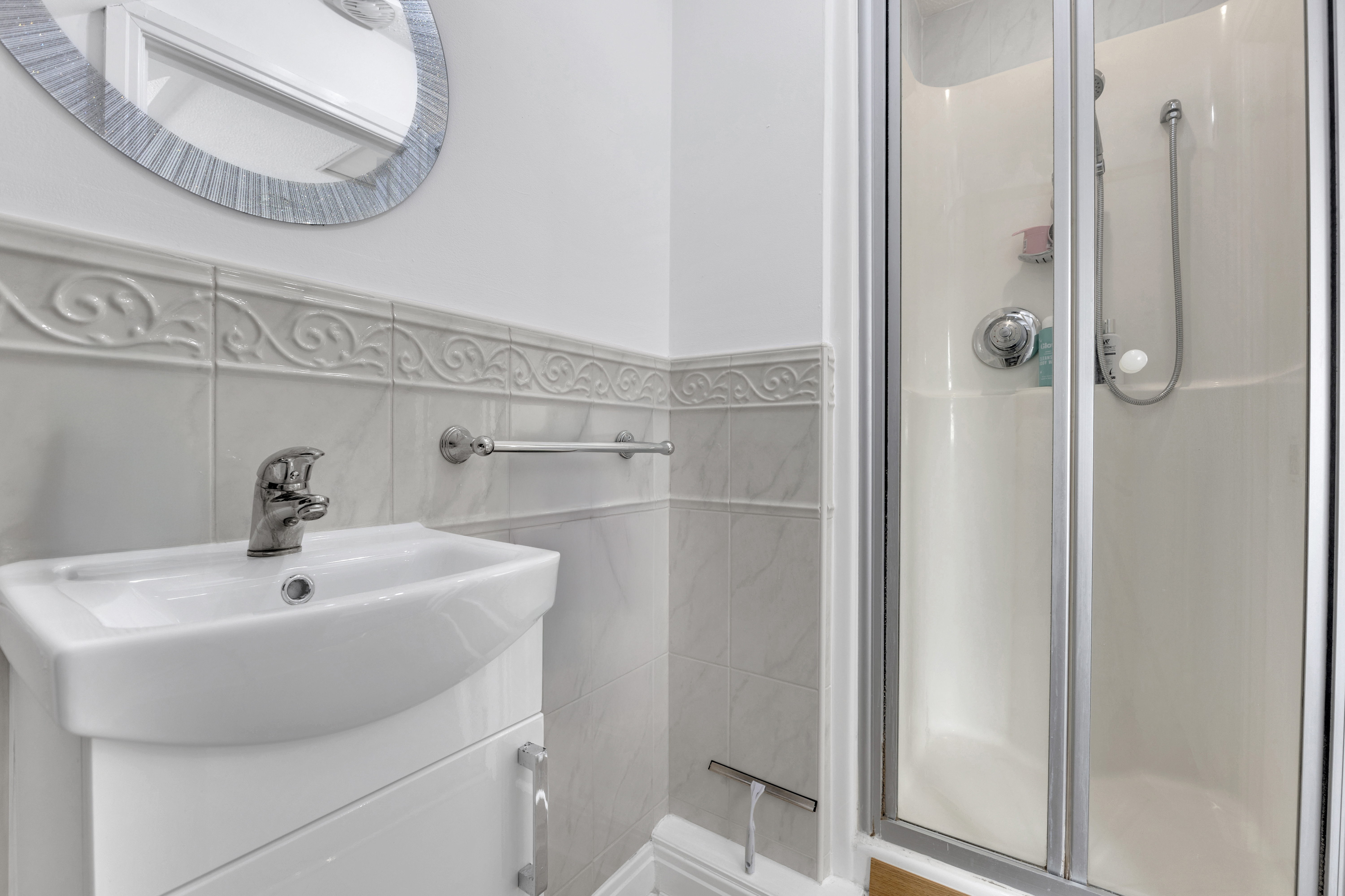 The en-suite includes a walk-in shower, toilet, sink, and laminate flooring, finished with tile splashbacks, a heated towel radiator, and a clean, contemporary look.