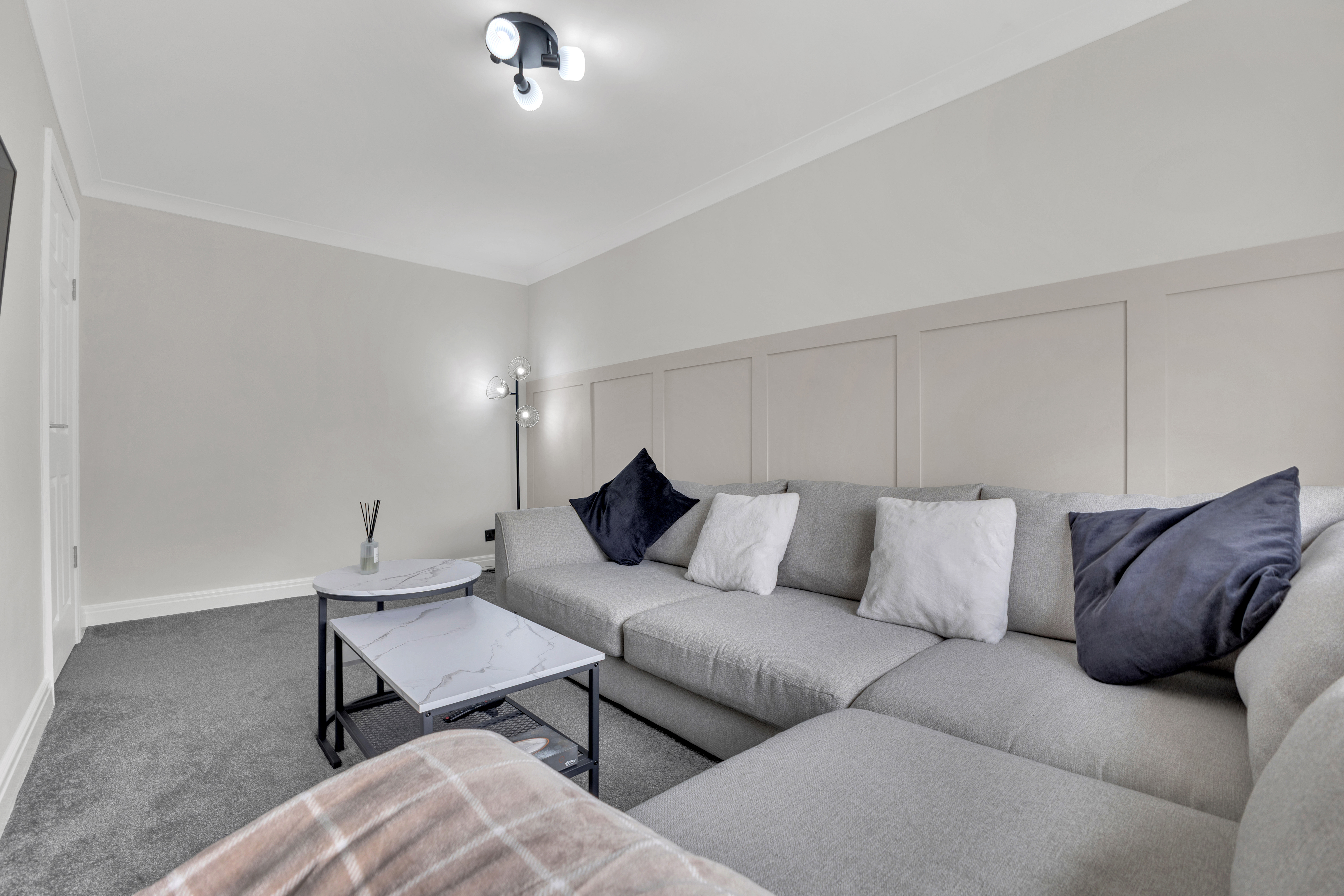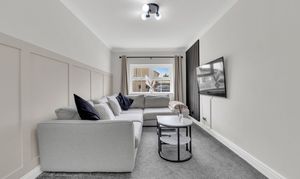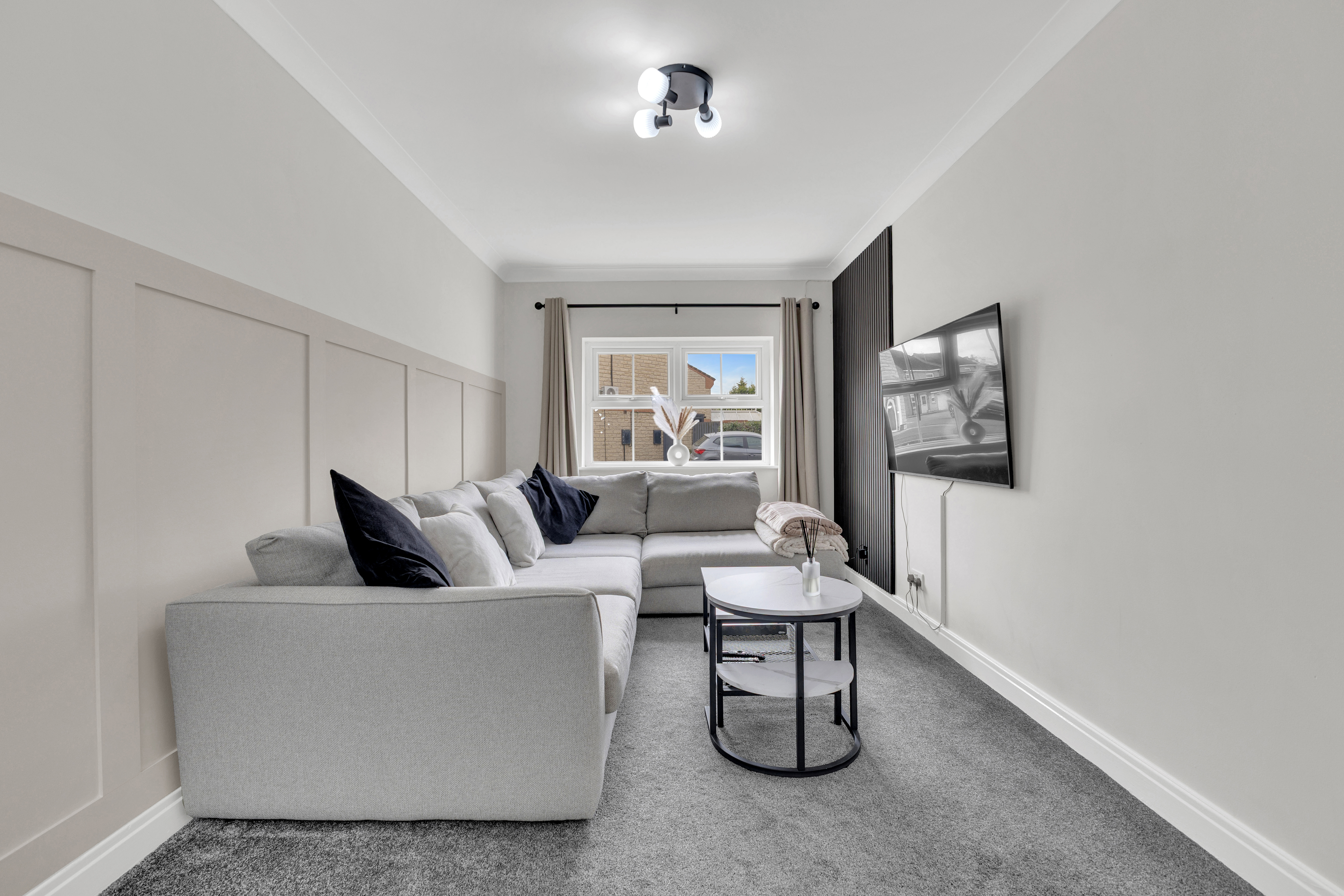 A welcoming and well-presented space with carpeted flooring, plaster-painted walls, and a stylish panel feature wall. A double-glazed window brings in natural light, while a radiator and central light fitting complete the room—ideal for relaxing evenings or entertaining guests.