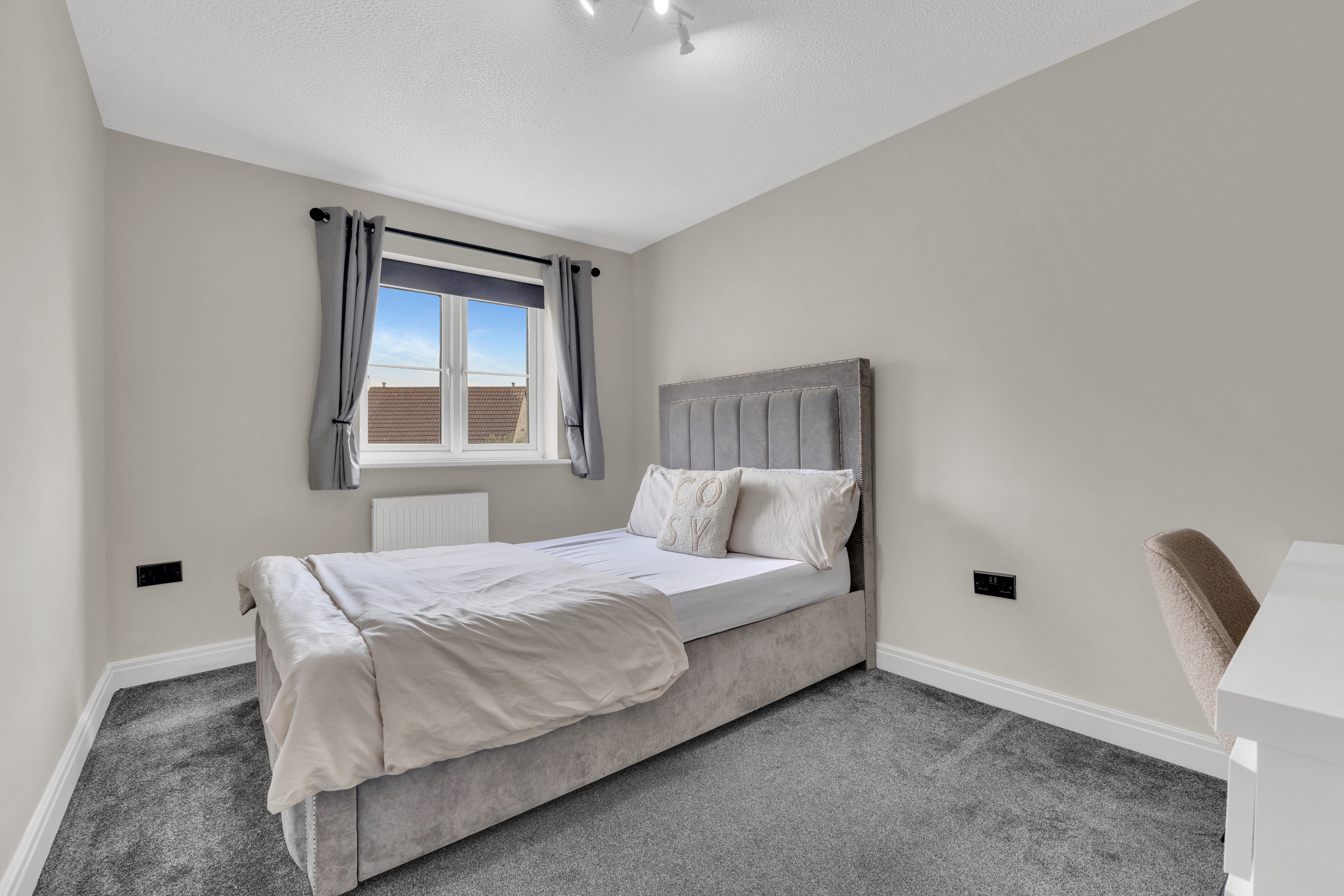 This comfortable room includes carpeted flooring, plaster-painted walls, a double-glazed window, radiator, and light fitting—perfect as a child’s bedroom or a cosy guest space.