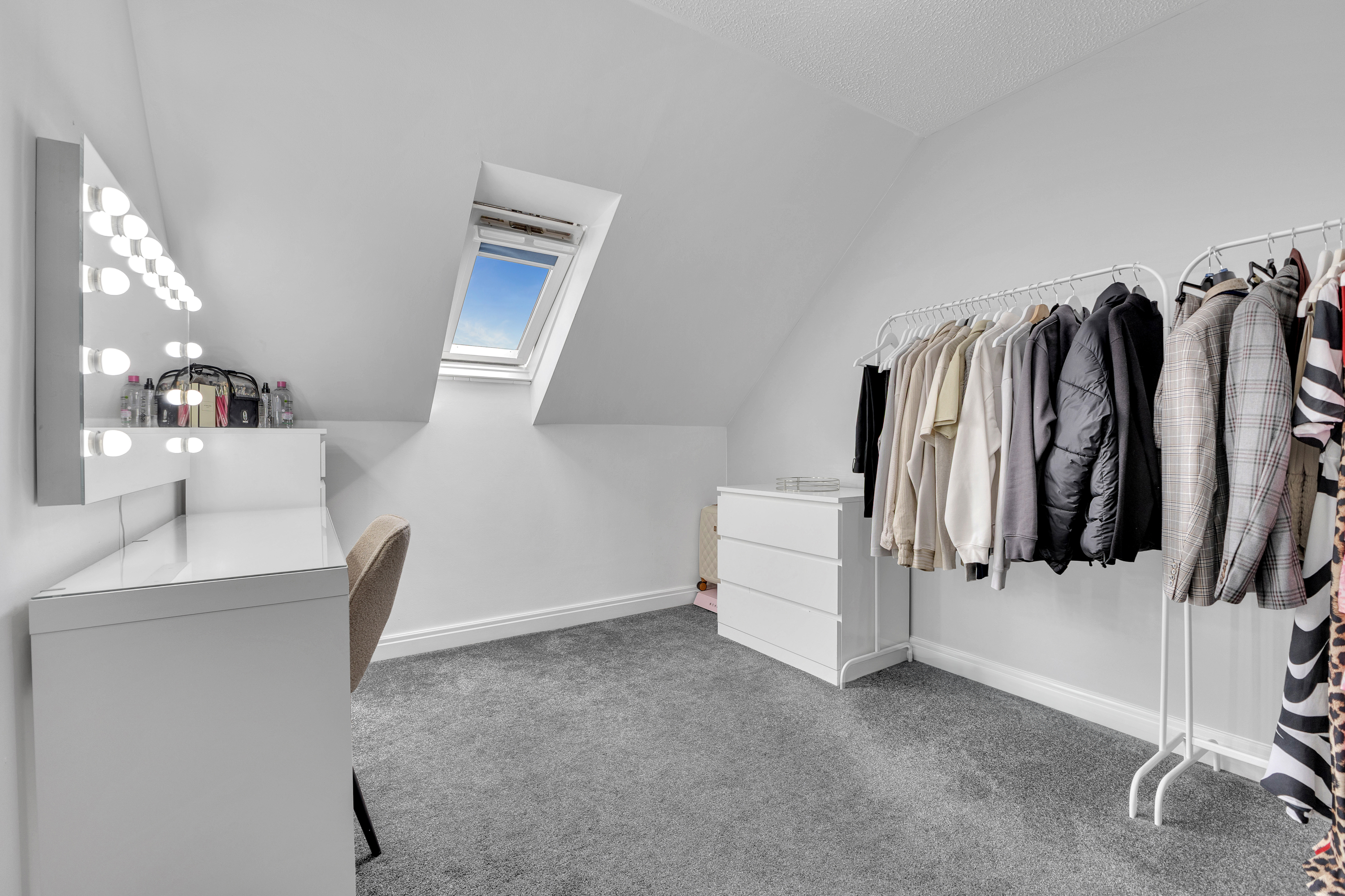 Ideal as a nursery or home office, bedroom four features carpet, a Velux window bringing in natural light, plaster-painted walls, a radiator, and a light fitting.