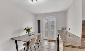 Designed with modern living in mind, the kitchen/diner features wooden wall and base cabinets, tiled flooring, and sleek stainless steel appliances including a five-ring gas hob with extractor fan and tiled splashback. A double-glazed window and French doors to the garden allow plenty of light to flood the space. With wall-mounted radiators and stylish dining area lighting, it’s perfect for both cooking and entertaining.