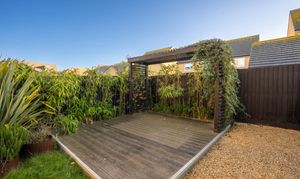 The professionally landscaped rear garden is a real feature of the home. Designed for both relaxation and entertaining, it includes a grey sandstone patio and pathway leading to a well-maintained lawn, along with an additional decked seating area complete with pergola and bamboo planting—creating a private, tranquil space to enjoy throughout the year. The professionally landscaped garden is a beautiful haven, with an additional patio and path in grey sandstone which leads to an expanse of lawn, a further decked area with pergola and bamboo, offering shade and privacy to this perfect space to sit and enjoy the garden.