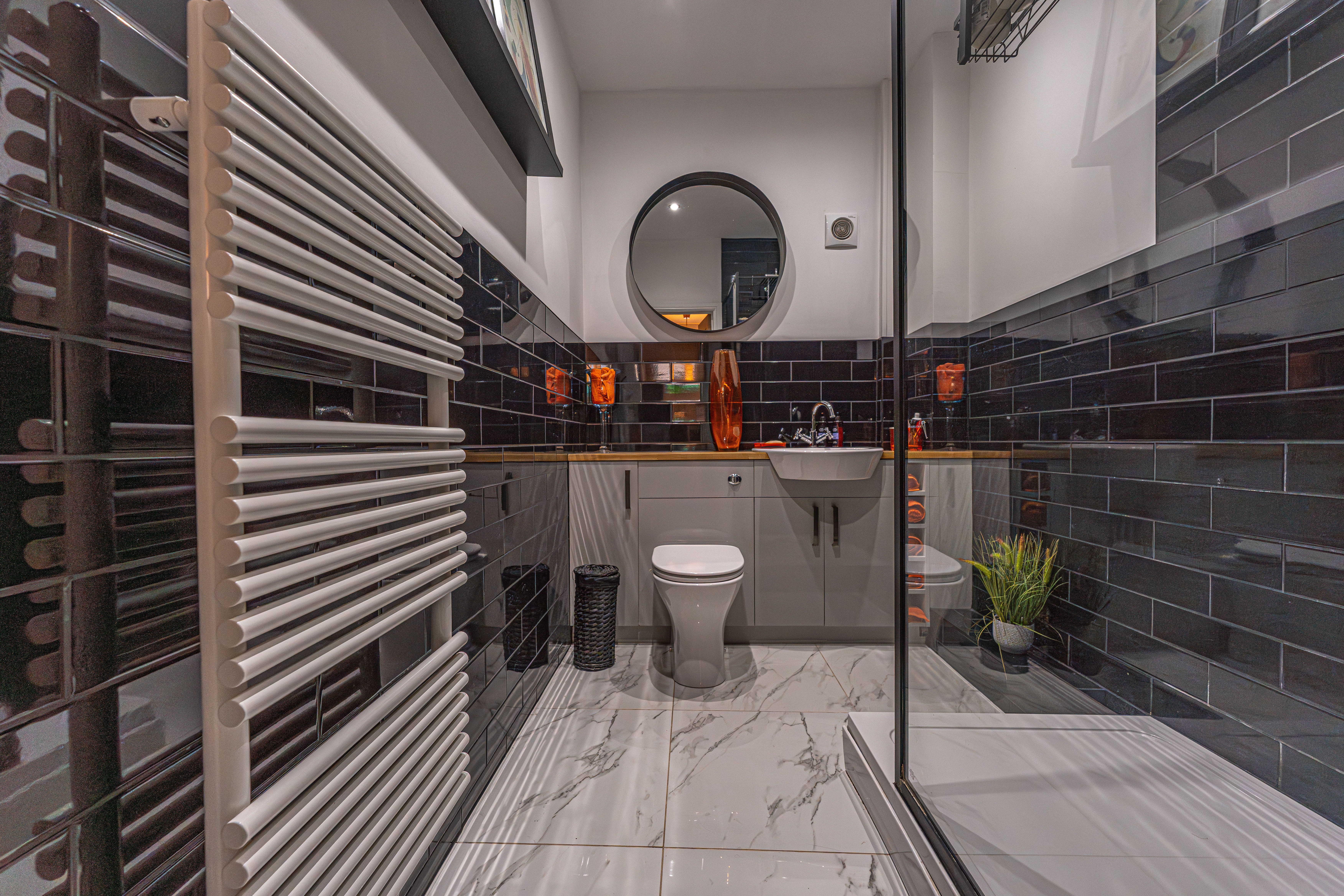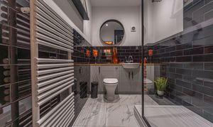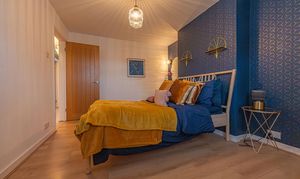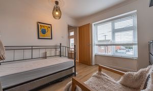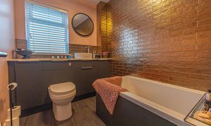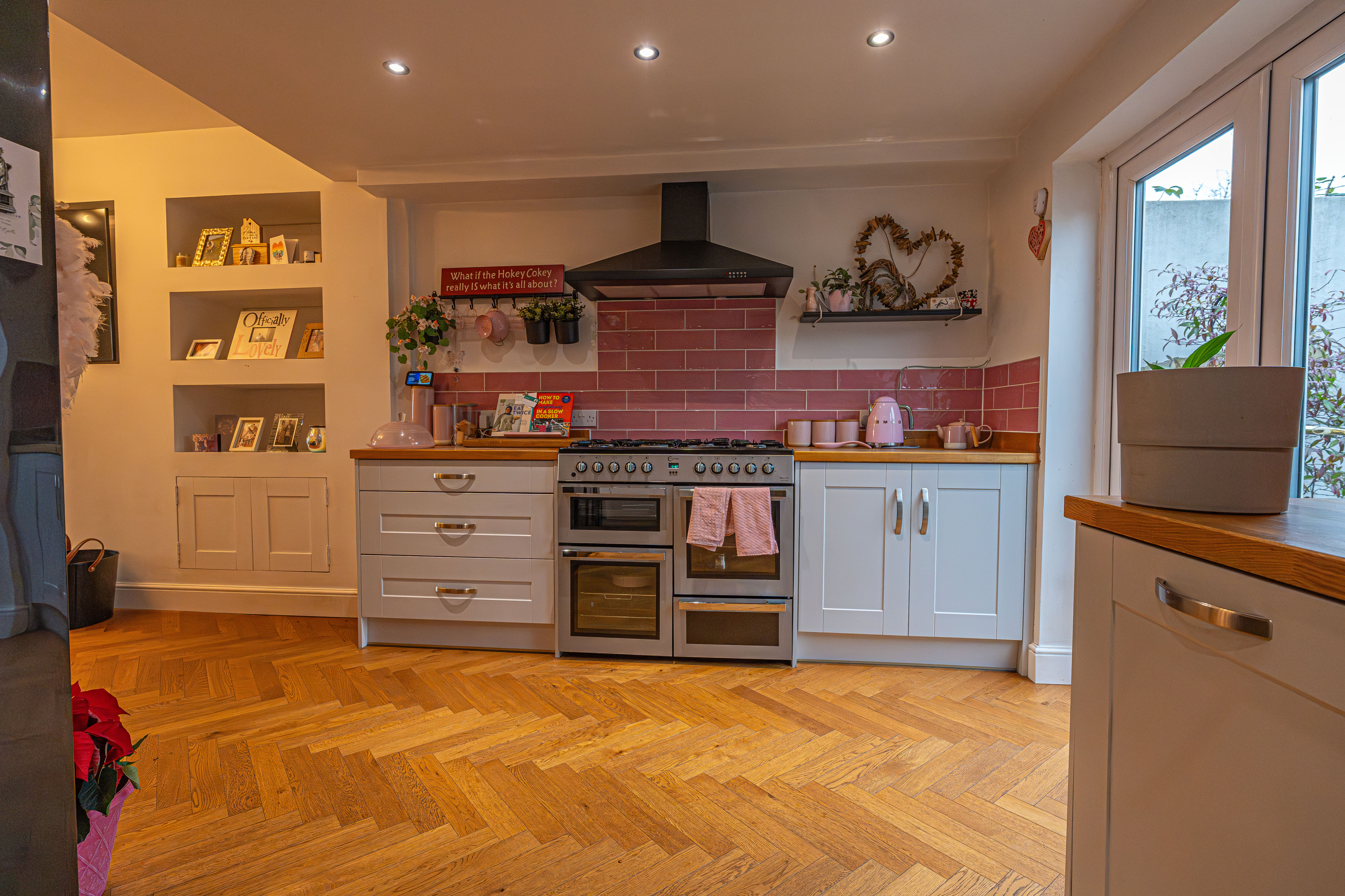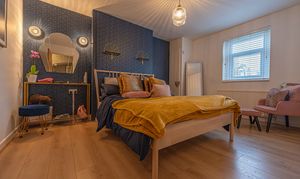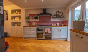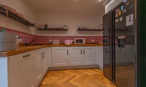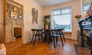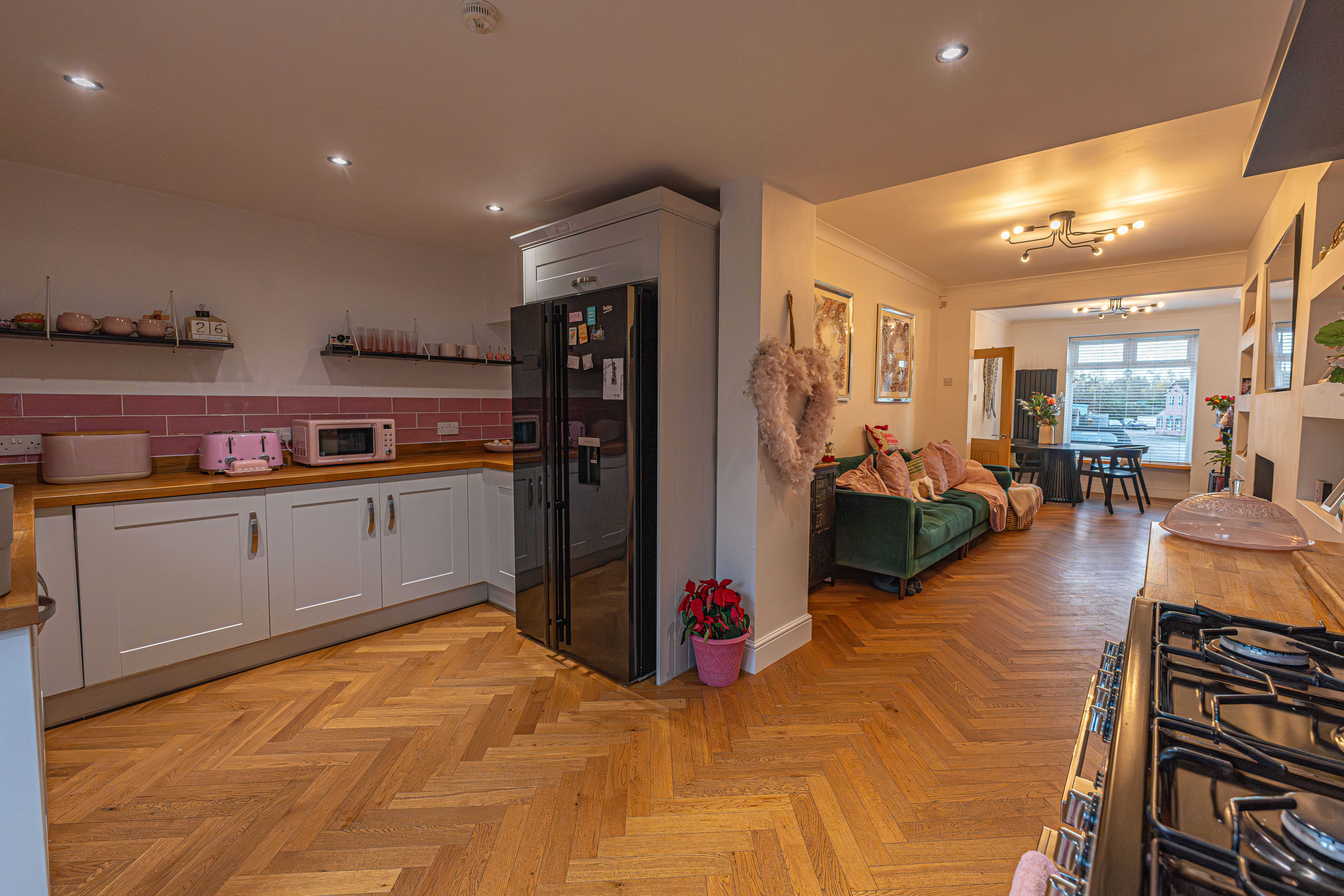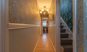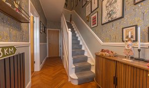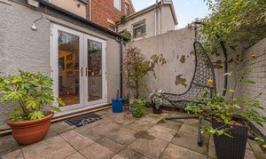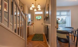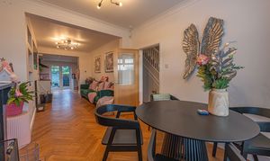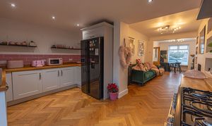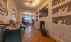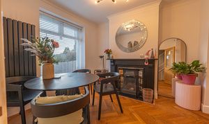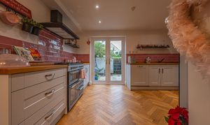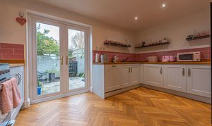 This beautifully presented home combines period charm with a marvellous contemporary design, offering a superb living environment ideal for families or professionals. The ground floor features a welcoming hallway adorned with elegant herringbone wood flooring, which continues into the impressive reception room at the heart of the home. This magnificent living space features a large open plan design for both the lounge and dining area, with a cosy wood burning stove, built-in shelving, and large wall-mounted TV, highlighting a wonderful space for relaxing and entertaining. The living room also effortlessly flows into the modern kitchen at the rear of the house, which is equipped with stylish pink tiled backsplash, as well as integrated appliances and sleek modern units for ample storage space. French doors lead directly from the kitchen to the garden at the rear of the house, while returning to the entry hallway we can find understairs storage cupboards, and a incredibly sleek washroom with a walk in shower and toilet.