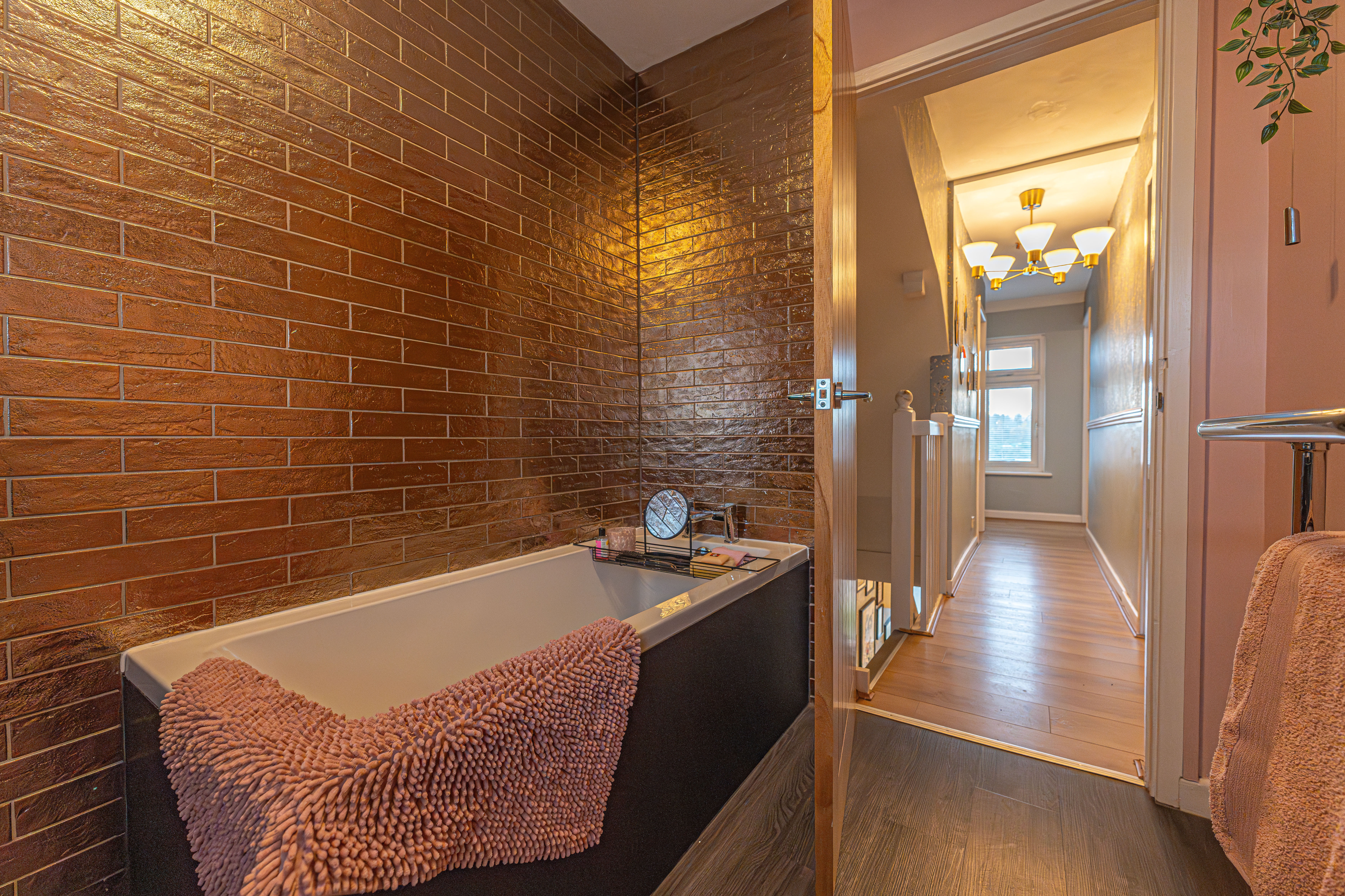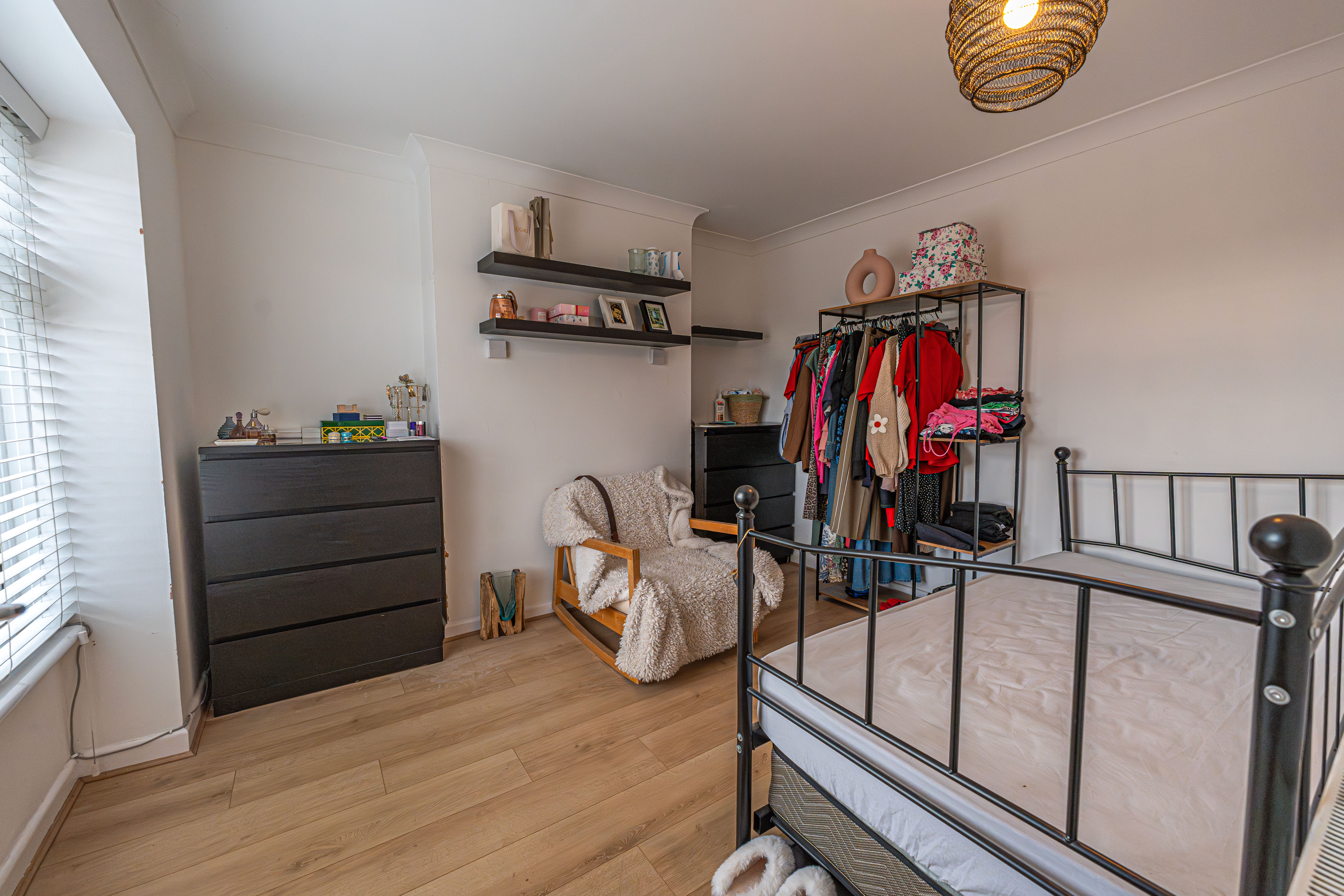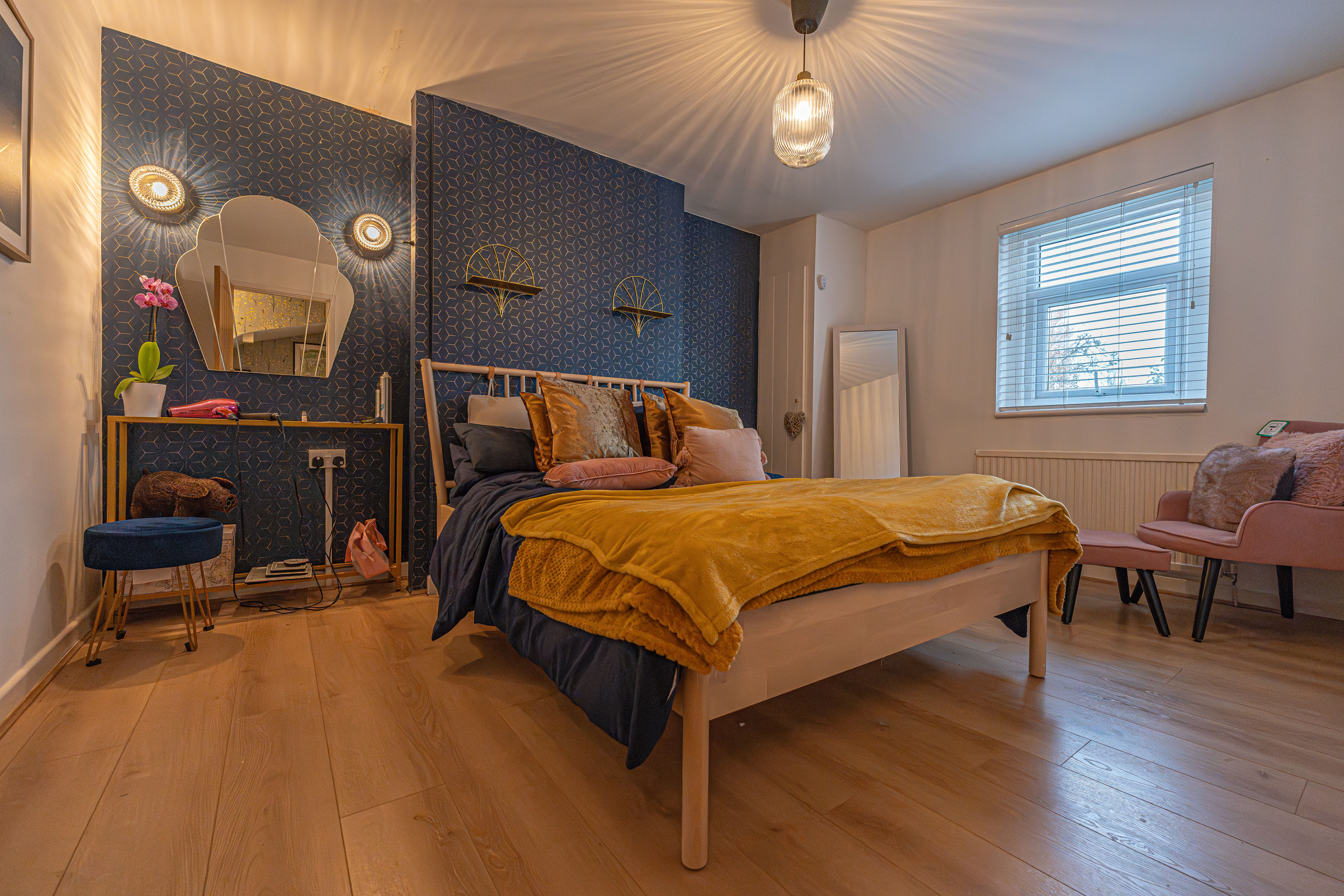 This beautifully presented home combines period charm with a marvellous contemporary design, offering a superb living environment ideal for families or professionals. The ground floor features a welcoming hallway adorned with elegant herringbone wood flooring, which continues into the impressive reception room at the heart of the home. This magnificent living space features a large open plan design for both the lounge and dining area, with a cosy wood burning stove, built-in shelving, and large wall-mounted TV, highlighting a wonderful space for relaxing and entertaining. The living room also effortlessly flows into the modern kitchen at the rear of the house, which is equipped with stylish pink tiled backsplash, as well as integrated appliances and sleek modern units for ample storage space. French doors lead directly from the kitchen to the garden at the rear of the house, while returning to the entry hallway we can find understairs storage cupboards, and a incredibly sleek washroom with a walk in shower and toilet.