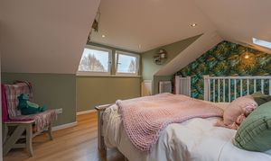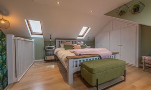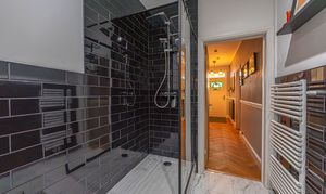 Upstairs, we can find two well sized double bedrooms on the first floor, in addition to another fitted closet and the second family bathroom, which also showcases a luxurious design adorning the bathtub and toilet. The third bedroom can be accessed via another staircase to the converted attic, which features built-in storage and numerous widows that allow natural light to cascade throughout this incredible space.