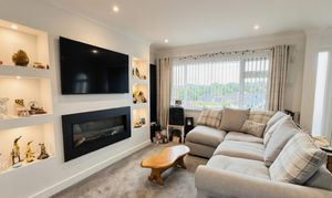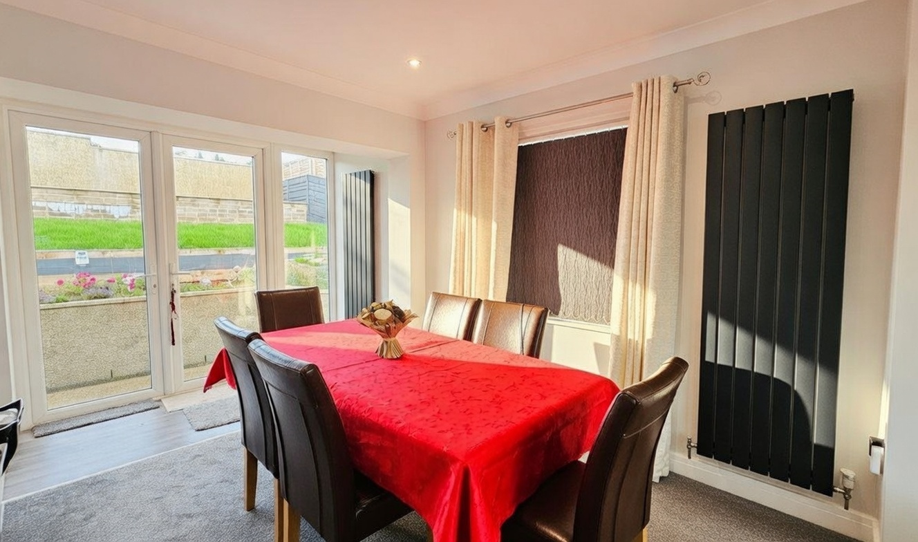 The heart of the home is a spacious open-plan lounge and dining area that spans the full width of the property. Sleek designer radiators and a contemporary media wall with a striking electric fire create an inviting atmosphere, while double doors open directly onto the rear garden—perfect for entertaining or simply relaxing.