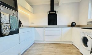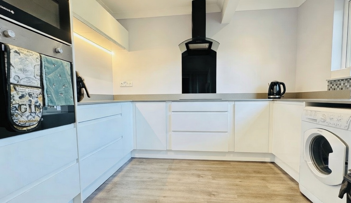The modern kitchen is fitted with a wide range of white high-gloss wall and base units complemented by contrasting grey Quartz worktops. A single oven, combination microwave, four-burner halogen hob with extractor, and a composite sink beneath the rear-facing window complete the space, with plumbing and room for both a washing machine and fridge/freezer.