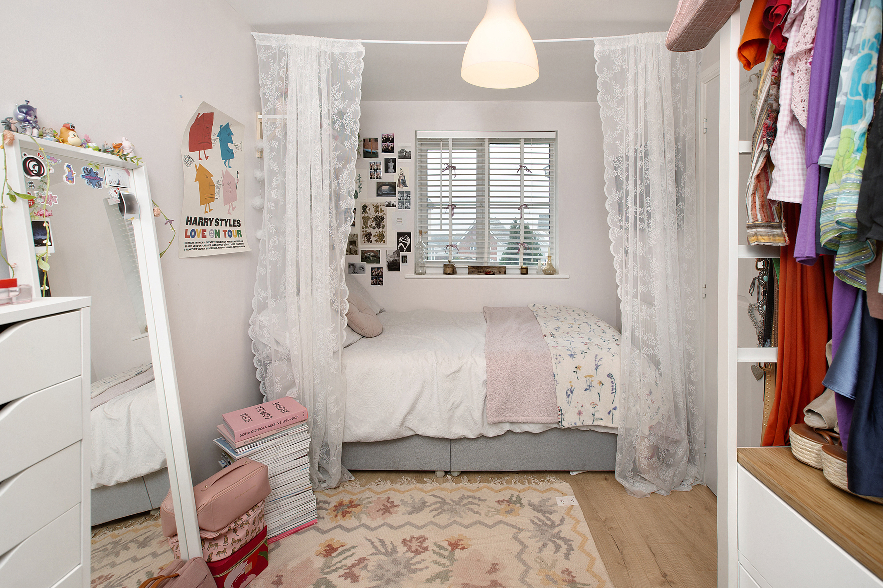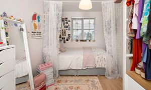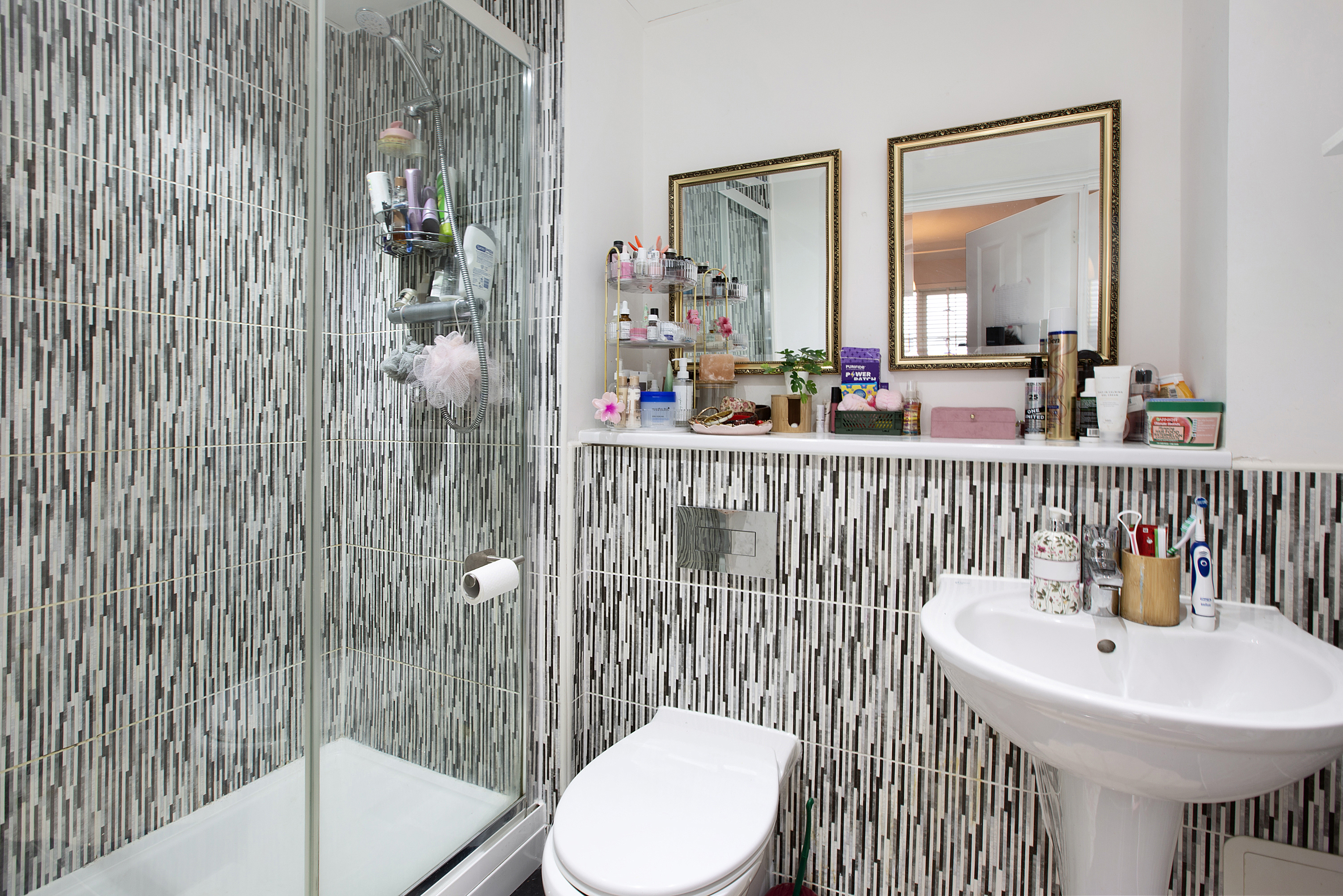Stepping into the bright hallway, the stairs rise to the first floor and doors lead to two good sized storage cupboards (one currently housing the tumble dryer) and a double bedroom. The bedroom has a window to the front aspect and a door to an en-suite comprising a double shower enclosure, low level WC, pedestal wash hand basin, heated towel rail and extractor fan.