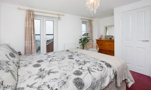 The second floor landing has doors leading off to the bedrooms and family bathroom. The main bedroom has a Juliet balcony with stunning views over Teignmouth and the estuary and a fitted wardrobe. There is also plumbing in place should an additional en-suite be required. A further bedroom to the rear aspect has the loft access hatch. The family bathroom comprises a panelled bath with shower and screen, pedestal wash hand basin, low level WC and heated towel rail.