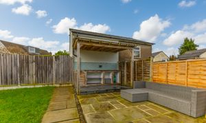 - Delightful rear garden featuring a lawn, patio seating area and outdoor kitchen