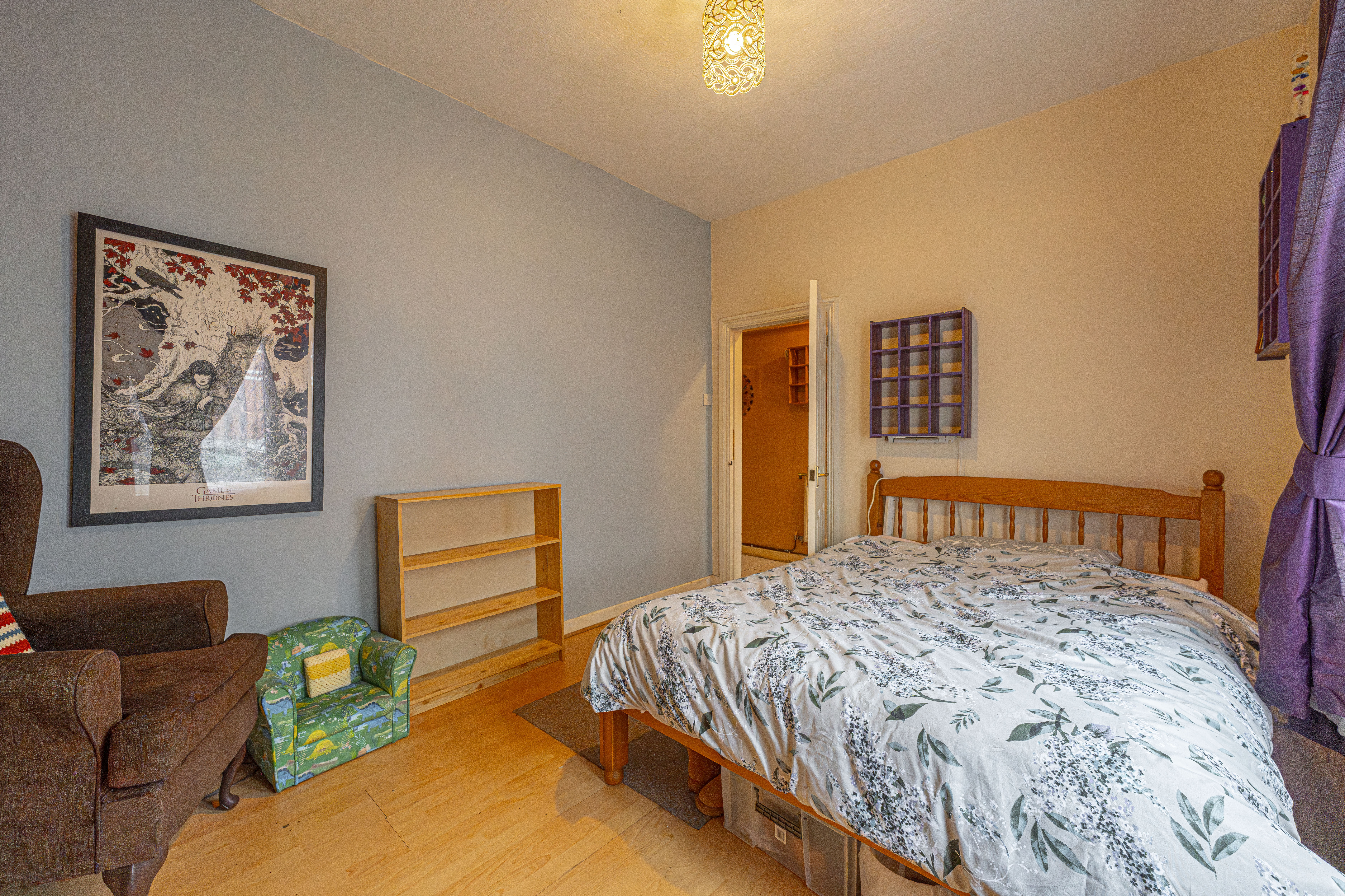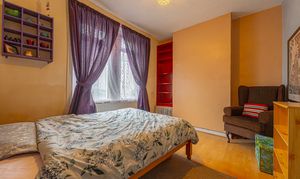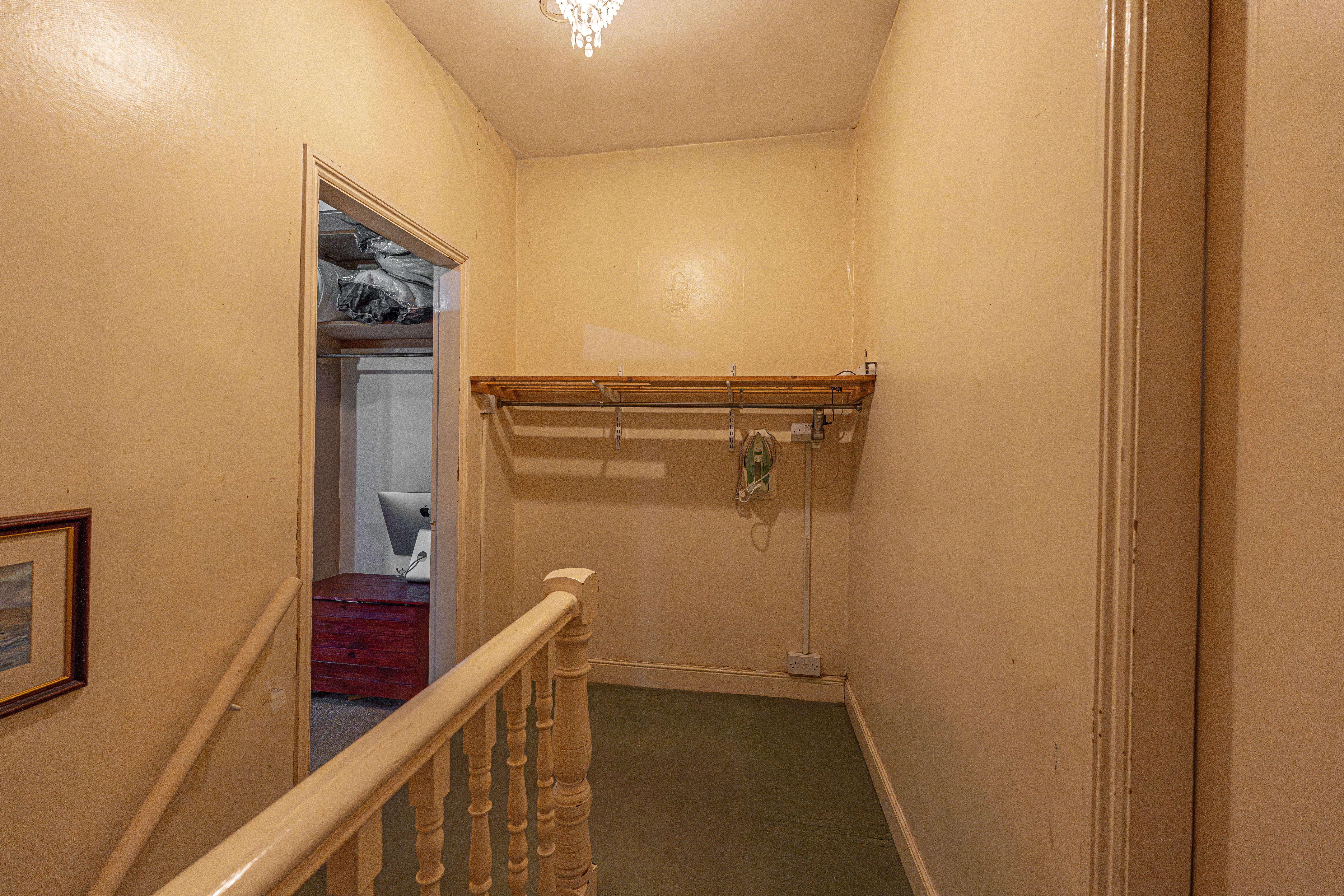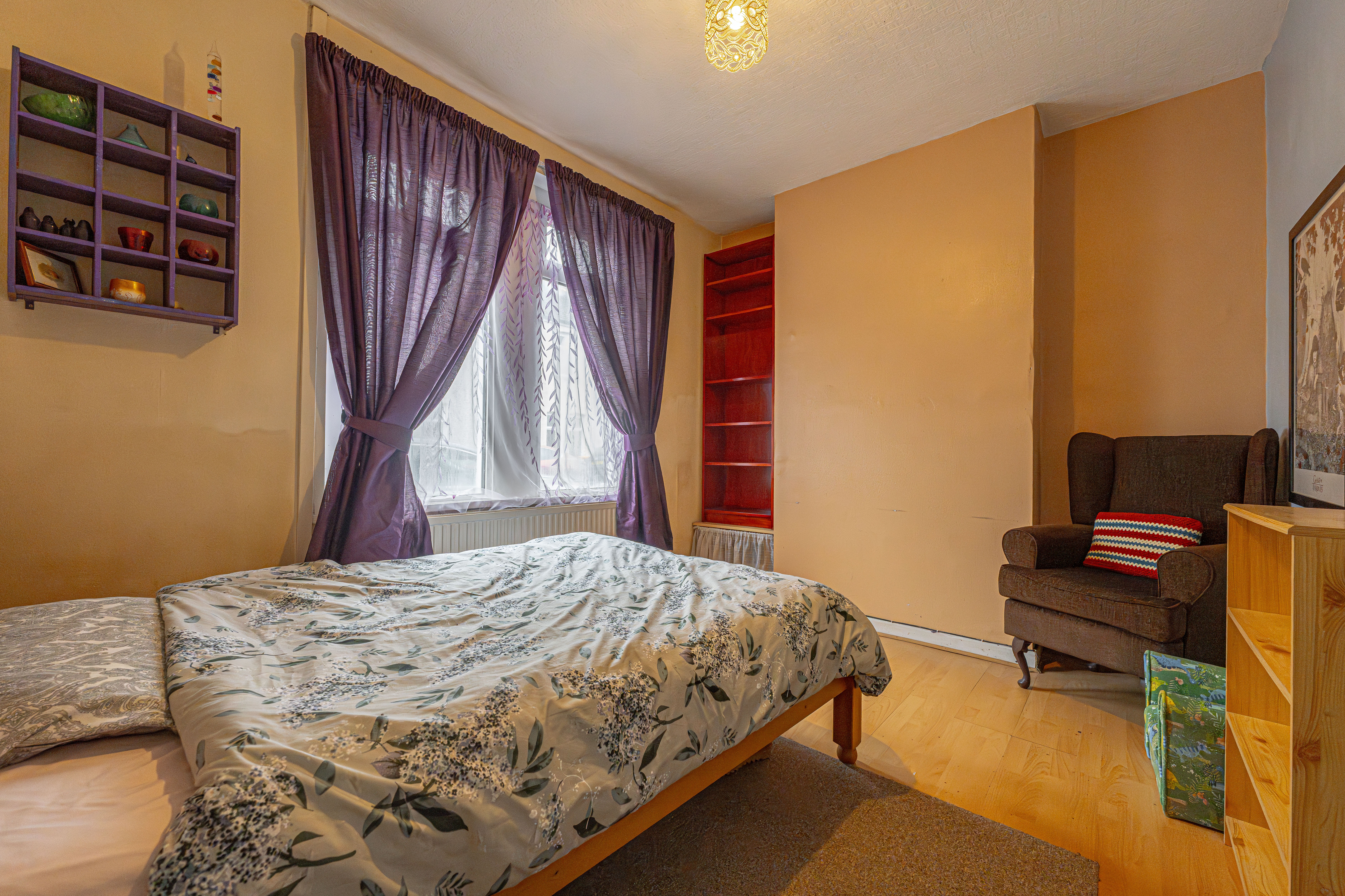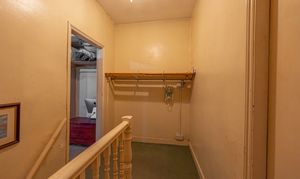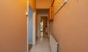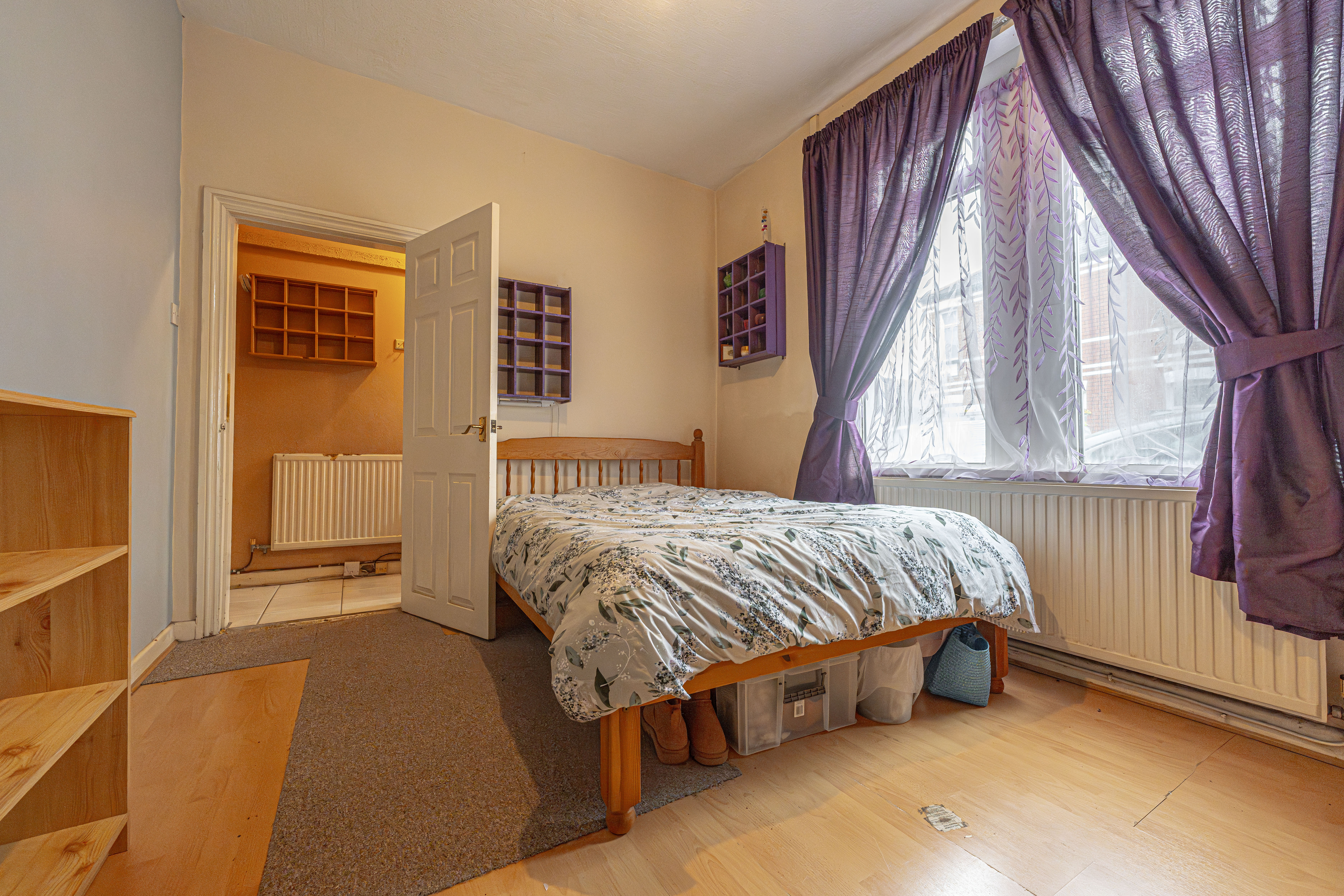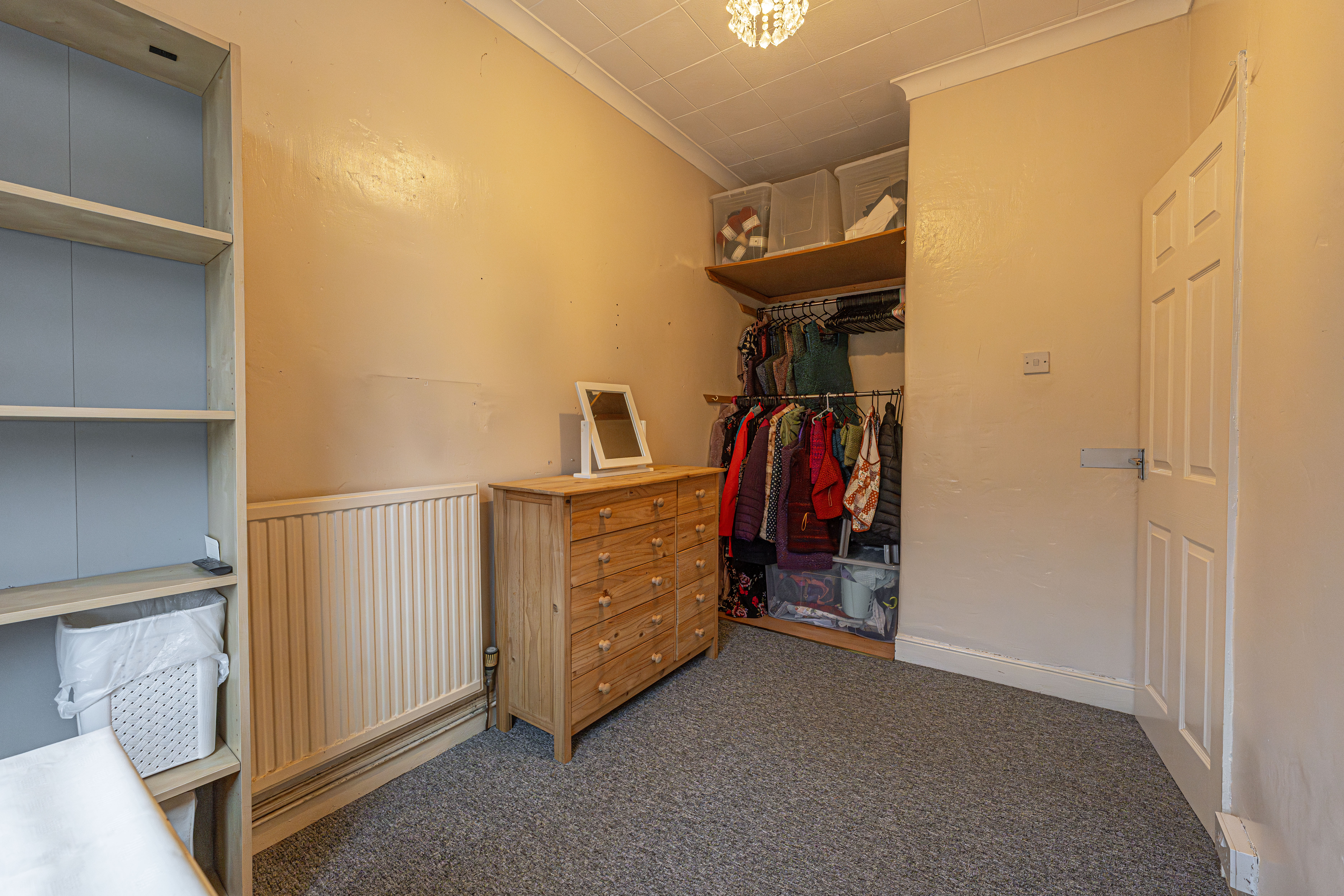 Ascending to the first floor we have the two bedrooms, which are both double in size. The primary bedroom is well lit by multi-aspect windows, and offers a great deal of space, with the secondary bedroom also offering great potential to double up as a home office and dressing room, thanks to the fitted shelving and clothes rails. From the hallway we can find additional storage space, as well as the family bathroom, featuring a bathtub, overhead shower, and a fitted airing cupboard housing the newly installed boiler.