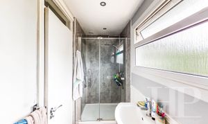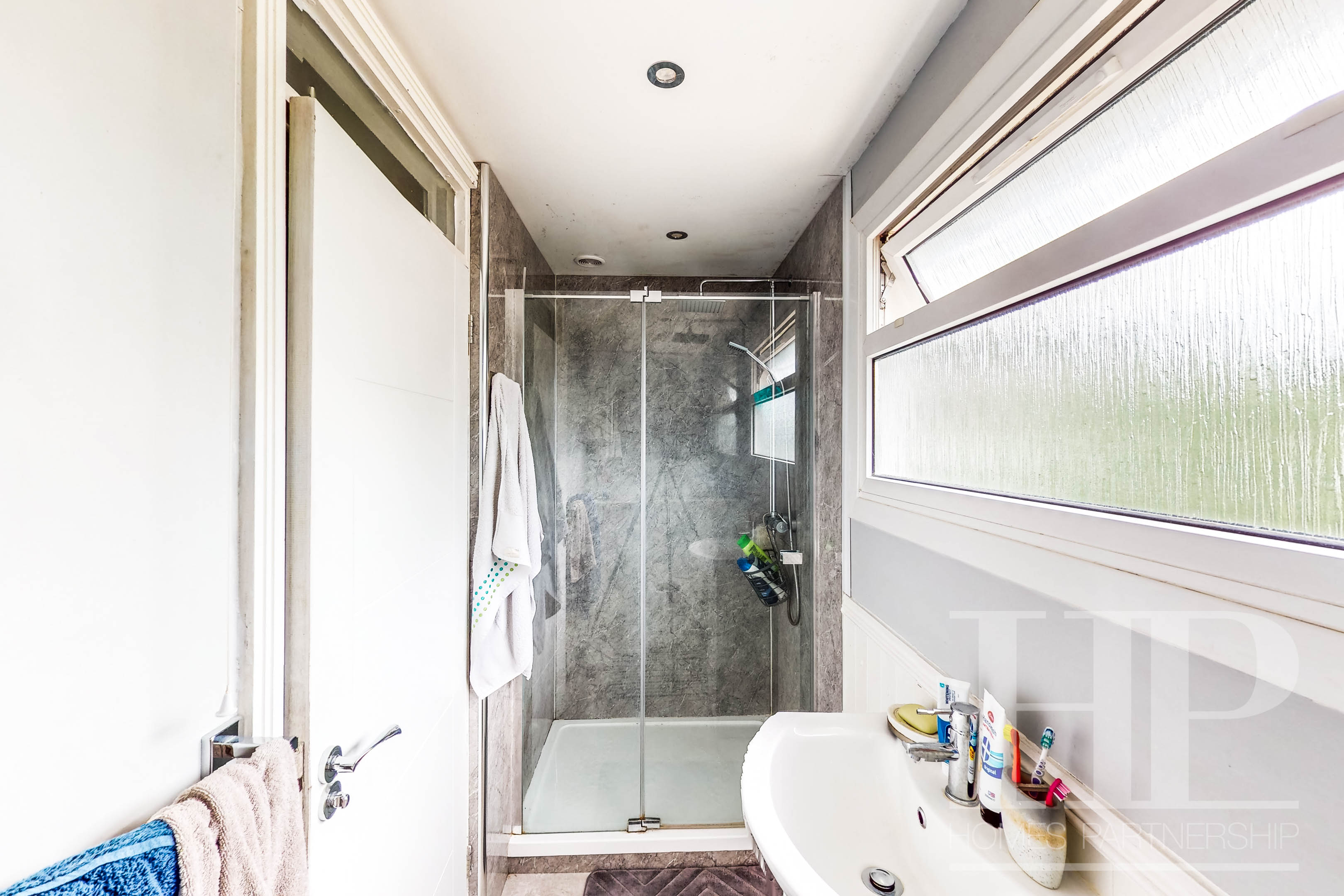 White suite comprising wash basin, toilet and walk in shower. Window to the rear.