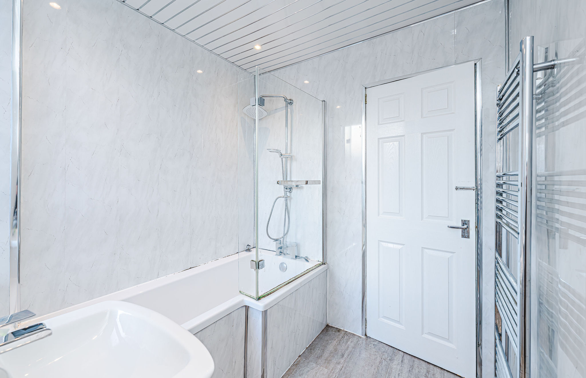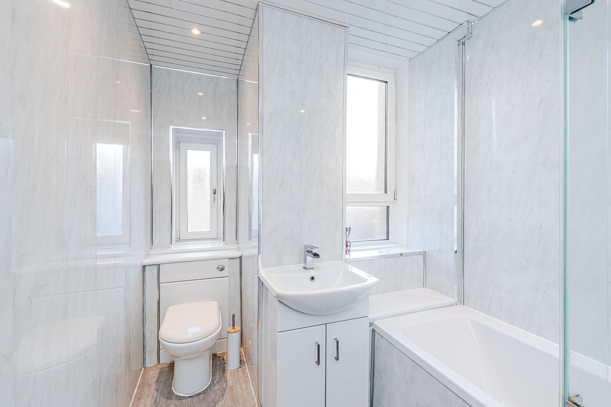 Stylish newly fitted 3-piece family bathroom featuring a spacious bathtub with overhead shower, sleek wash hand basin, and modern W.C.