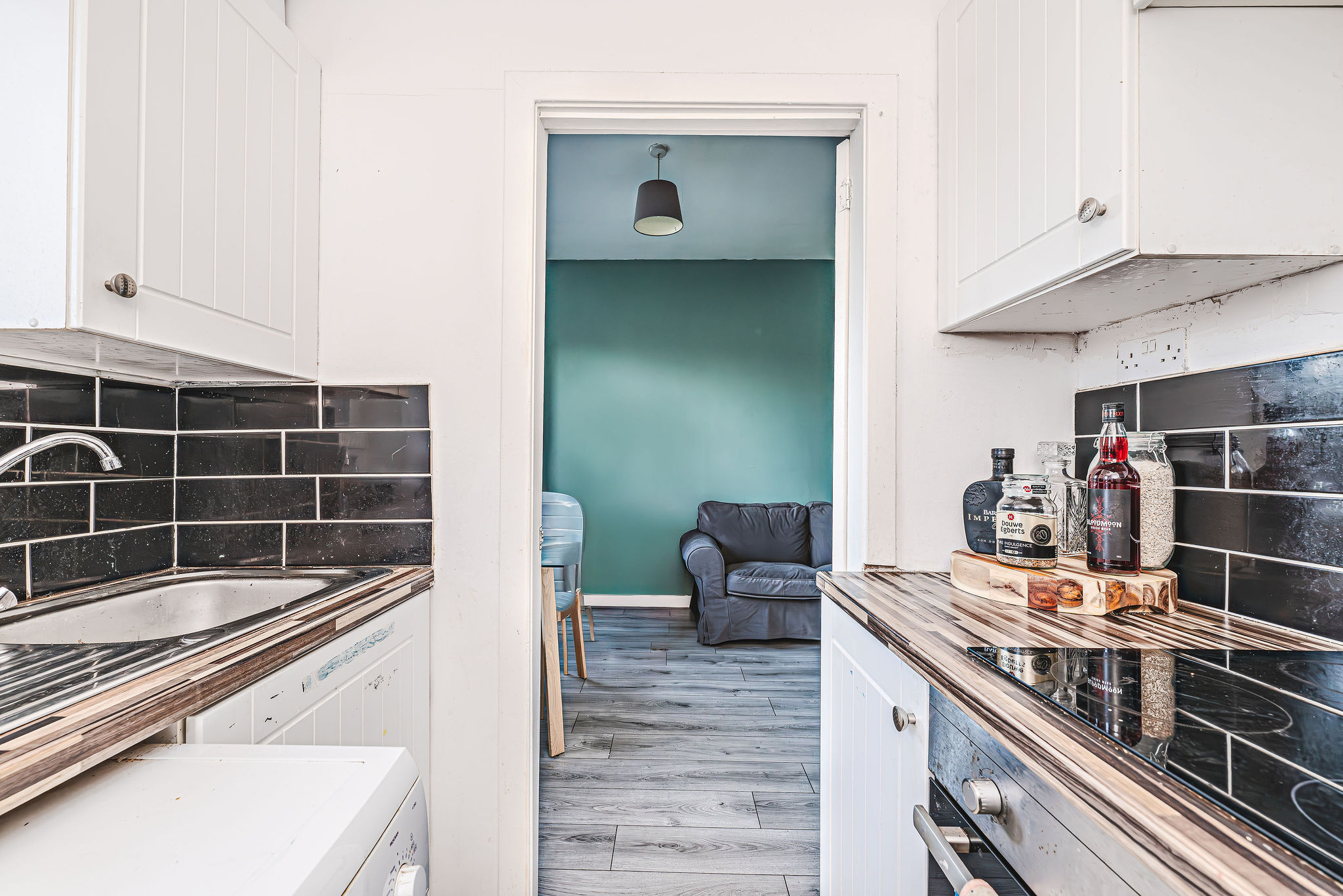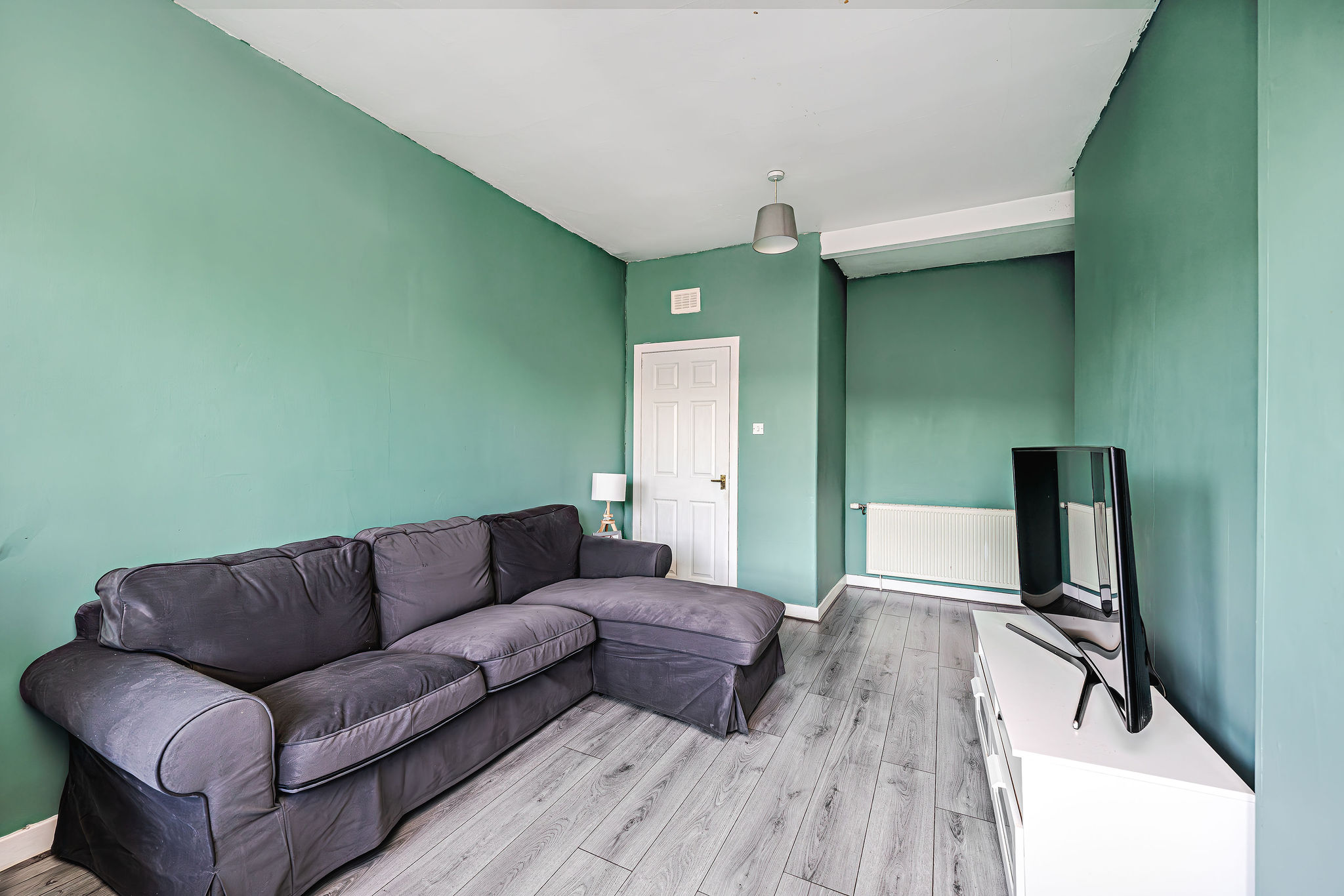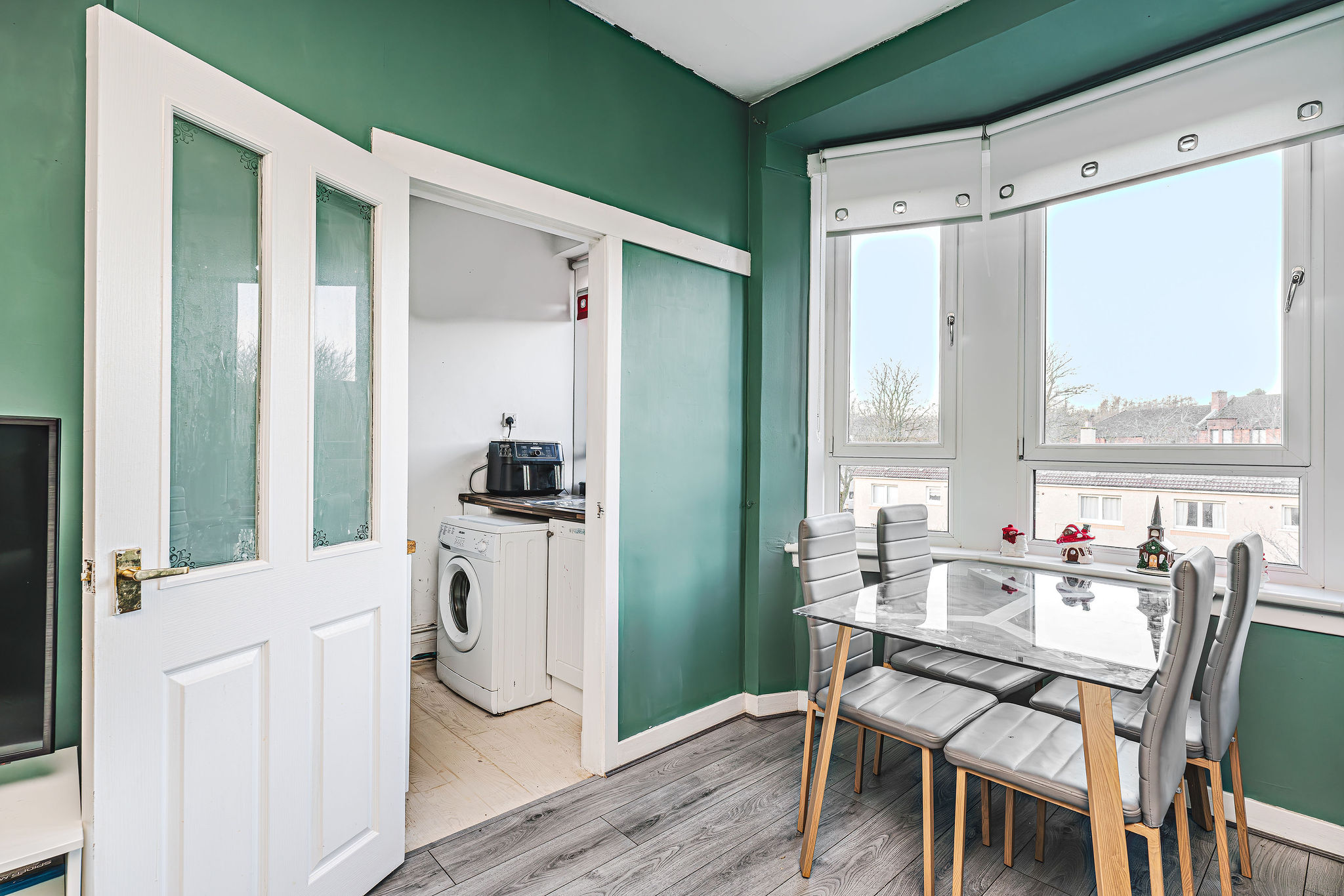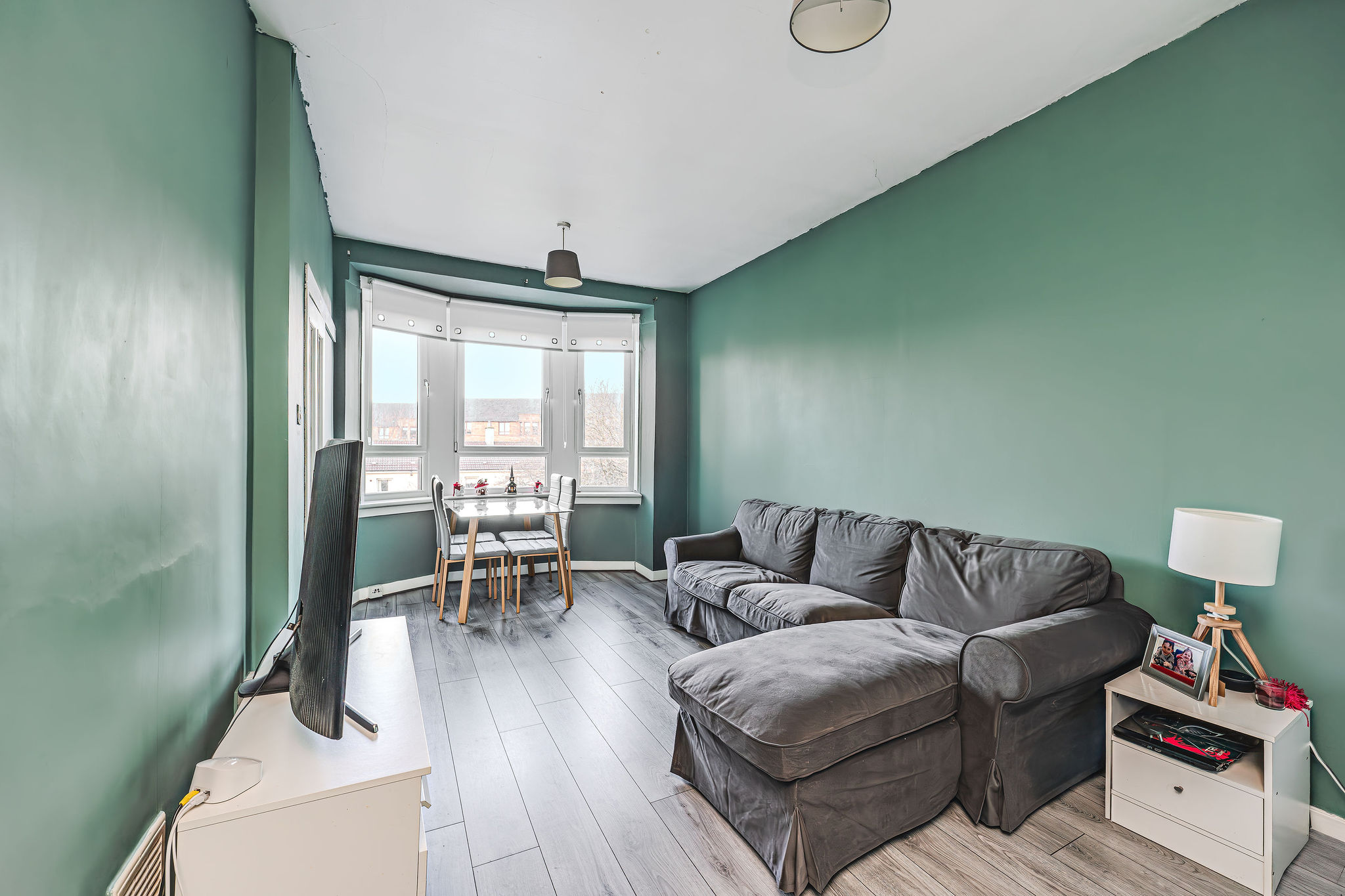 Spacious lounge/diner with a stunning feature bay window, sleek laminate flooring, high ceilings, a large storage cupboard, and seamless access to the kitchen – perfect for stylish living and entertaining.