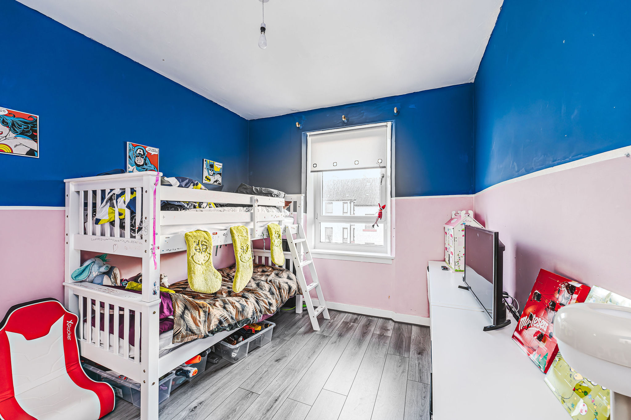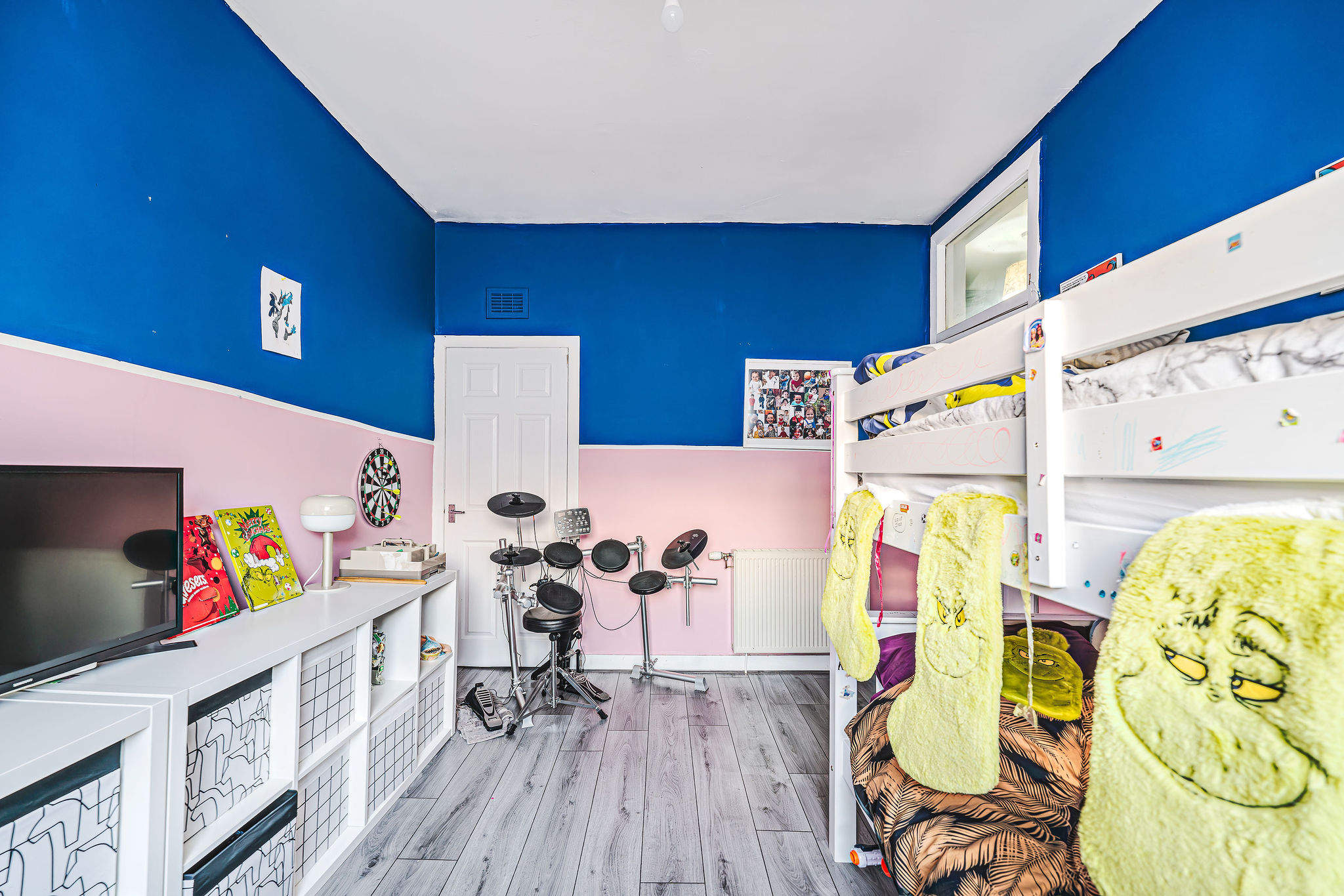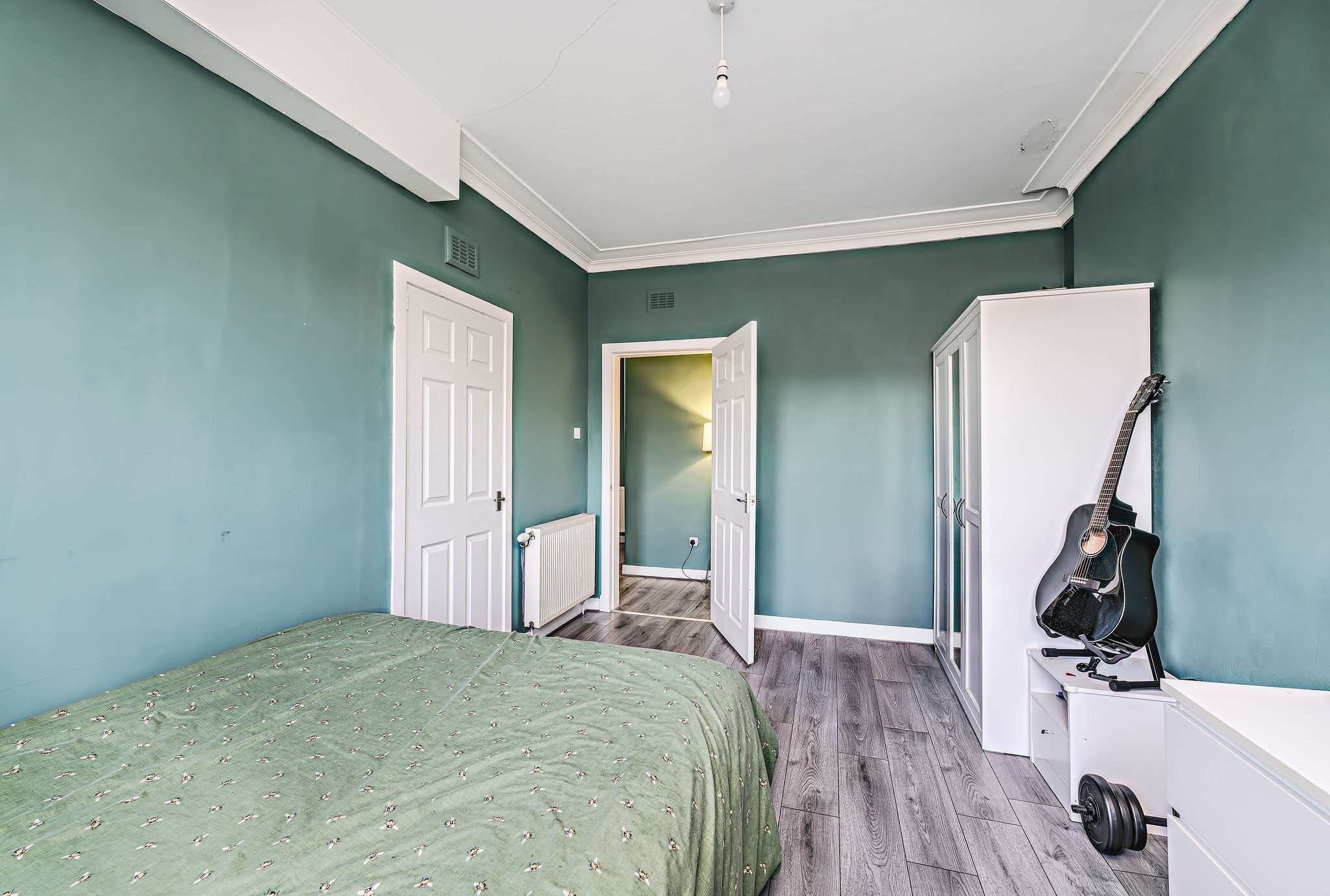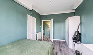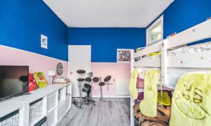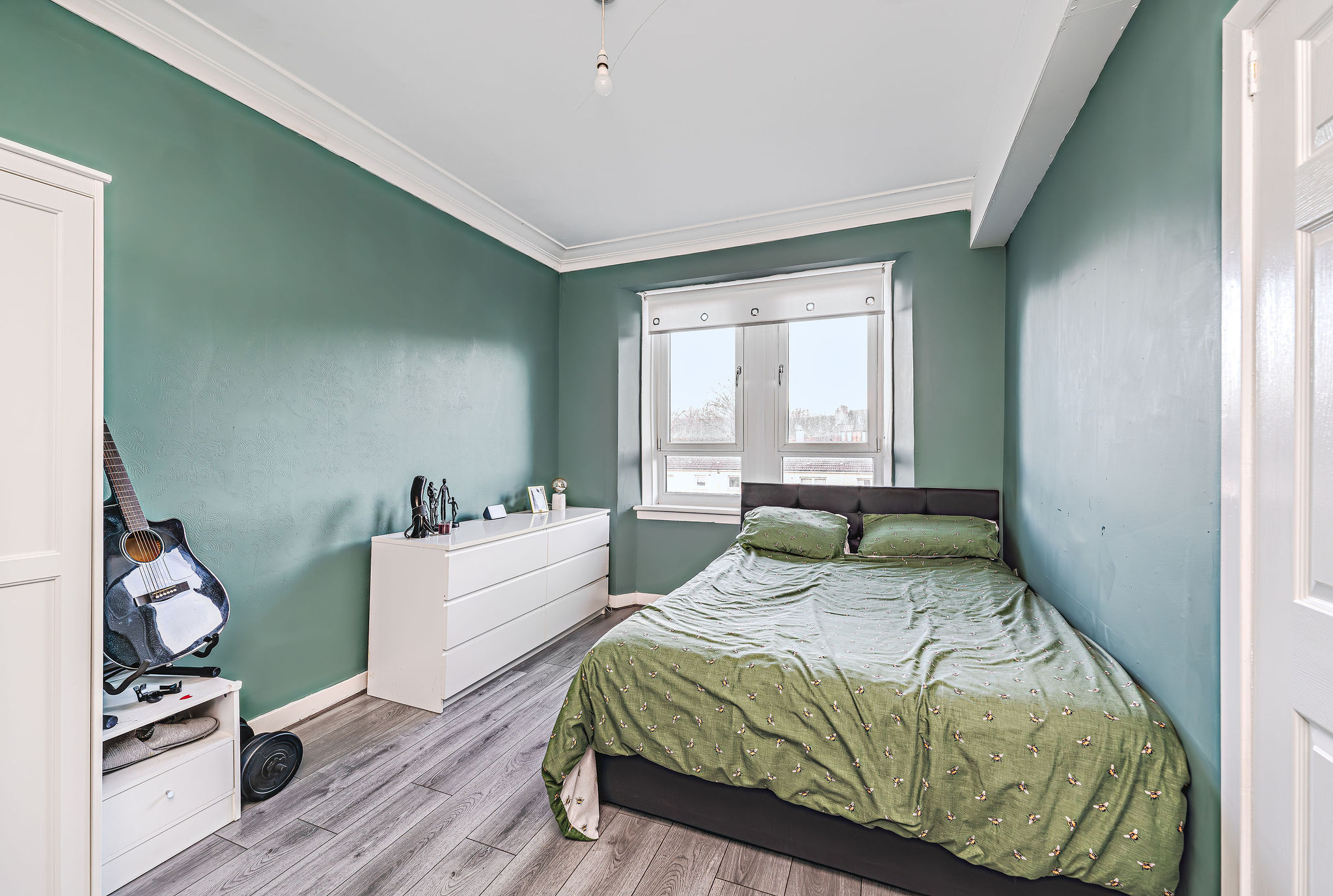 Spacious rear-facing double bedroom with serene views, bold modern décor, and ample built-in storage.