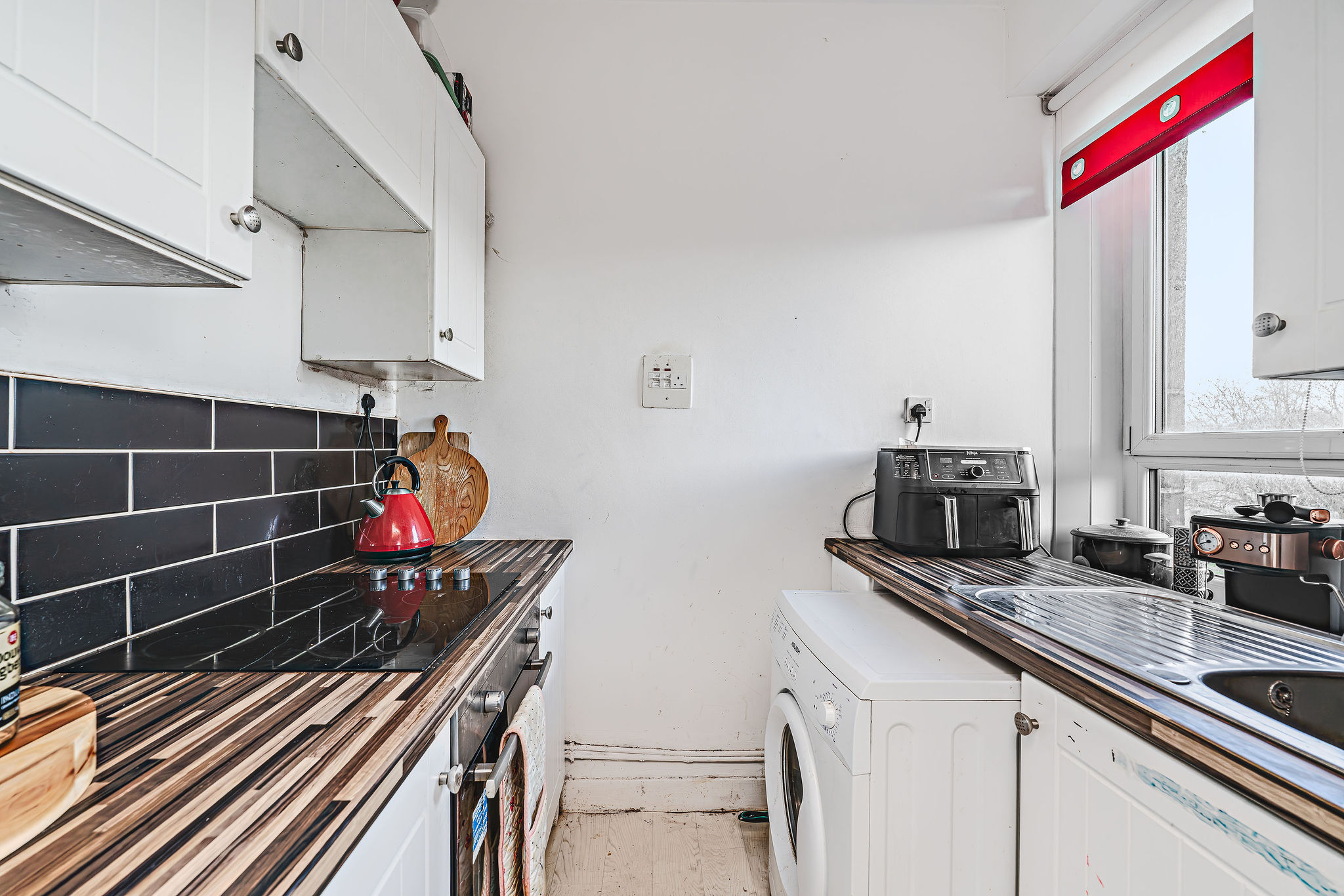 Sleek modern kitchen with high-gloss white units, integrated appliances, a large window for abundant natural light, and stylish natural flooring.