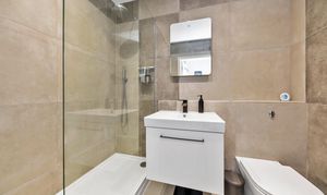 Through to the sleeping quarters, this modern home continues to offer impressive accommodation, with 1 generous double bedroom with double French doors and a Juliette balcony, and a bathroom comprising a shower, a WC, a hand wash basin and a heated towel rail.