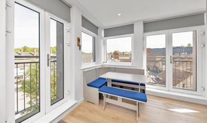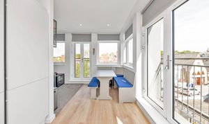 The kitchen/dining/living room is wonderfully open-plan, benefiting from multiple large windows and 2 sets of double French doors with Juliette balconies, making it a very bright space. It enjoys both carpets and wood flooring, inset lighting, pleasant decor, and ample space for a variety of lounge, dining and storage furniture. In the kitchen area, there is a range of modern base and wall units, composite worktops, wood flooring, inset and under-cabinet lighting, an integrated oven, hob, extractor fan, dishwasher and fridge/freezer, and space for smaller kitchen appliances.