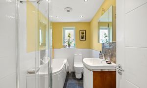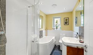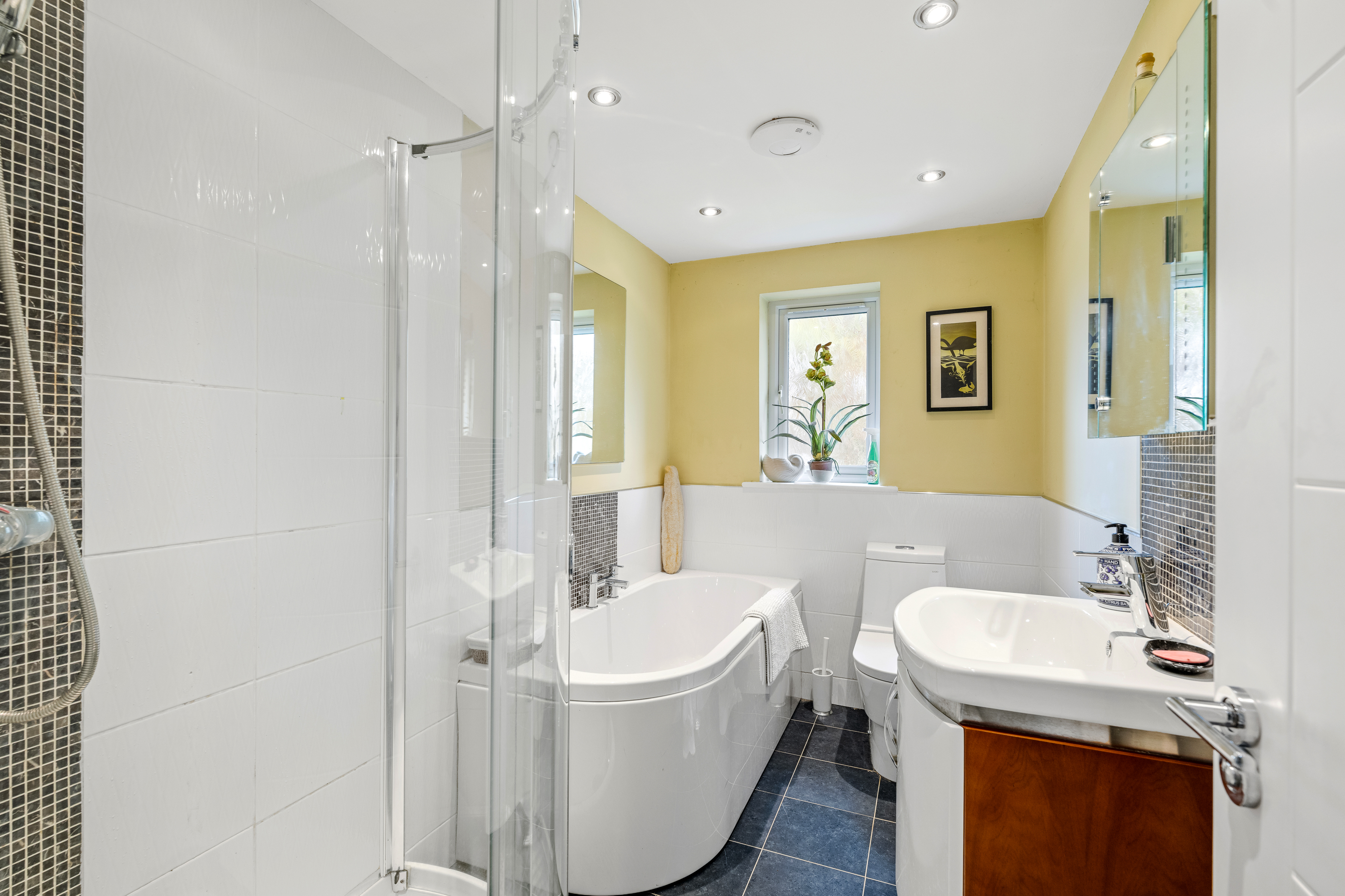 The top floor hosts two generous double bedrooms, including a master bedroom with its own dressing room, and a well-appointed family bathroom featuring a four-piece suite with corner shower, bathtub, toilet, and basin.