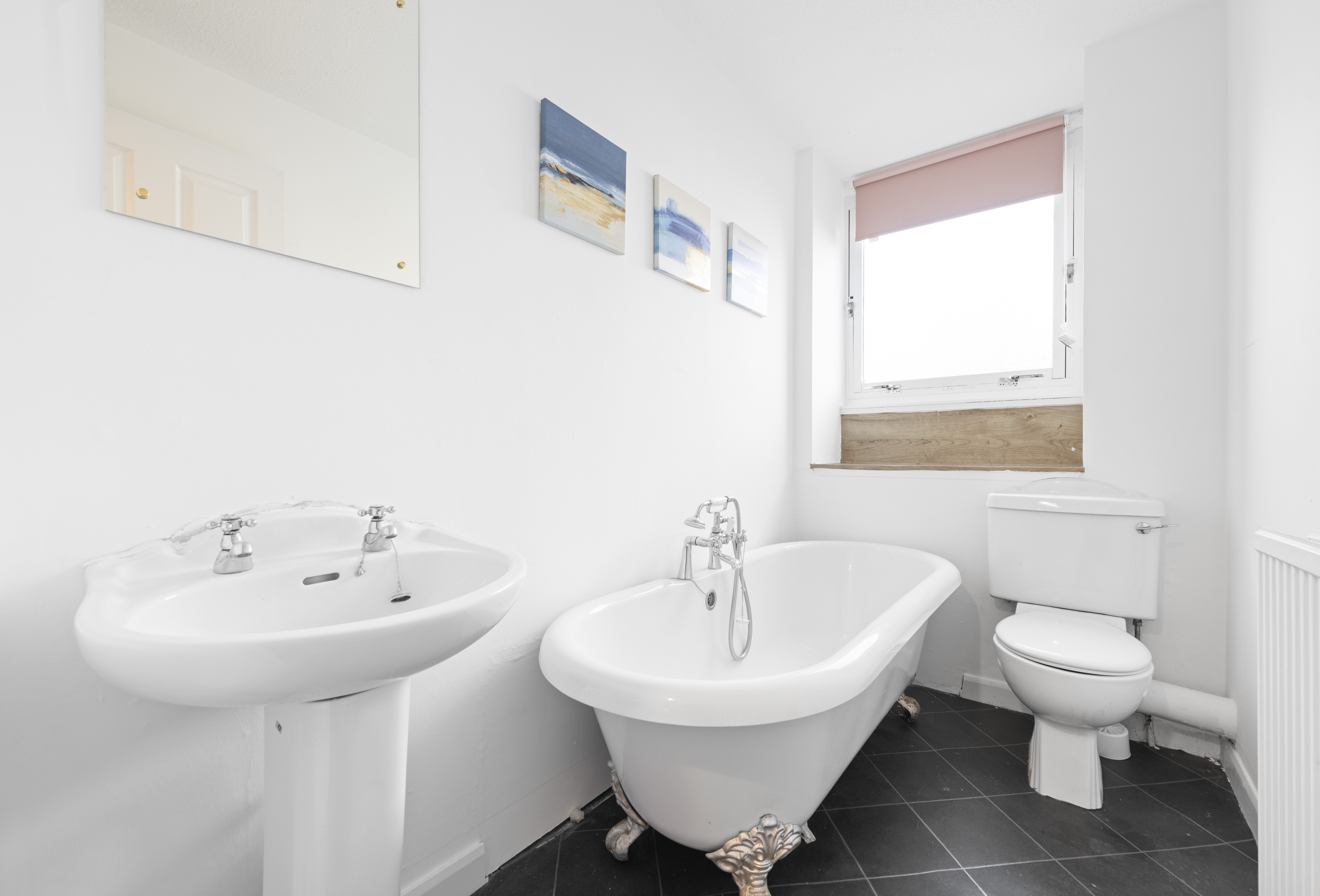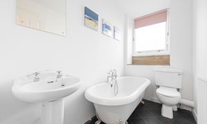 Fitted with low flush WC, pedestal wash hand basin and roll top bath with telephone style mixer tap shower attachment. Opaque glazed window with wide sill and roller blind. Radiator.