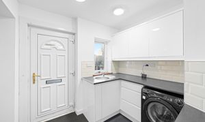 Spacious room with rear facing window and roller blind. Two cupboards, one housing combi gas central heating boiler and one ideal for housing fridge/freezer. Laminate flooring, two radiators. Opaque glazed door to hall.
